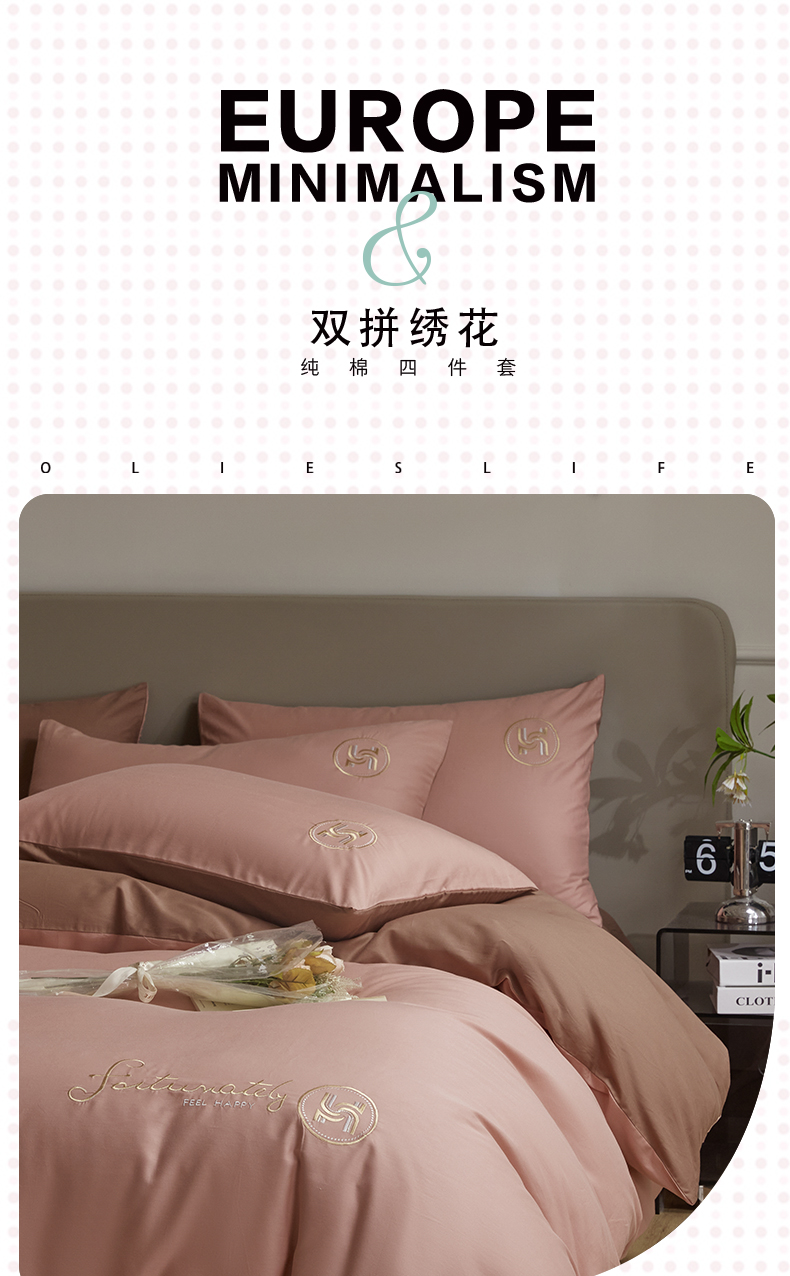 梵克保罗 2024新款全棉轻奢纯色双拼刺绣四件套 豆沙咖