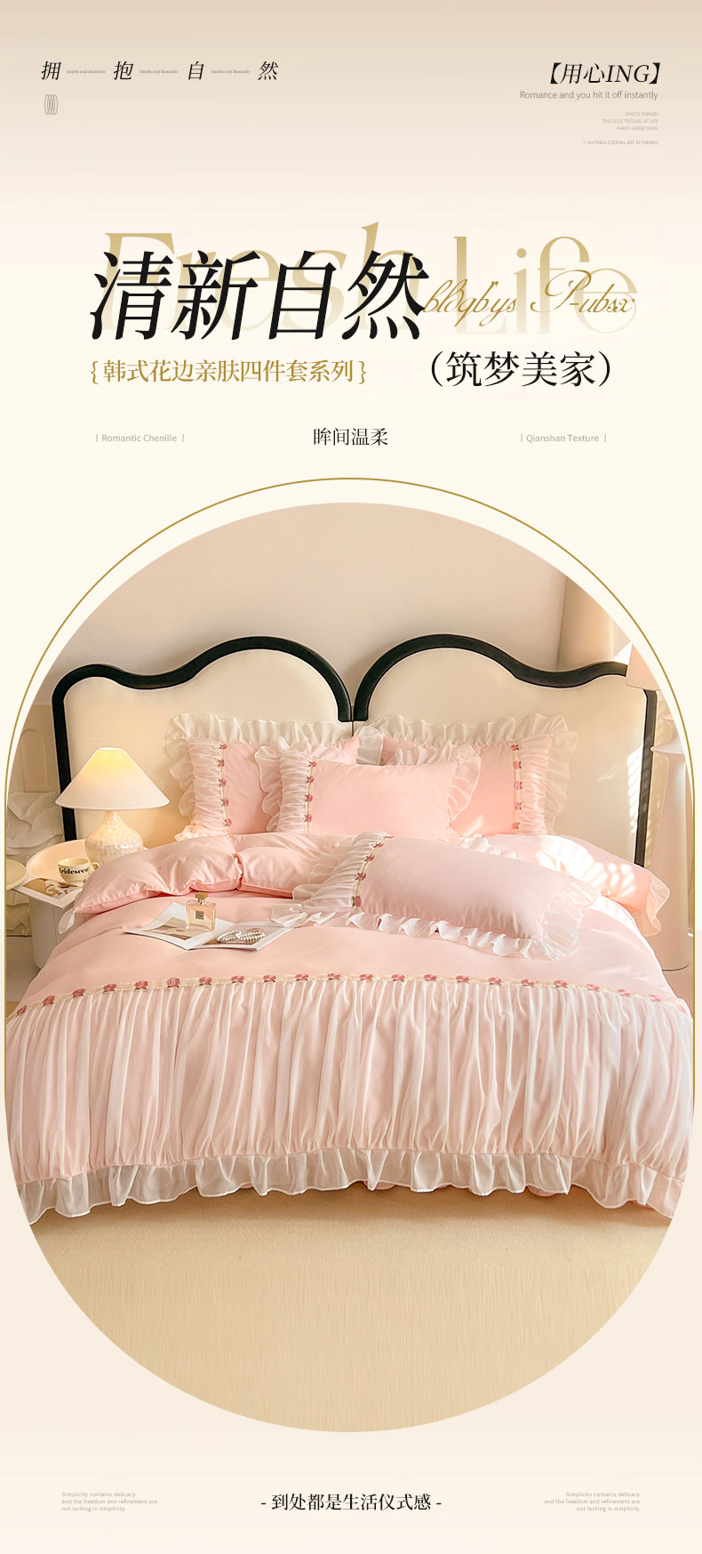 (总)芭比蔓 2024新款直播供货韩版花边款牛奶绒四件套,爱玛橙,宝石红,湖蓝,倾国粉,秋月黄,深灰,珍珠白,竹青绿
