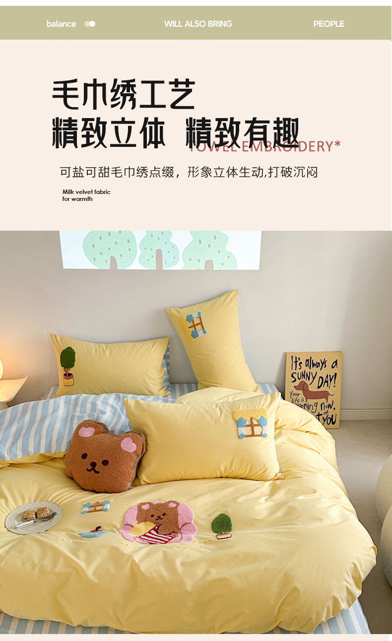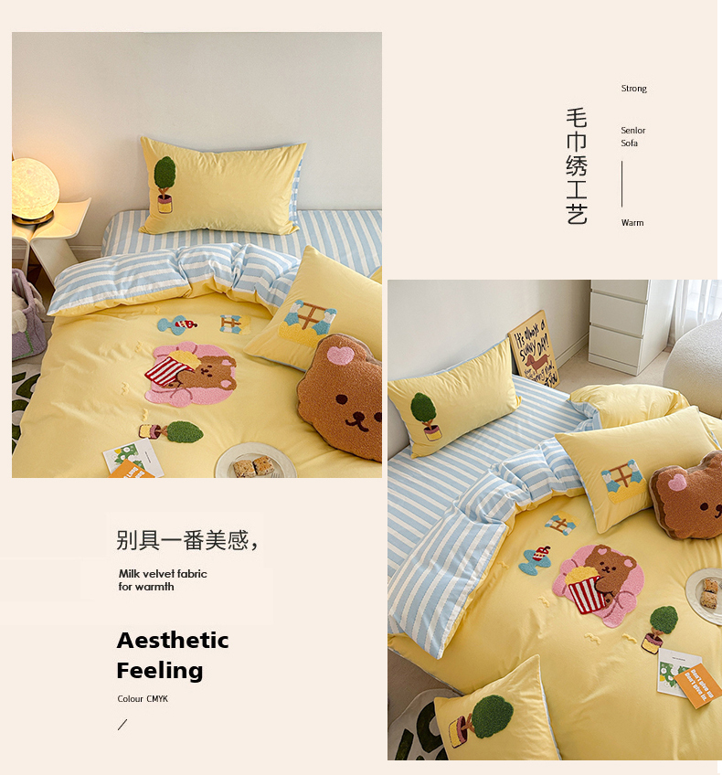 (总)眠屿家纺 2025新款加厚牛奶绒毛巾绣四件套,乐趣,面包狗,玩偶,玩泡泡
