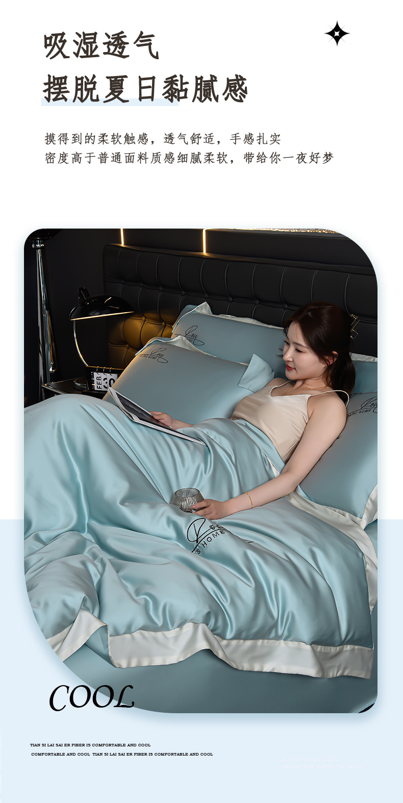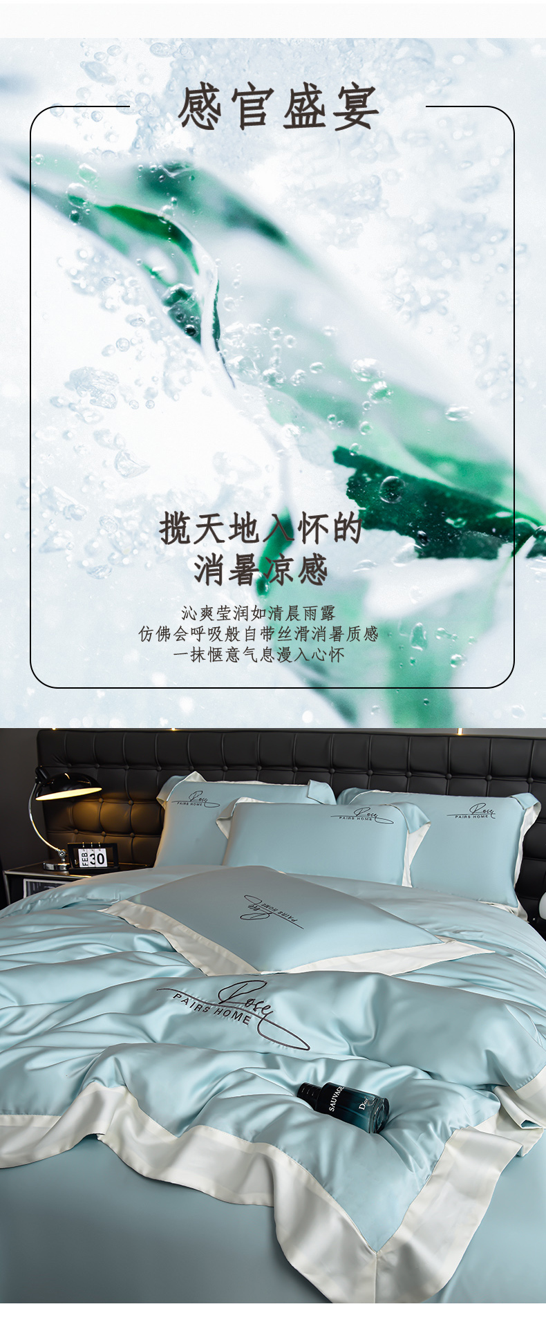 商品名称:瑞驰家纺2024新款60兰精天丝四件套-罗莎琳系列(风格二) 天水蓝