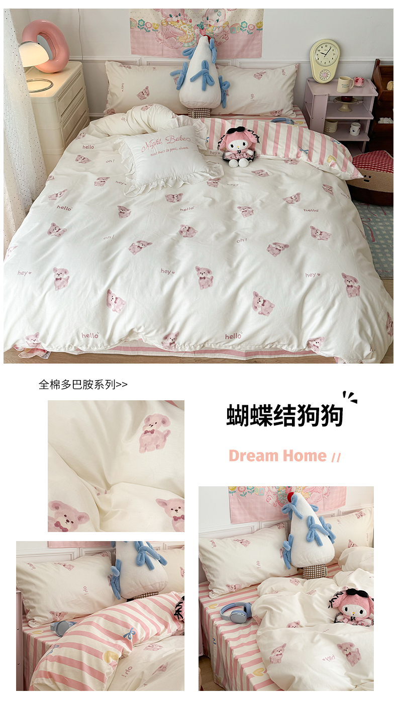 商品名称:昔可 2024新款全棉多巴胺卡通轻柔四件套系列 蝴蝶结狗狗