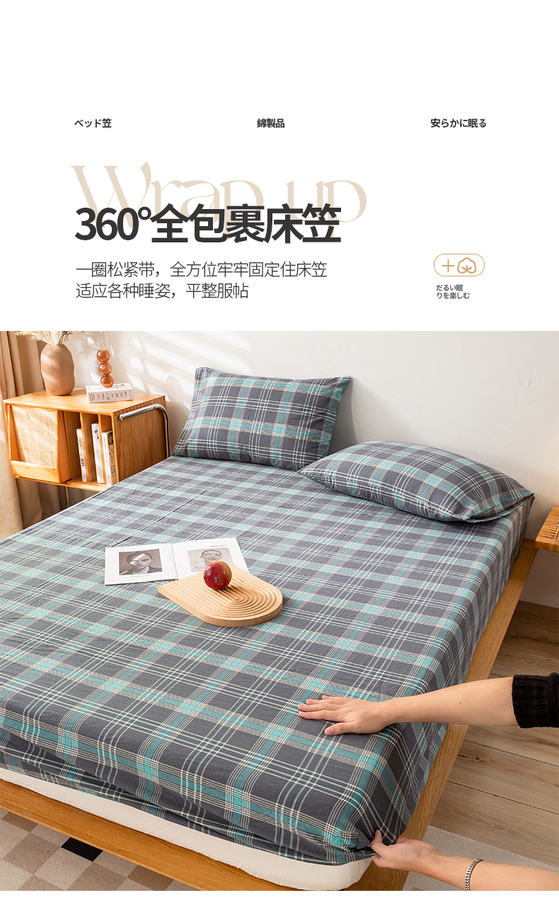 萌飞 2024新款A类色织水洗棉床笠 灰绿格