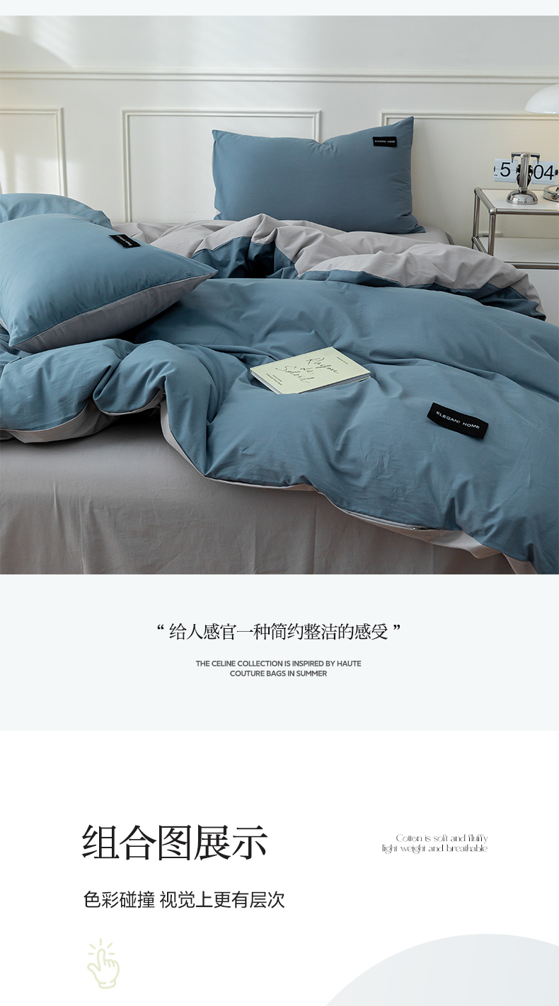 九沐良品 新款纯色双拼四件套 简悠-宾利蓝-浅灰