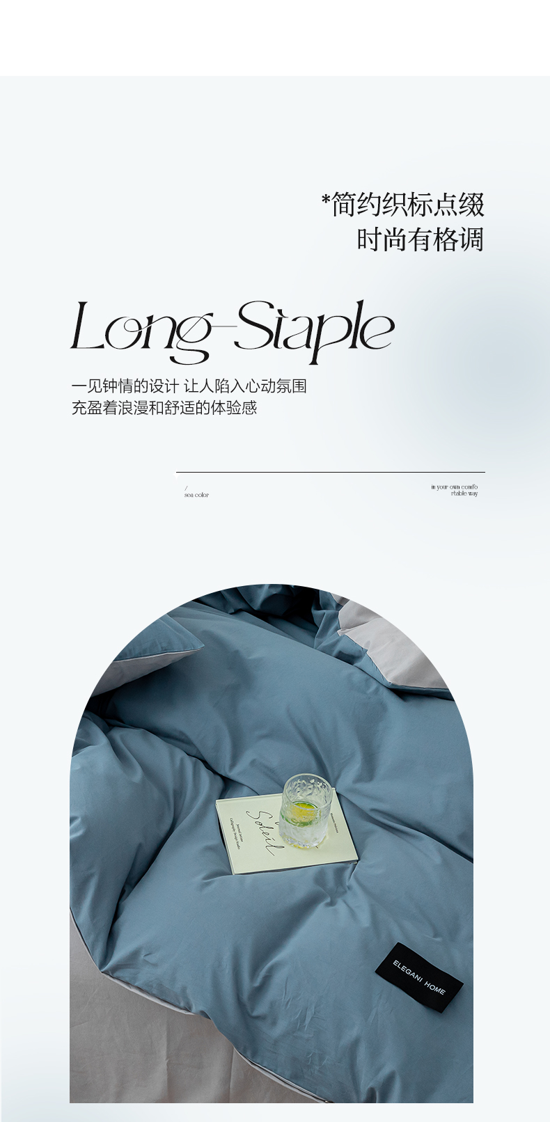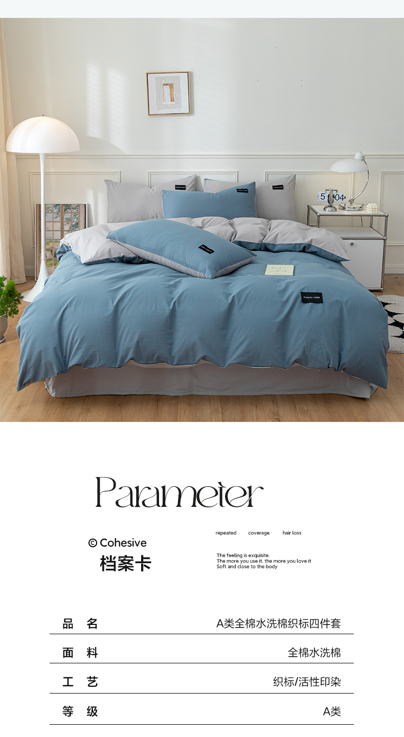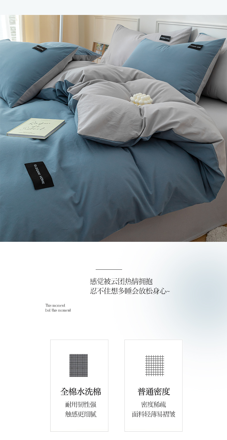 商品名称:九沐良品 新款纯色双拼四件套 简悠-宾利蓝-浅灰