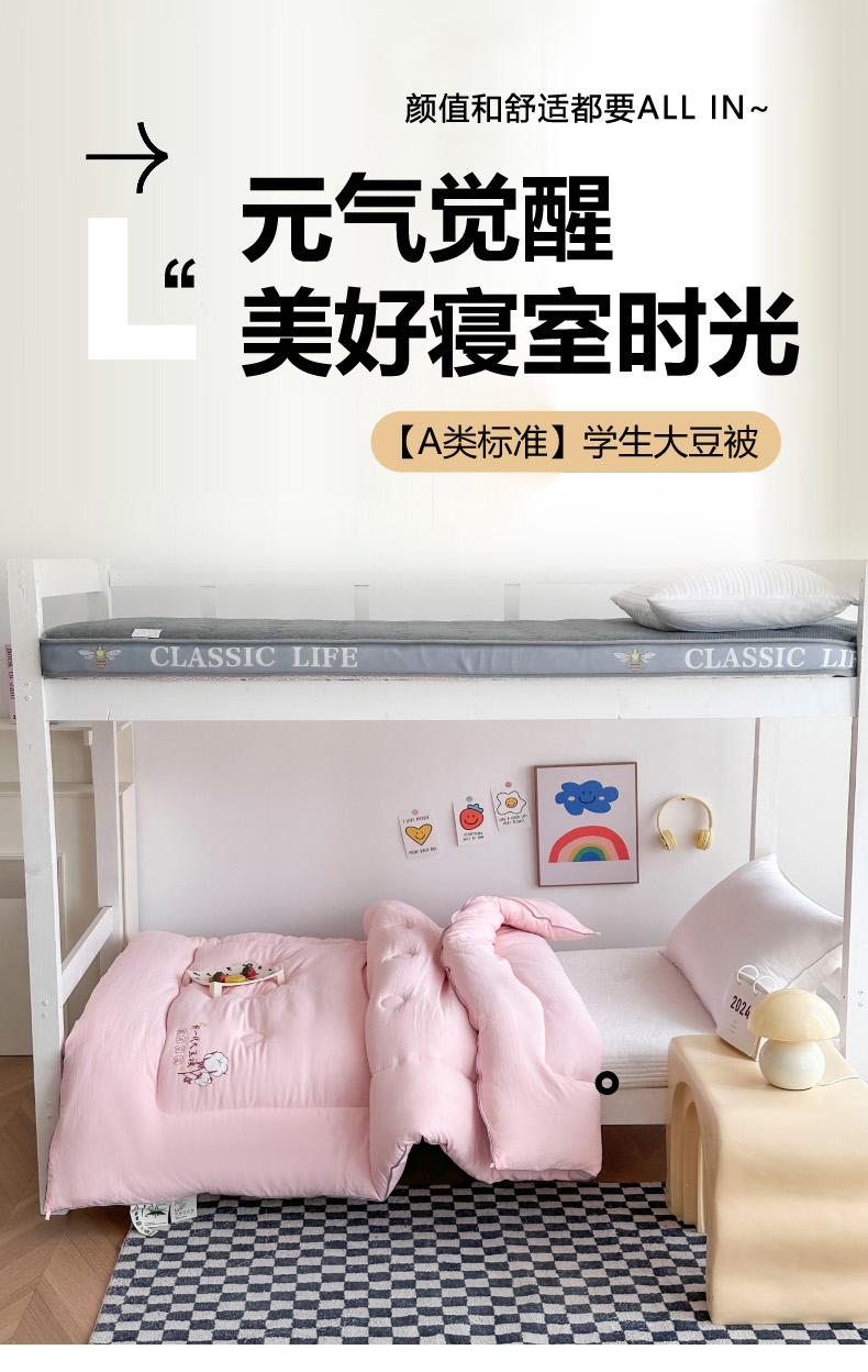 (总)招财狼家纺 2025新款学生大礼包三件套被子床垫枕芯,白色,灰色