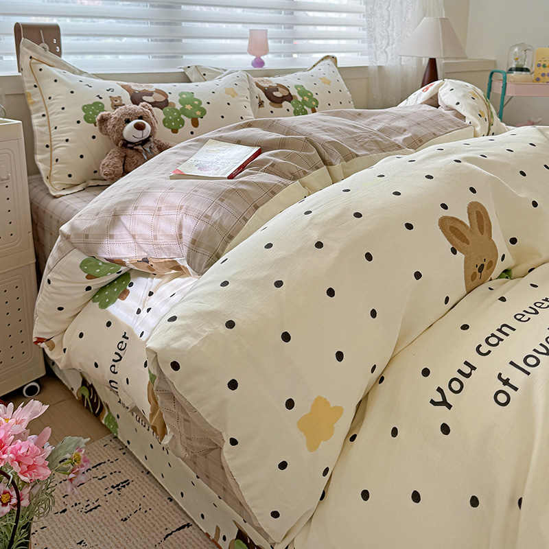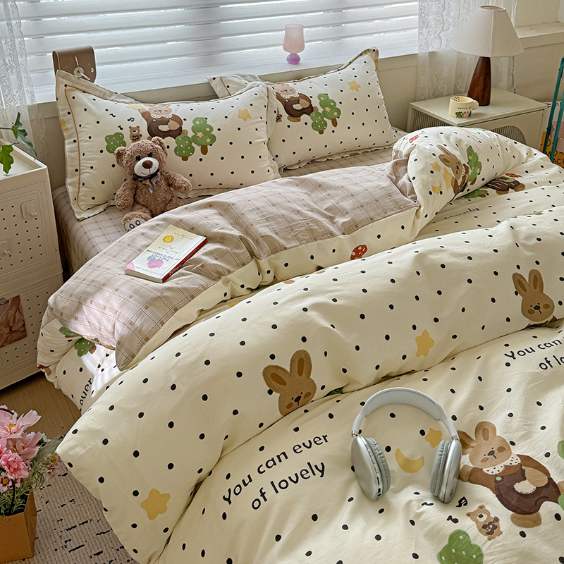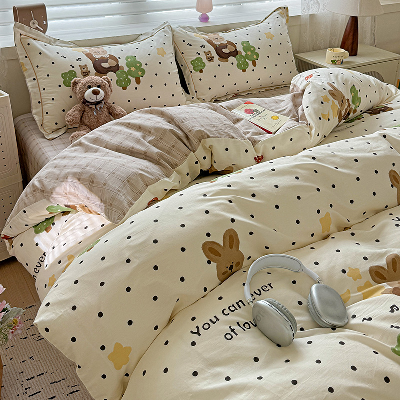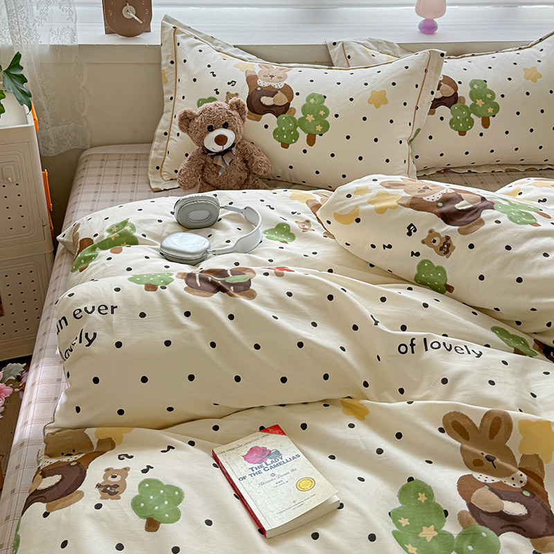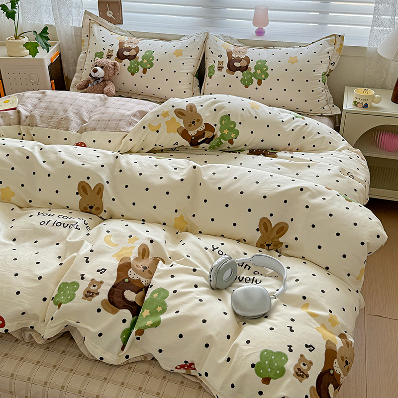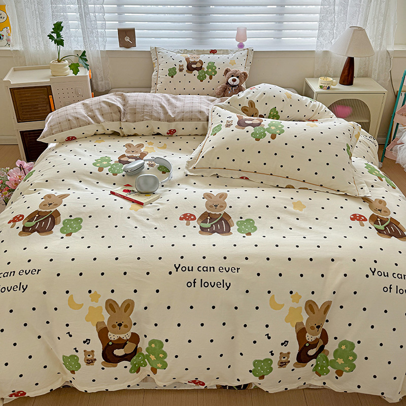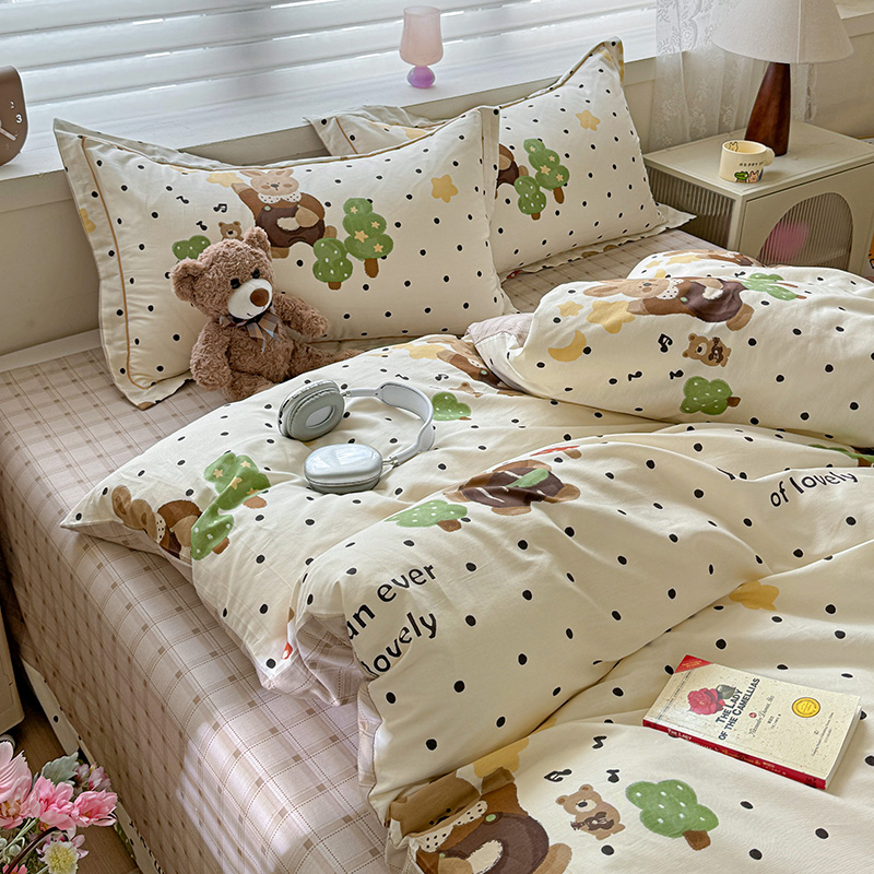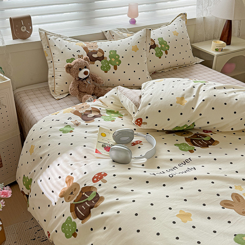 乐童 2024新款直播爆款13070纯棉印花吊边款一字绣四件套第八波波点学院熊