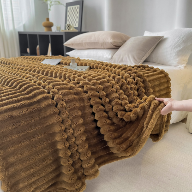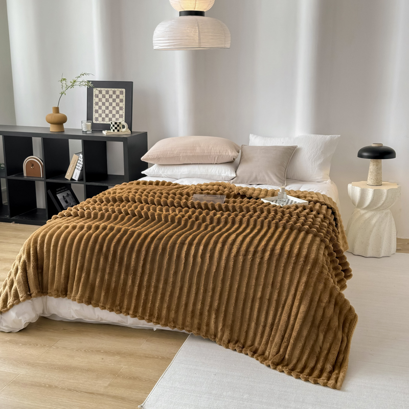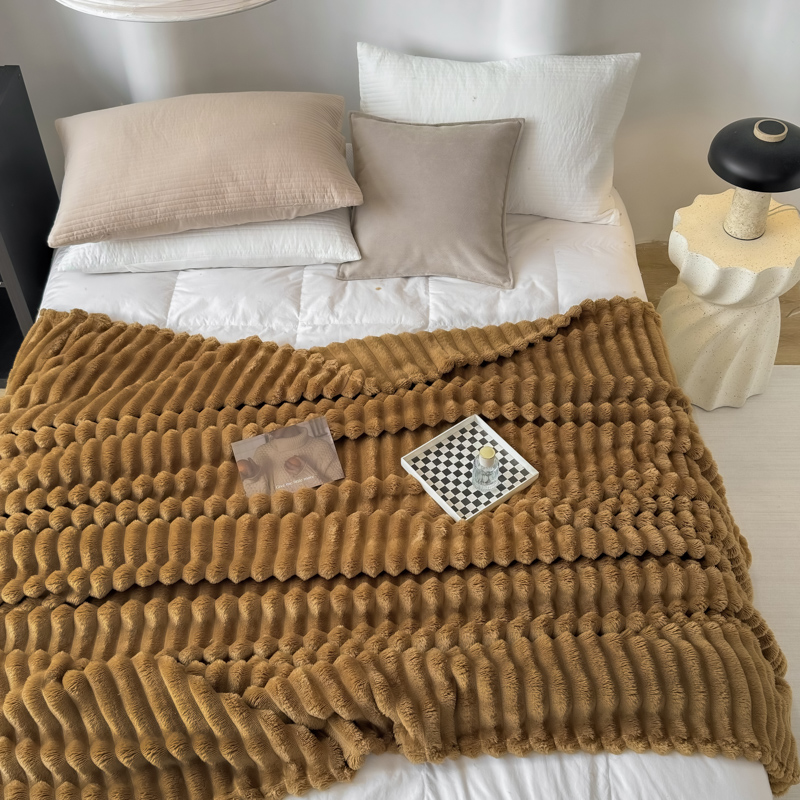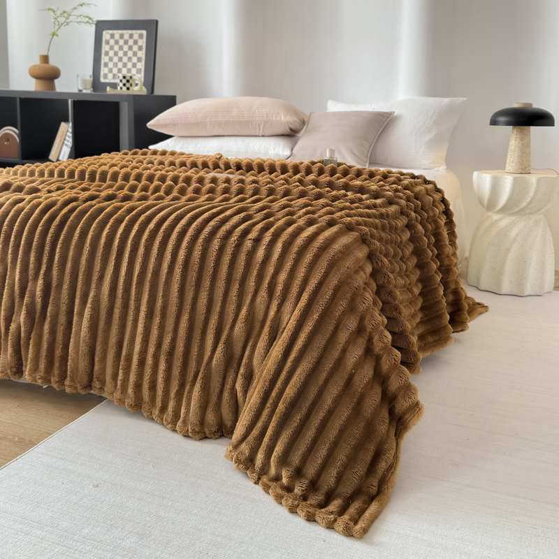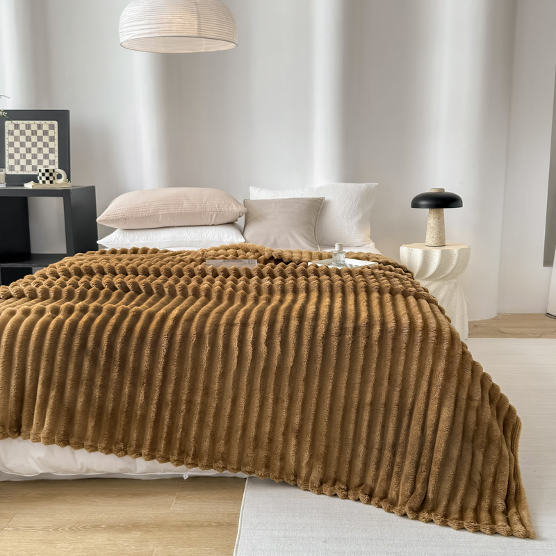 羋多 2024新款跨境仿兔毛绒多功能毛毯高克重魔法绒4公分宽抽条毛毯 光泽咖