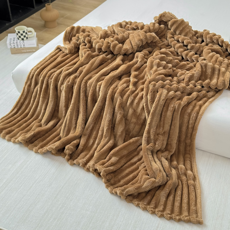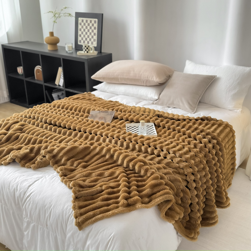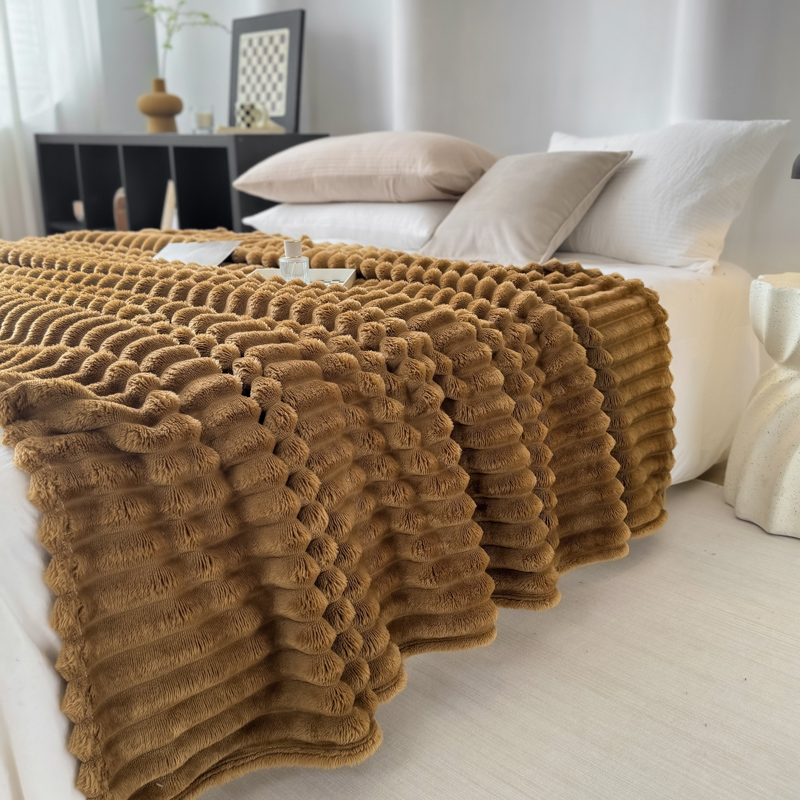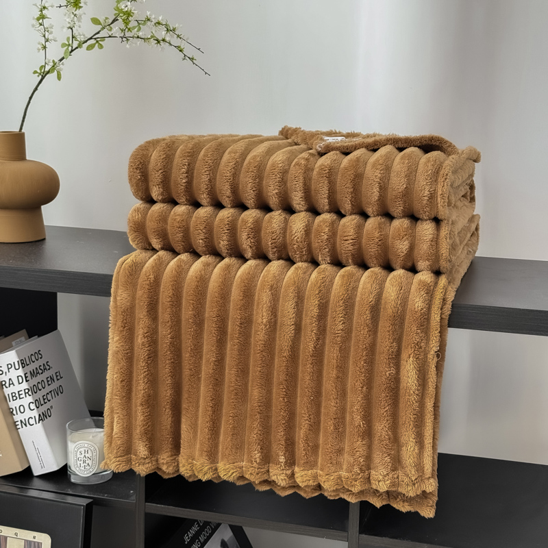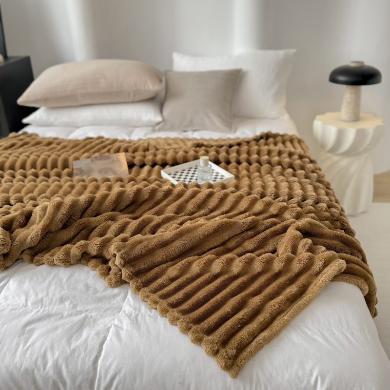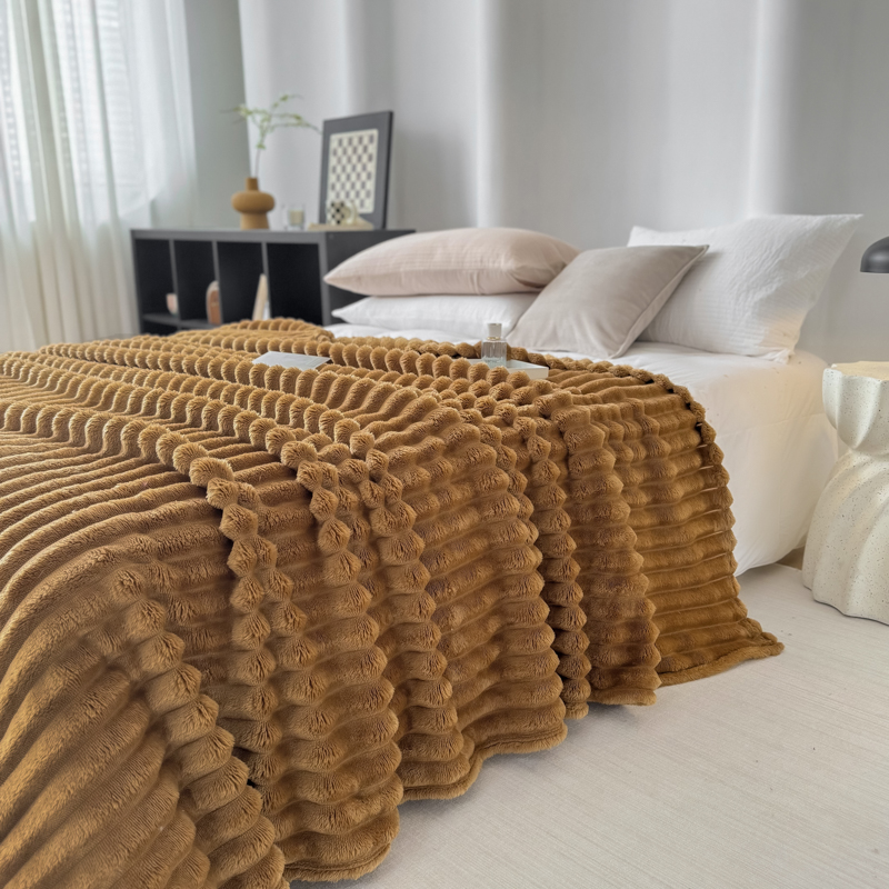 羋多 2024新款跨境仿兔毛绒多功能毛毯高克重魔法绒4公分宽抽条毛毯 光泽咖