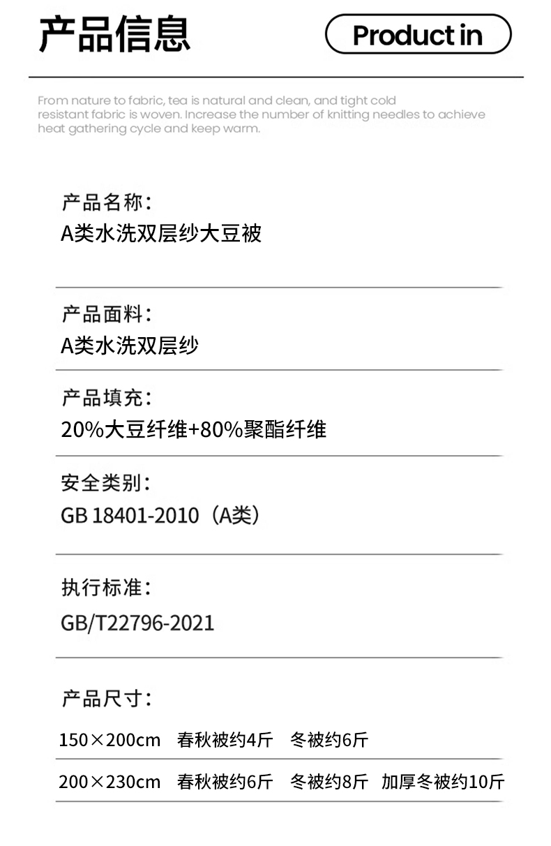 填充纤维种类: 大豆蛋白改性聚酯纤维