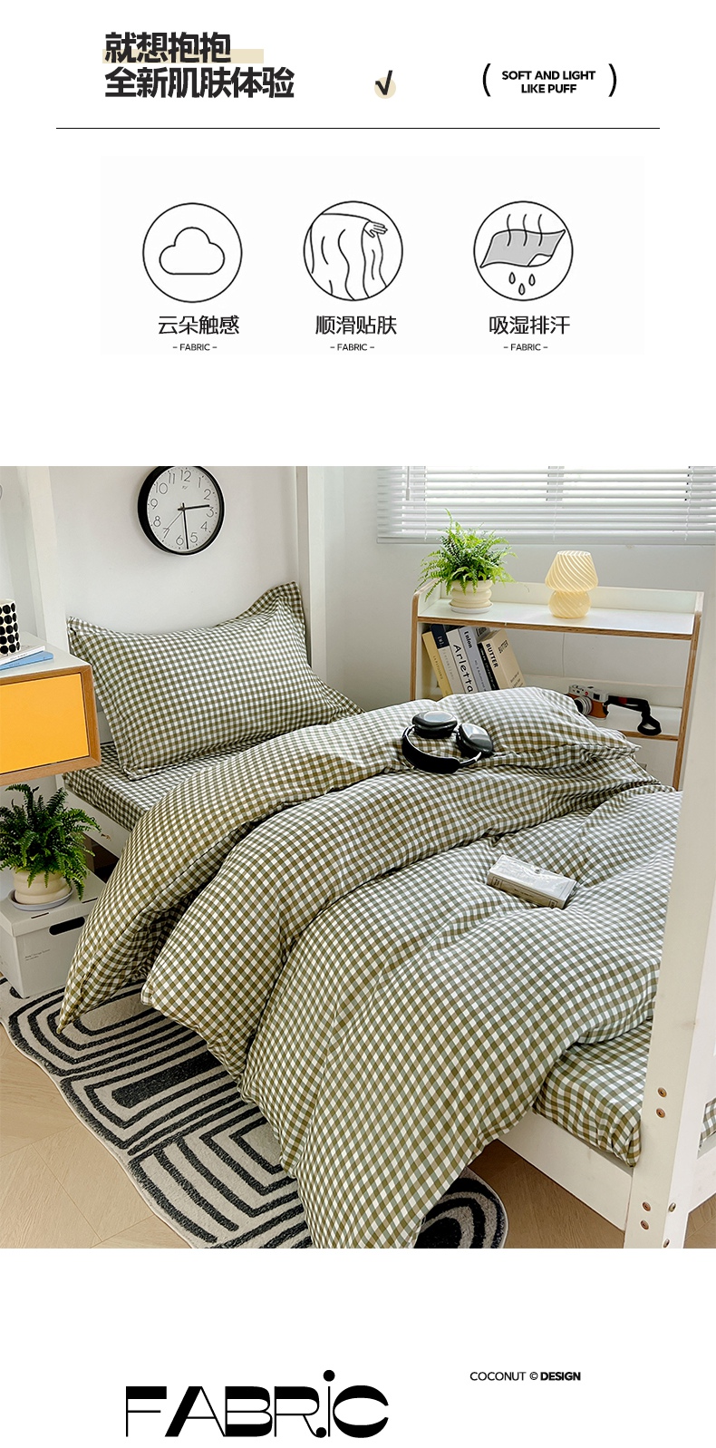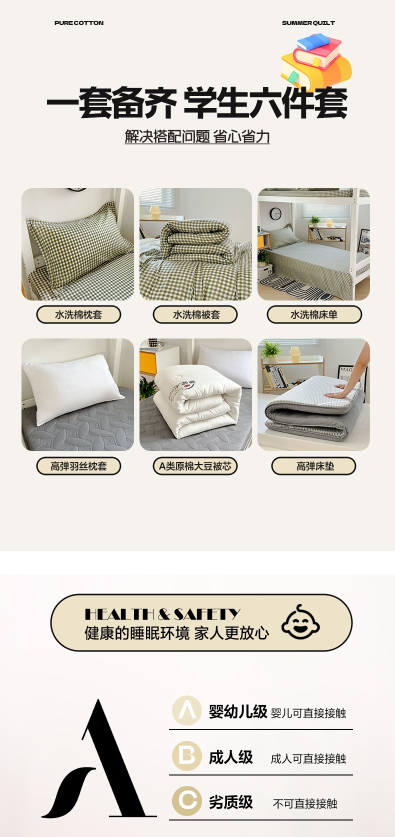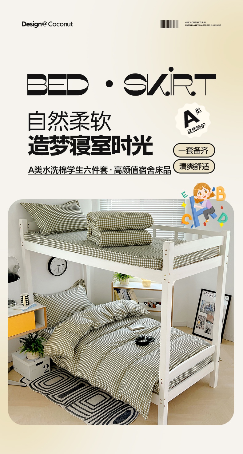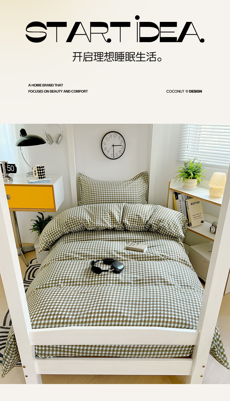 (总)梓瑄家居 2024新款A类开学季水洗棉学生宿舍六件套,草绿小格,灰小格,咖小格,蓝小格