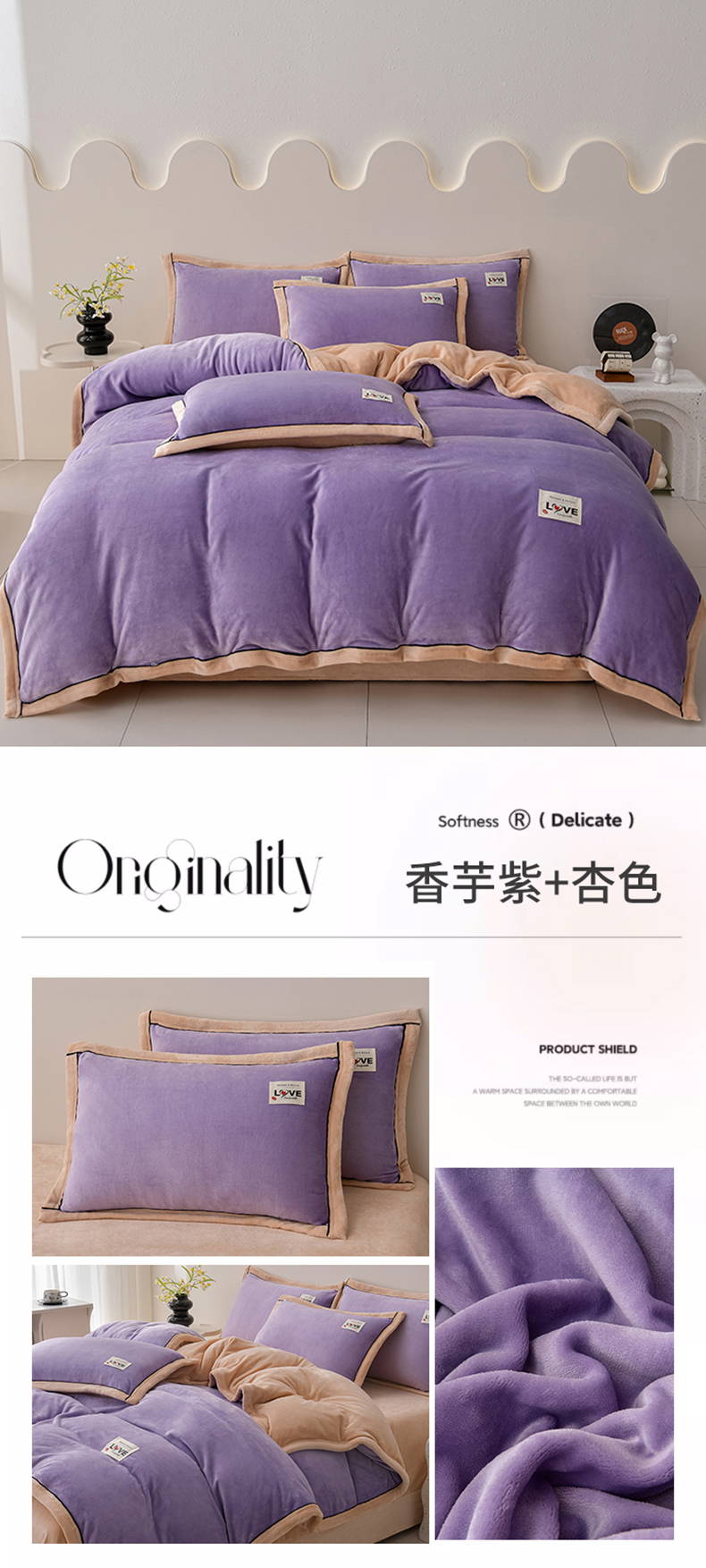 商品名称:妮恒美家纺 2024新款高克重纯色牛奶绒宽边工艺款四件套 香芋紫+杏色