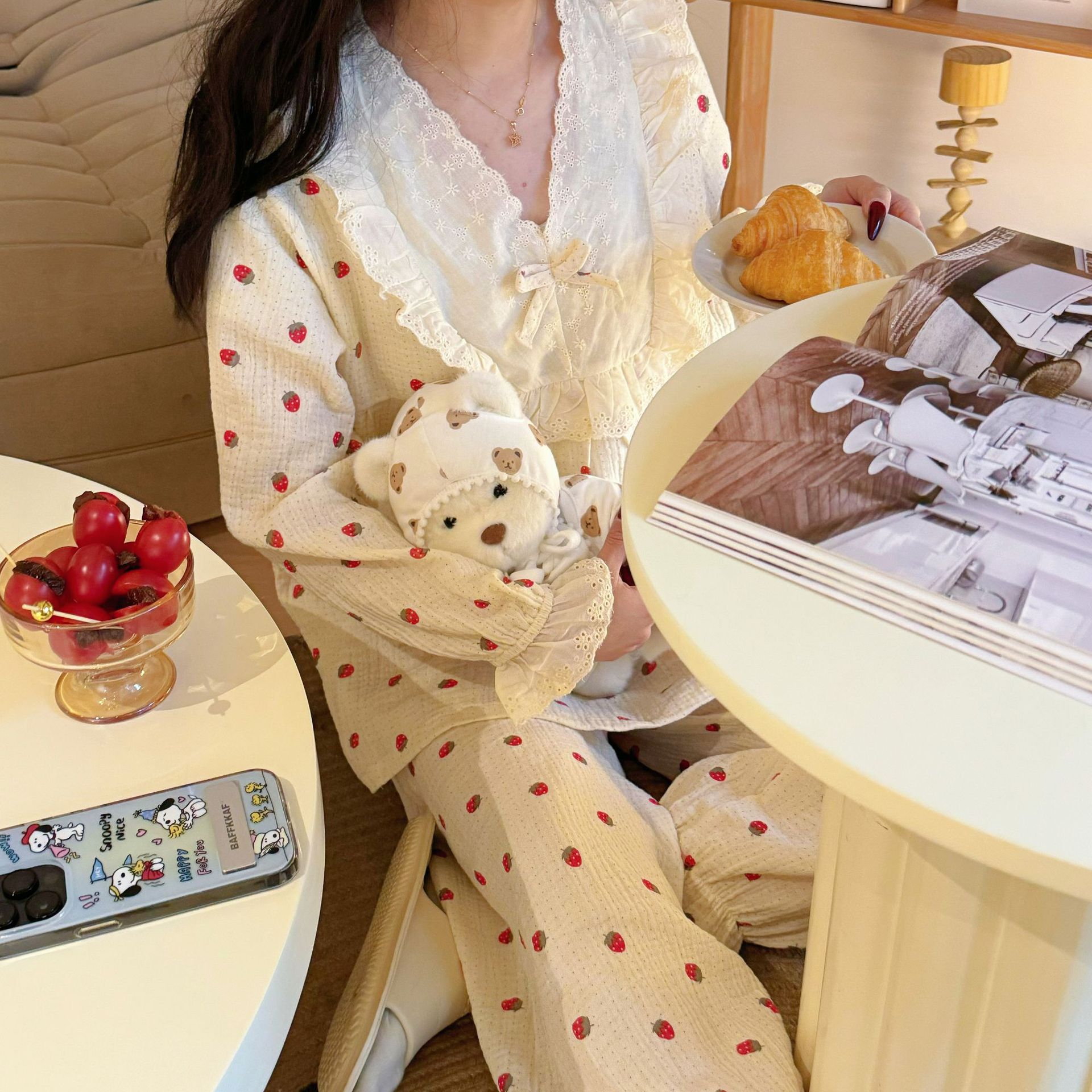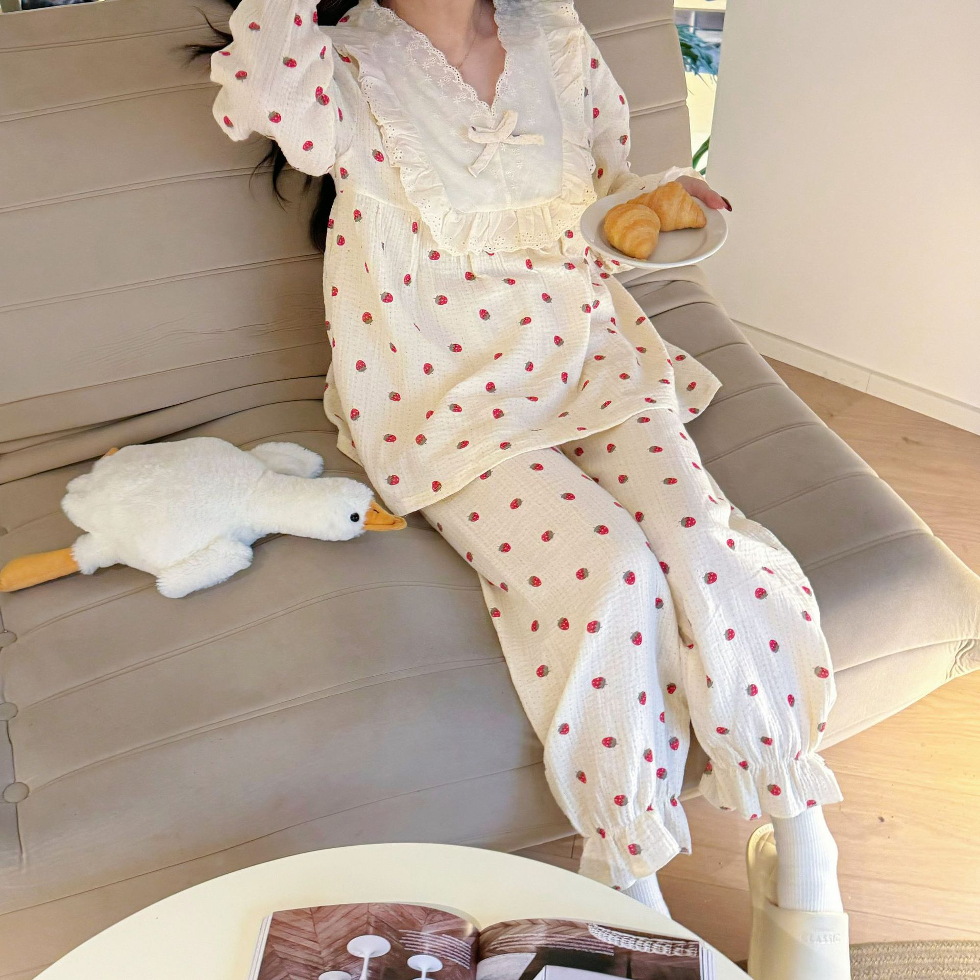 洛兰沙家居馆【只代发】【只代发】 2024新款棉纱绉布睡衣女春夏季甜美蕾丝印花韩版花边长袖套头家居服四季款 嫩黄