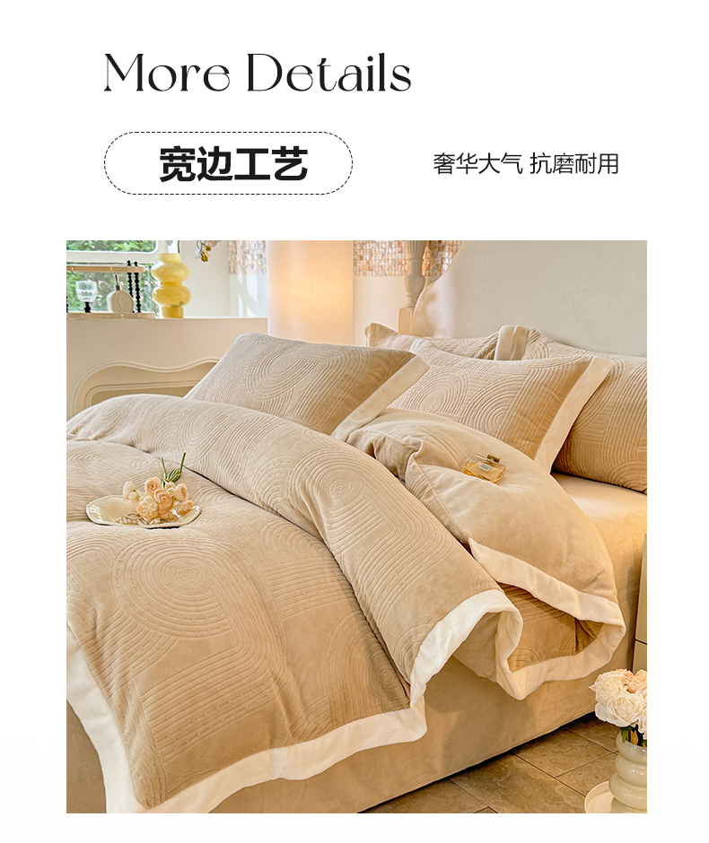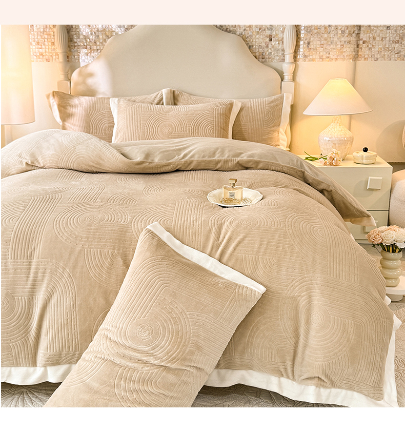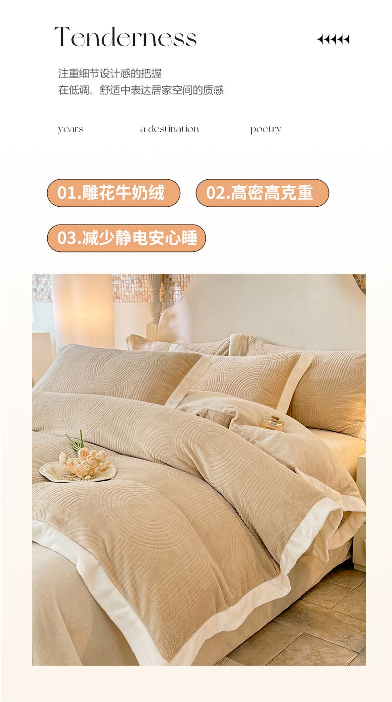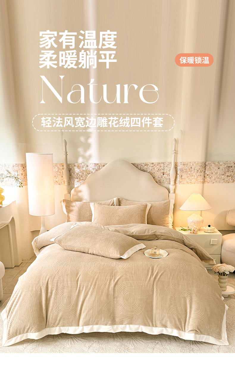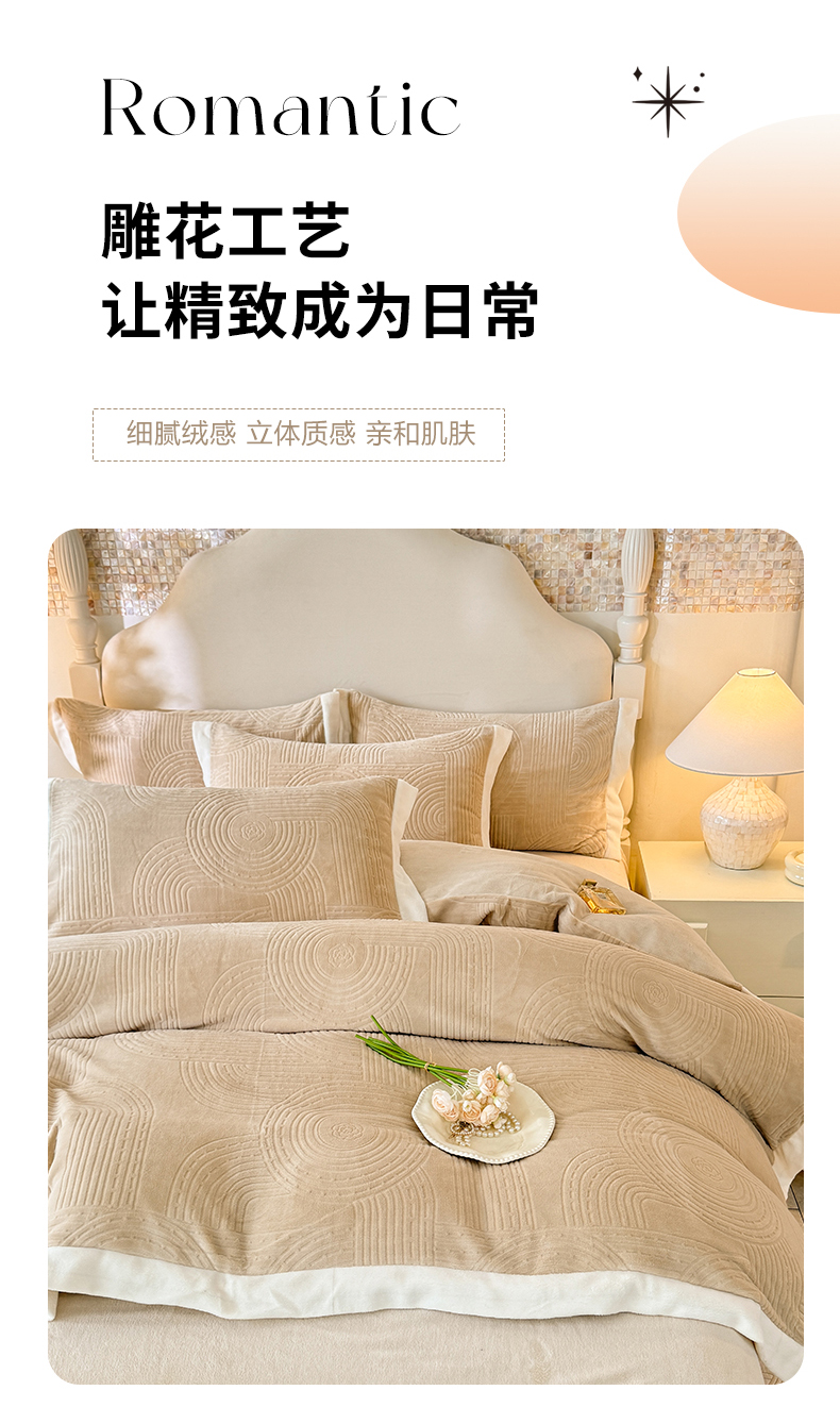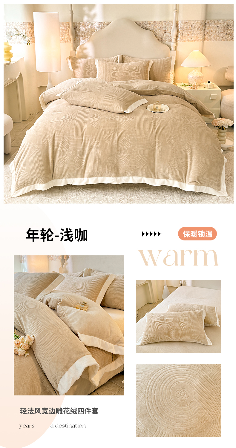 商品名称:捌月 2025新款轻法风宽边雕花牛奶绒四件套提花牛奶绒加厚保暖绒套件直播新品 年轮-浅咖