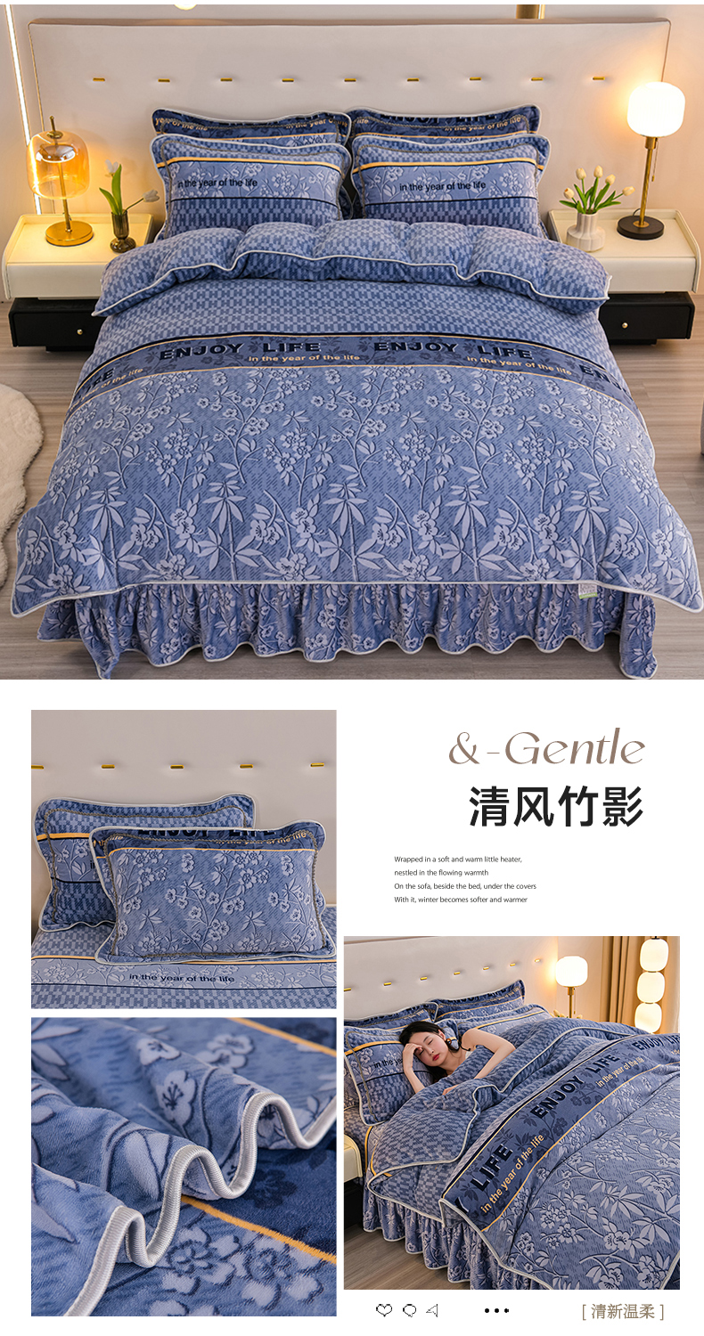 赫本家纺 2025新品8-9斤爆品牛奶绒四件套床裙款金雕绒法莱绒四套件 清风竹影