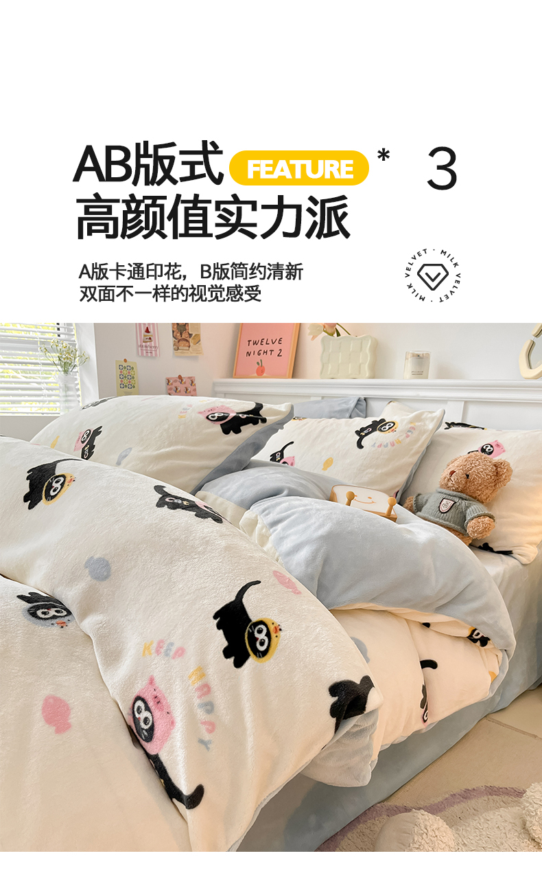 商品名称:桃子家居 2024新款小清新卡通加厚牛奶绒全工艺200克印花牛奶绒系列四件套 绒-快乐喵