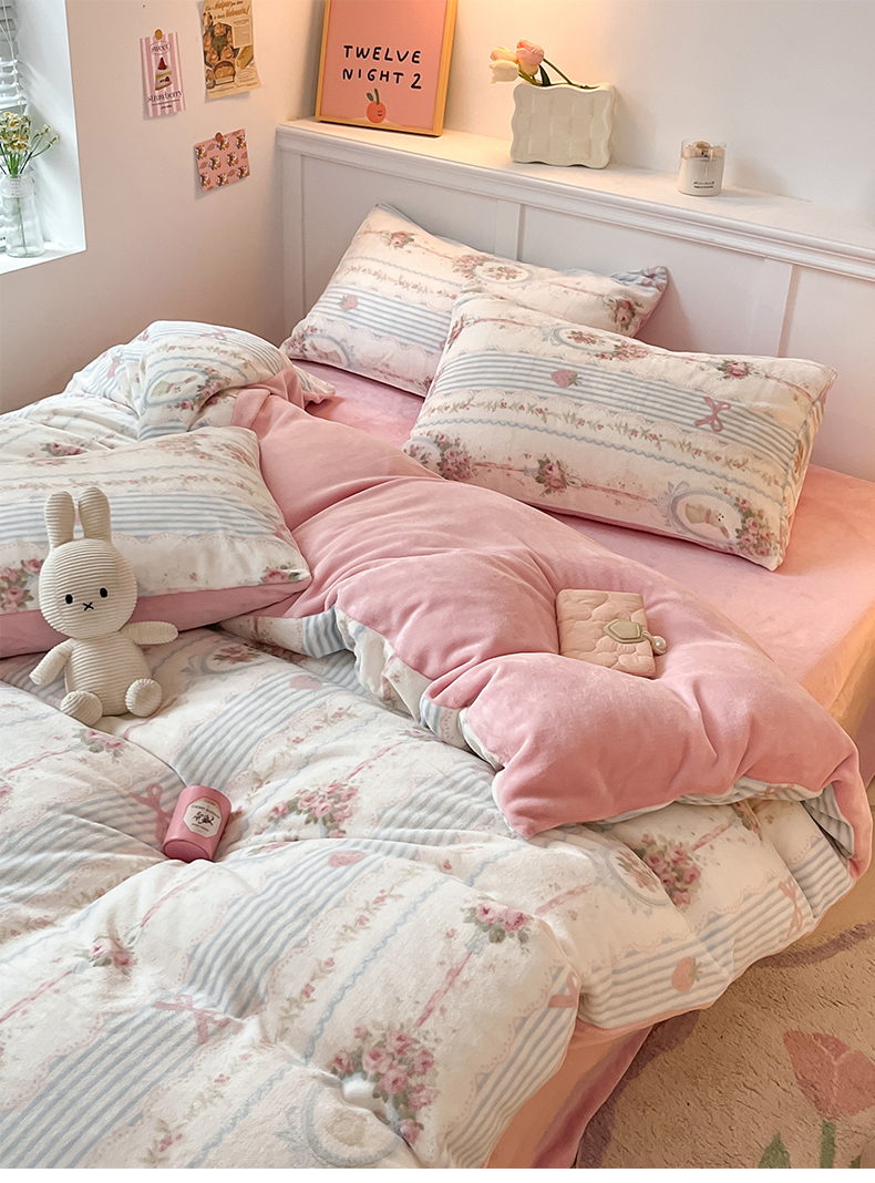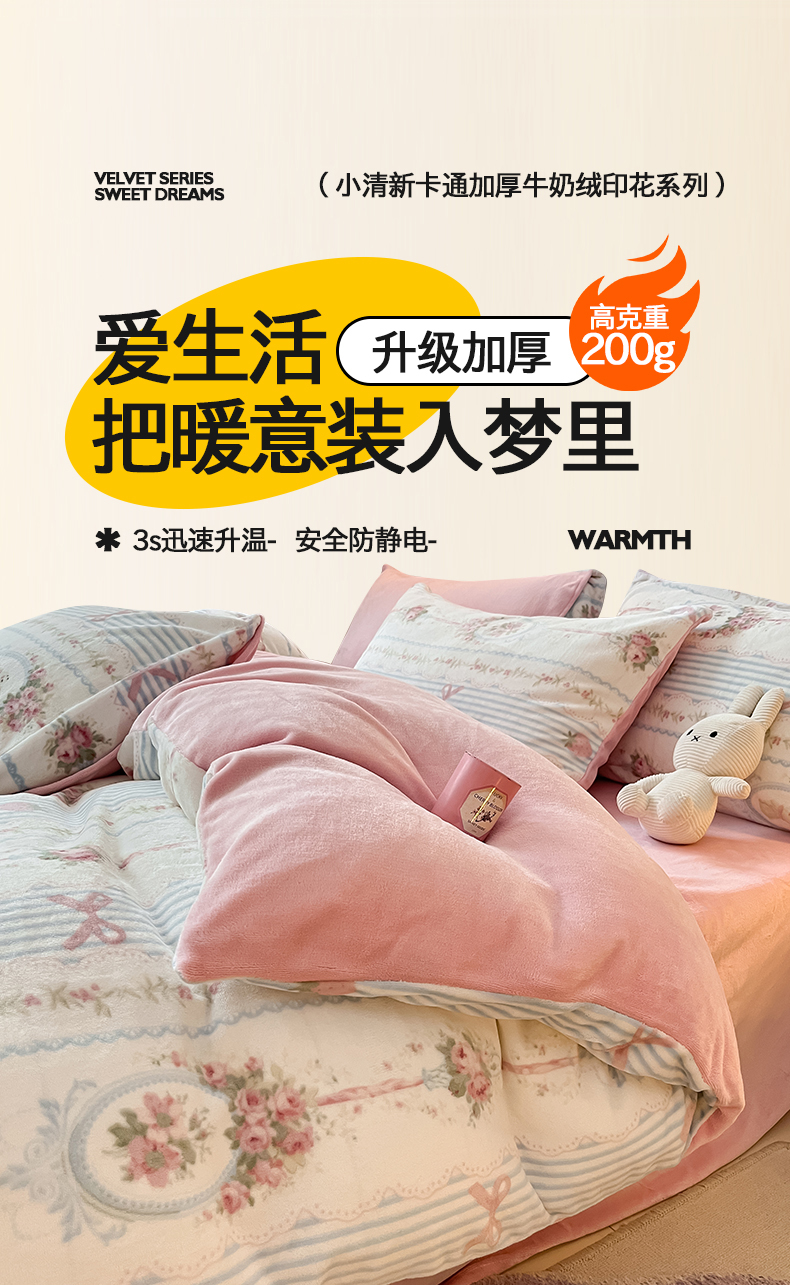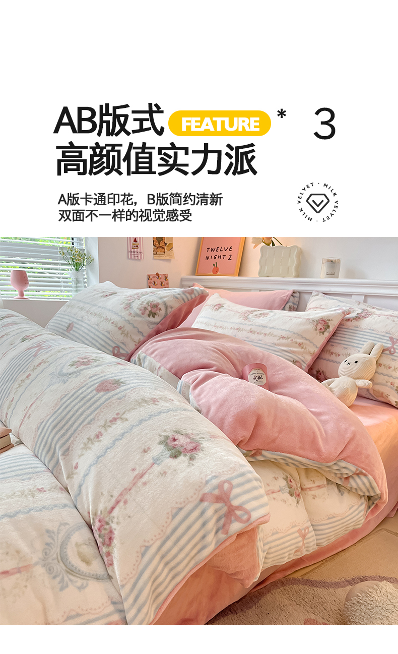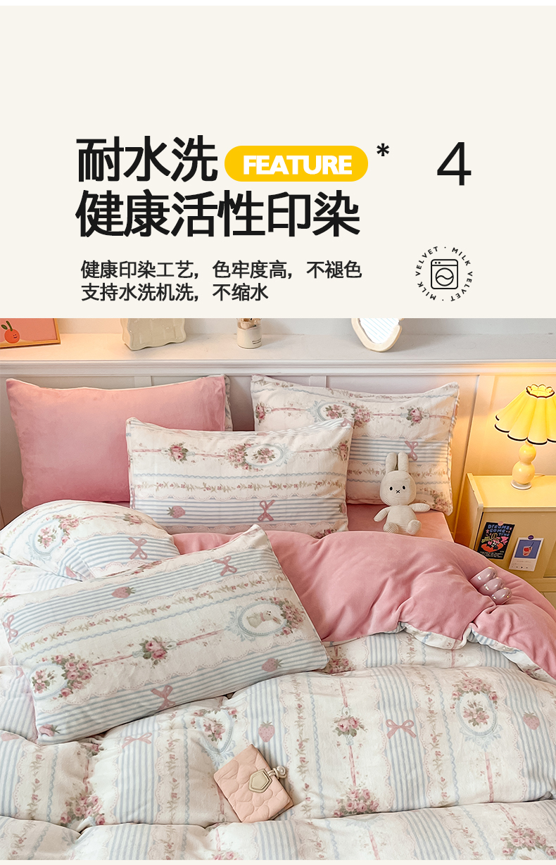 商品名称:桃子家居 2024新款小清新卡通加厚牛奶绒全工艺200克印花牛奶绒系列四件套 绒-萝莉兔
