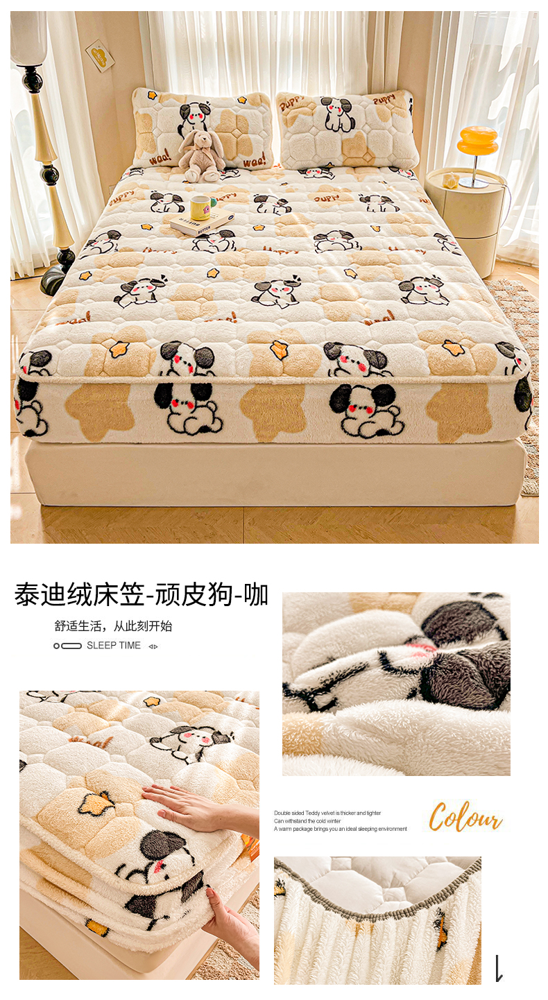 • 91家纺网 家纺一手货源 找家纺 雯豆家纺 2024冬款新品泰迪绒夹棉床笠三件套北极绒床垫保护套加厚保暖床笠 泰迪绒床笠-顽皮狗-咖