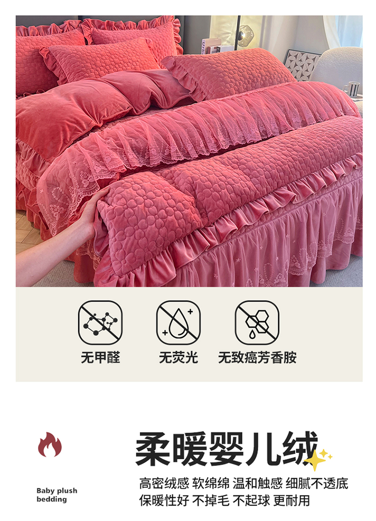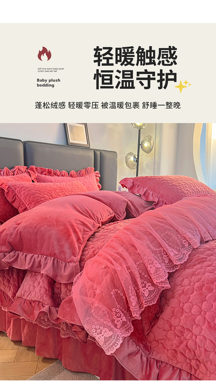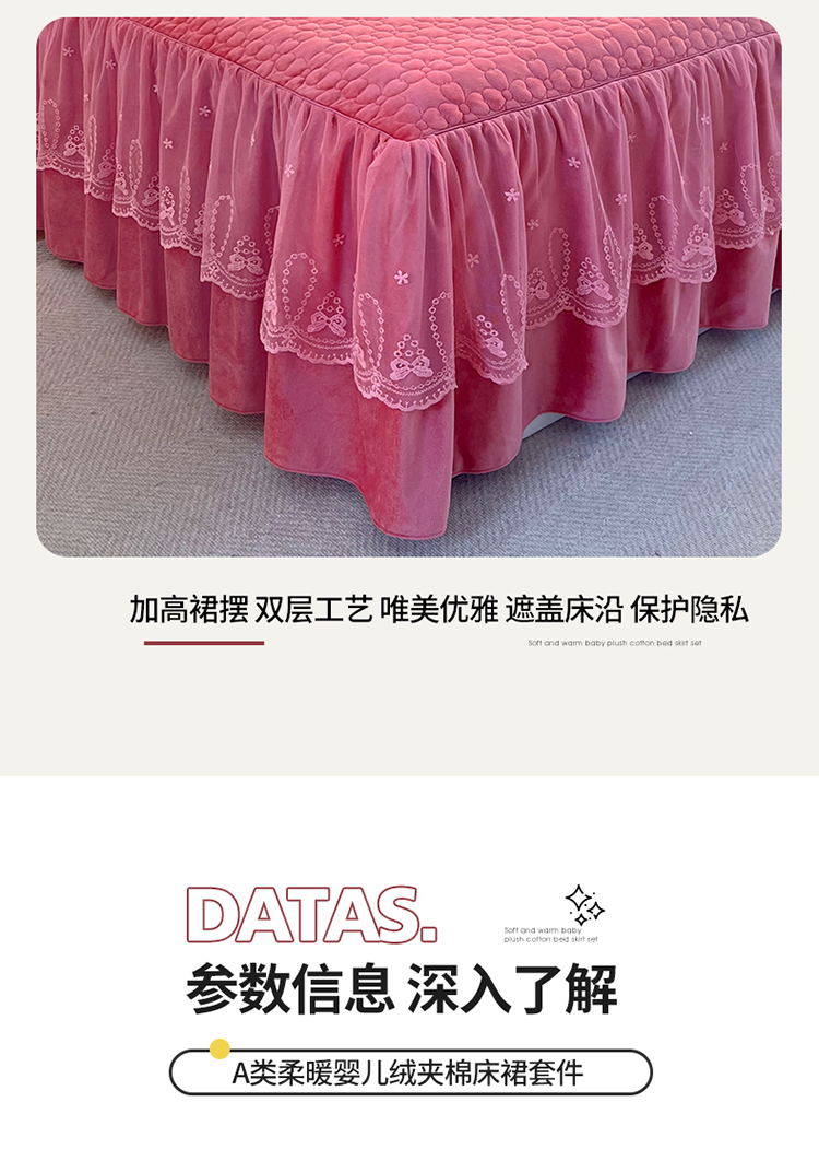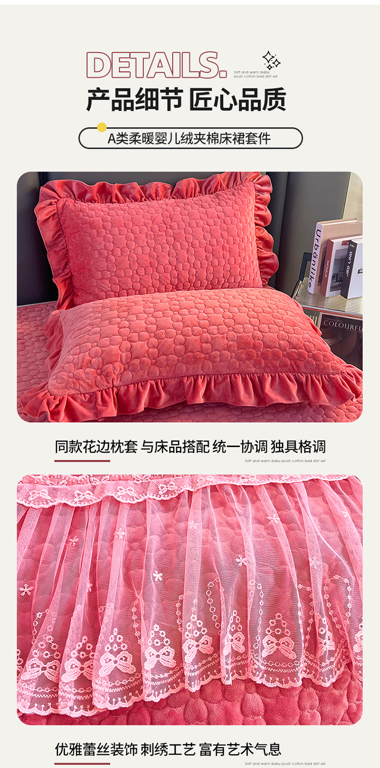 当前位置: 91家纺网 > 商品网购 > 床品套件 > 四件套 > 其它四件套 > 2024新款A类柔暖婴儿绒夹棉床裙四件套-倾世温柔 倾世温柔 玫粉