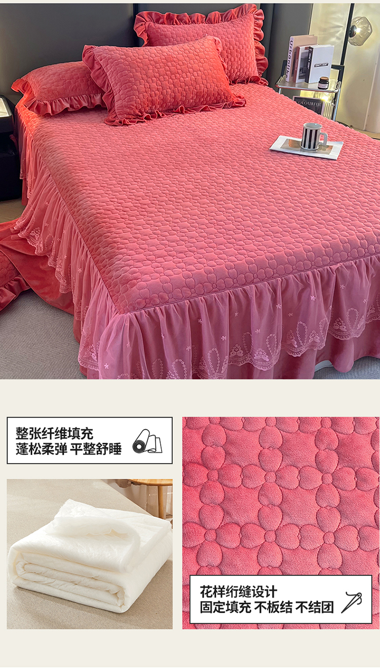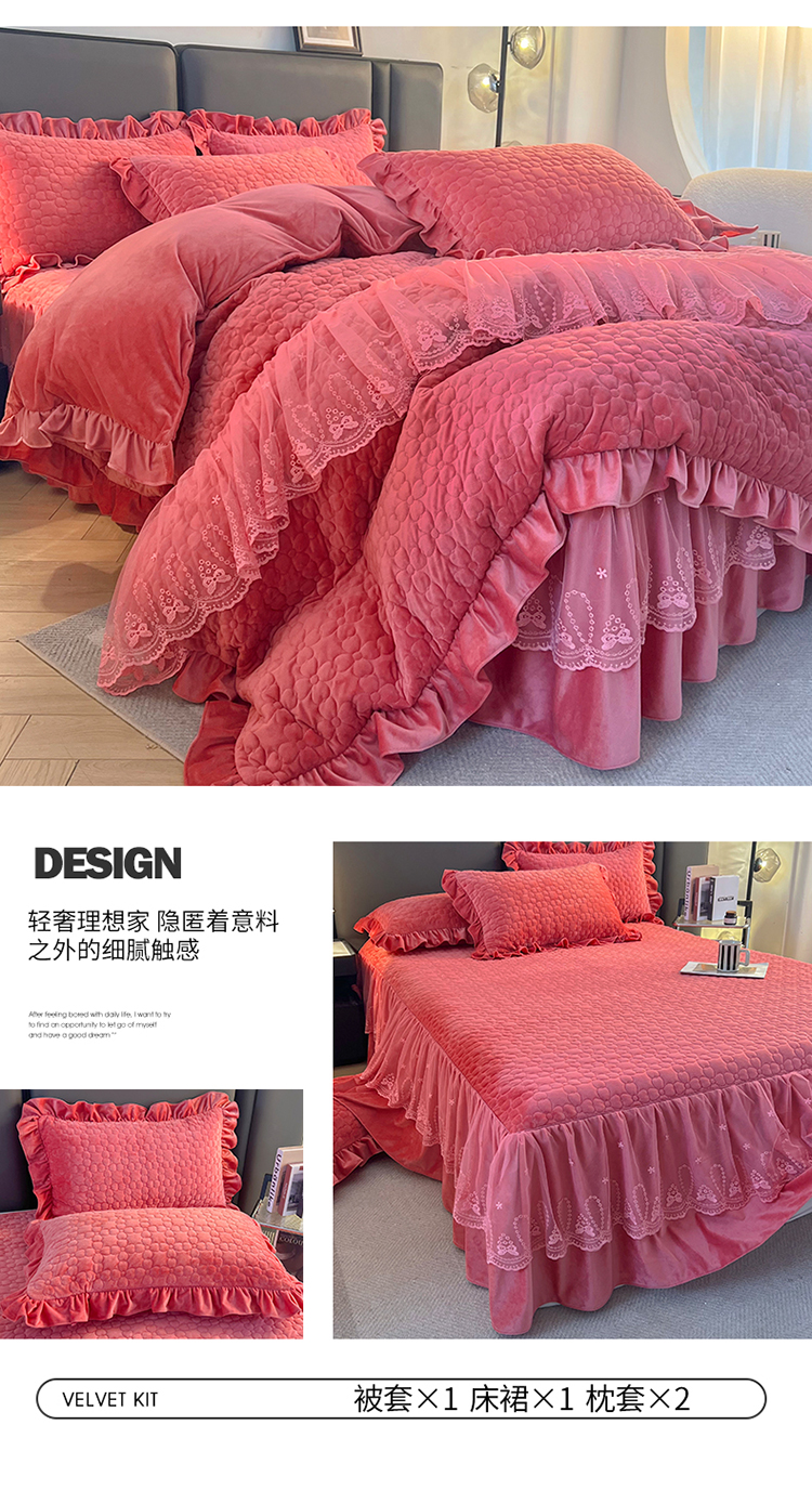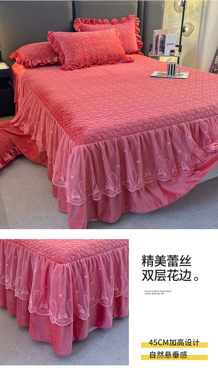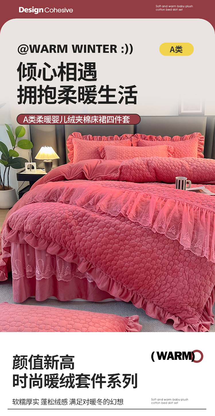 当前位置: 91家纺网 > 商品网购 > 床品套件 > 四件套 > 其它四件套 > 2024新款A类柔暖婴儿绒夹棉床裙四件套-倾世温柔 倾世温柔 玫粉