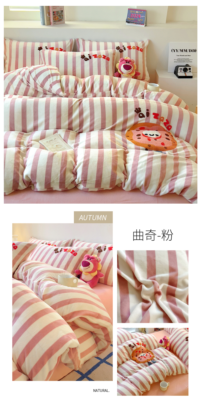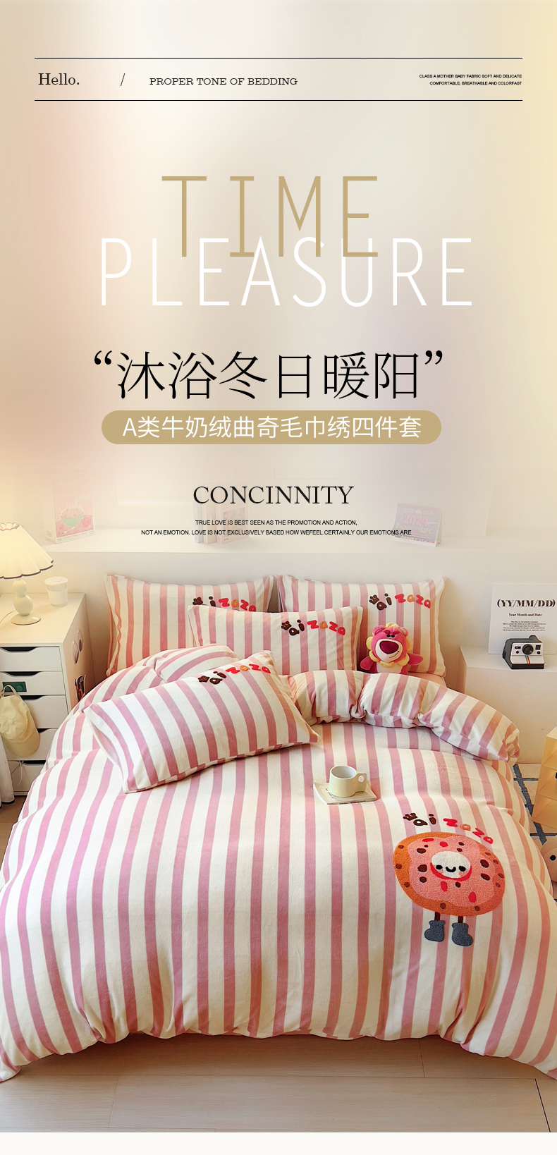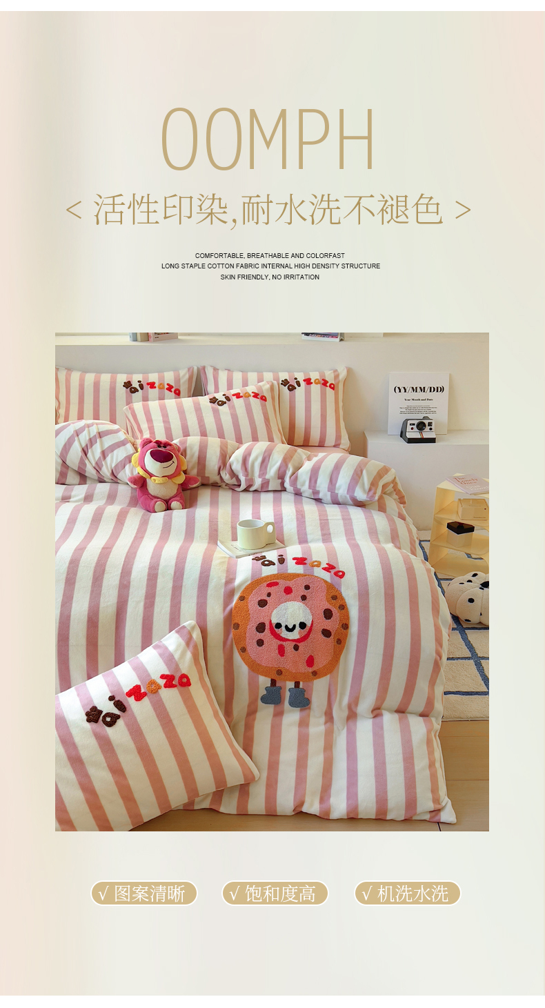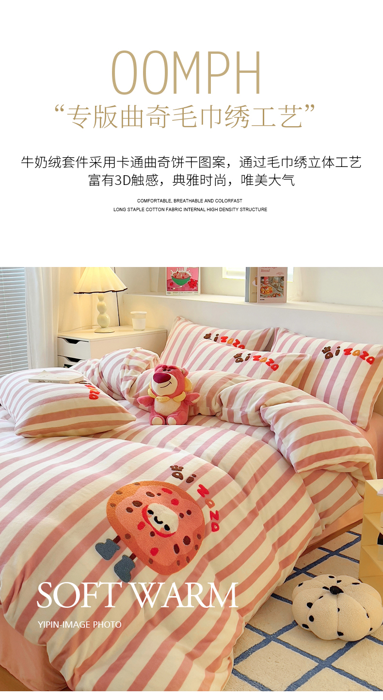 商品名称:丝羽坊 2024新款A类牛奶绒毛巾绣四件套-曲奇 曲奇-粉