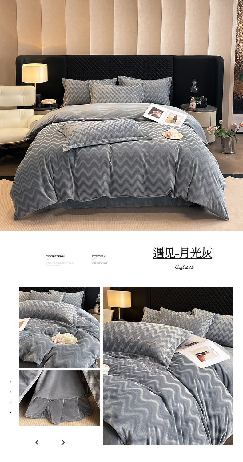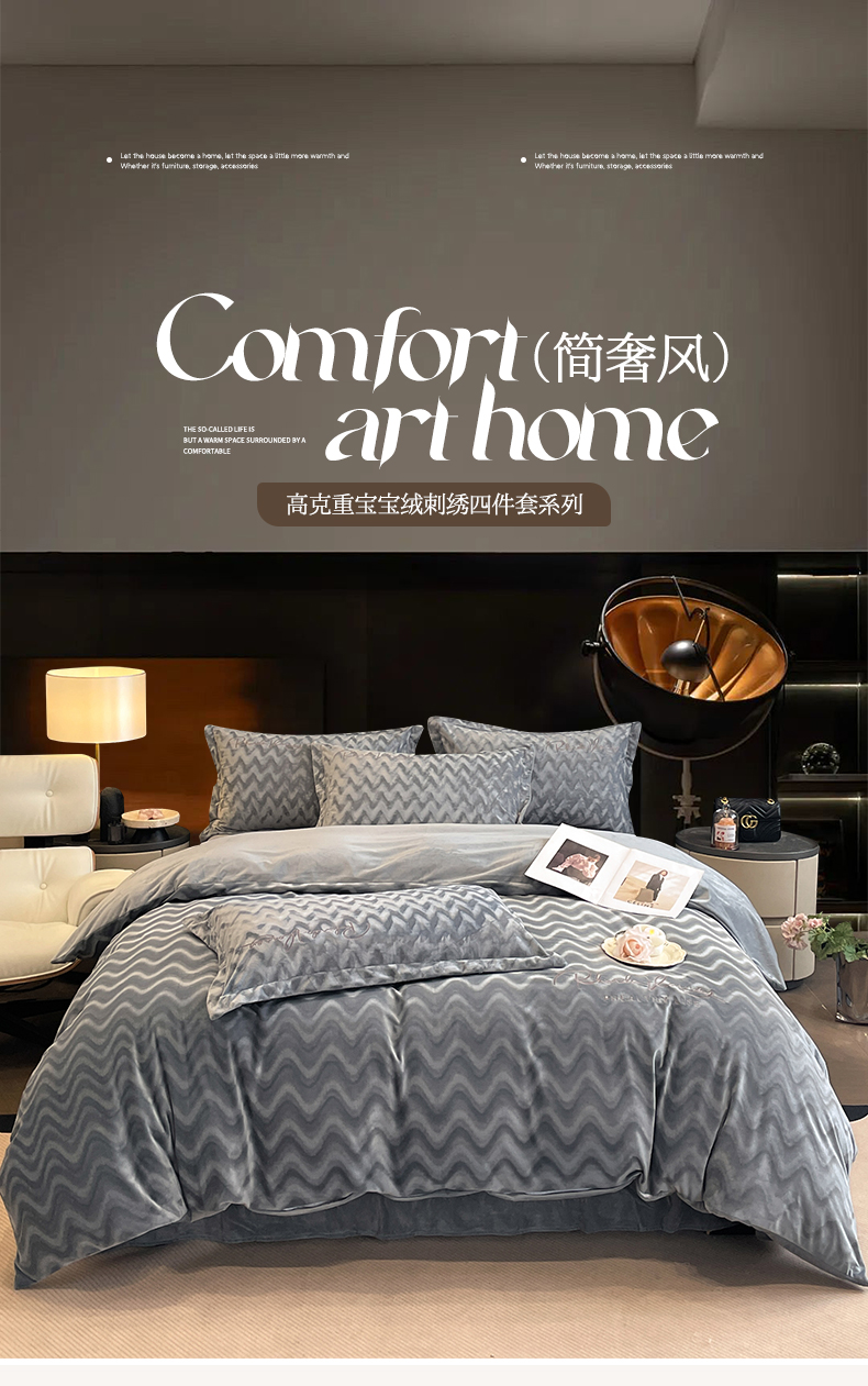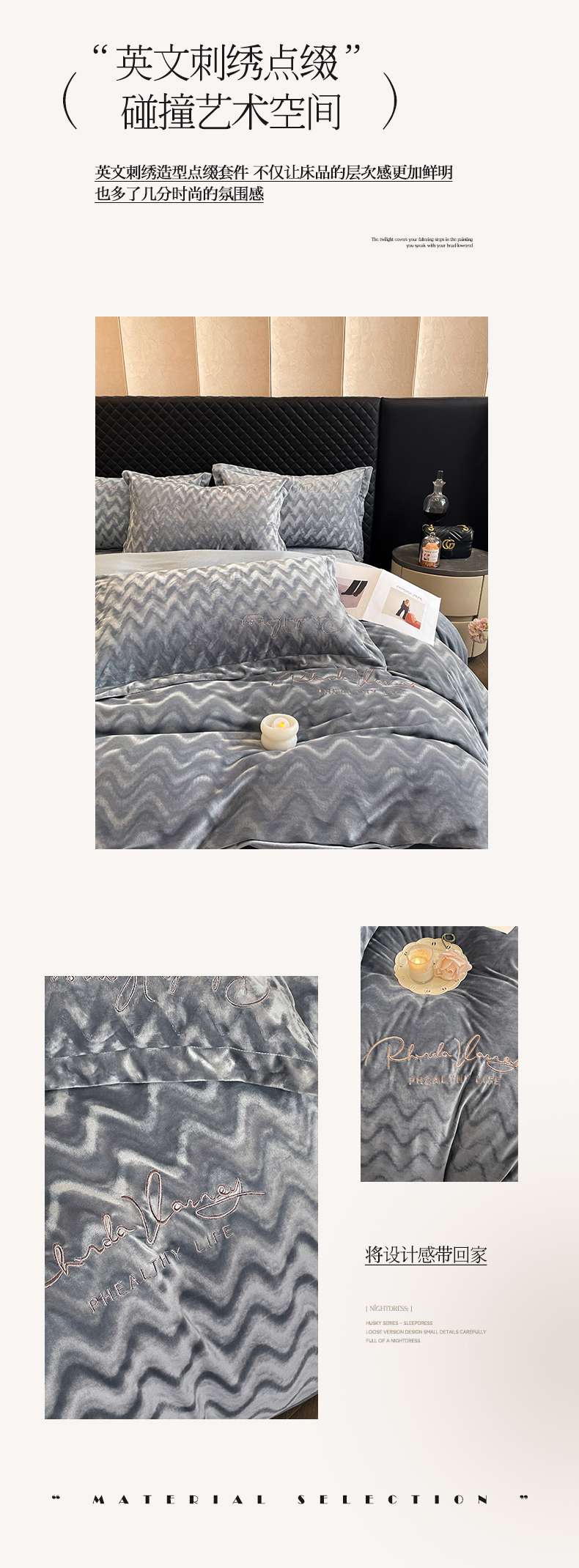 商品名称:2024新款高克重宝宝绒简奢风刺绣四件套系列-遇见 遇见-月光灰