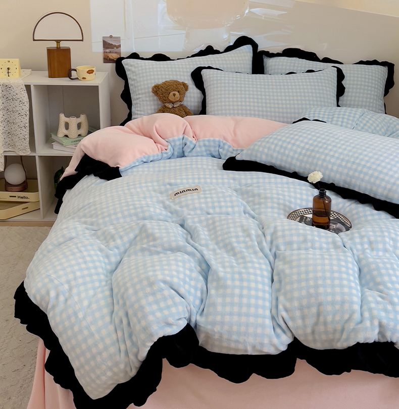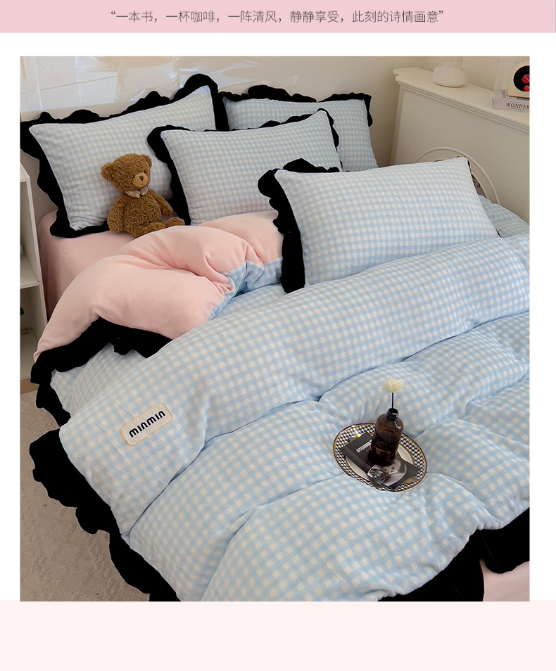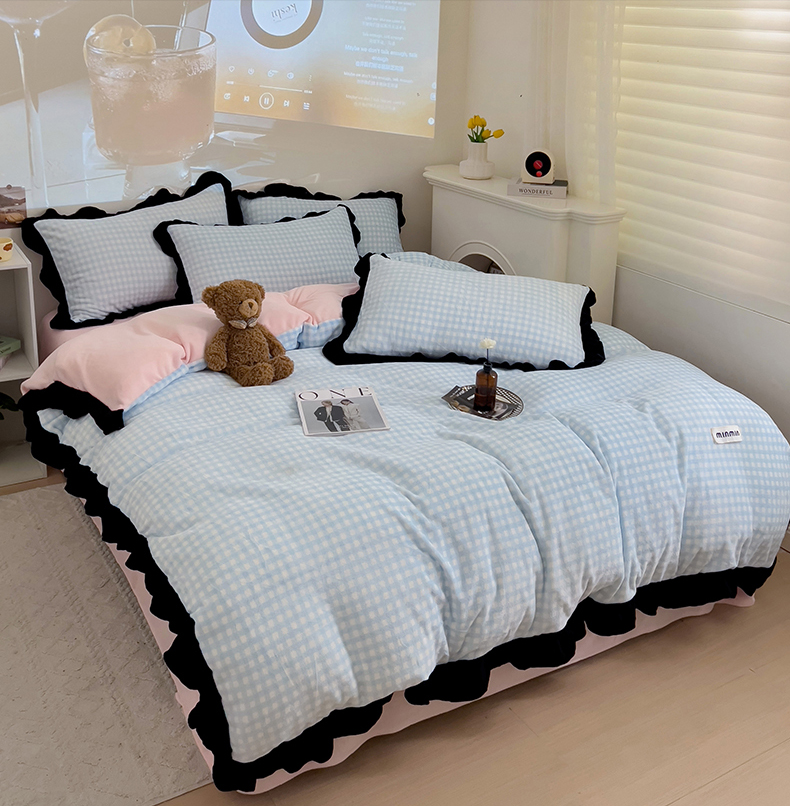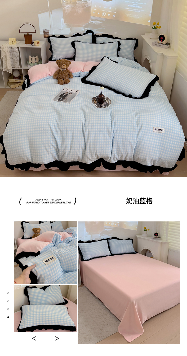 米莱家纺 2024新款韩式花边牛奶绒四件套 奶油蓝格