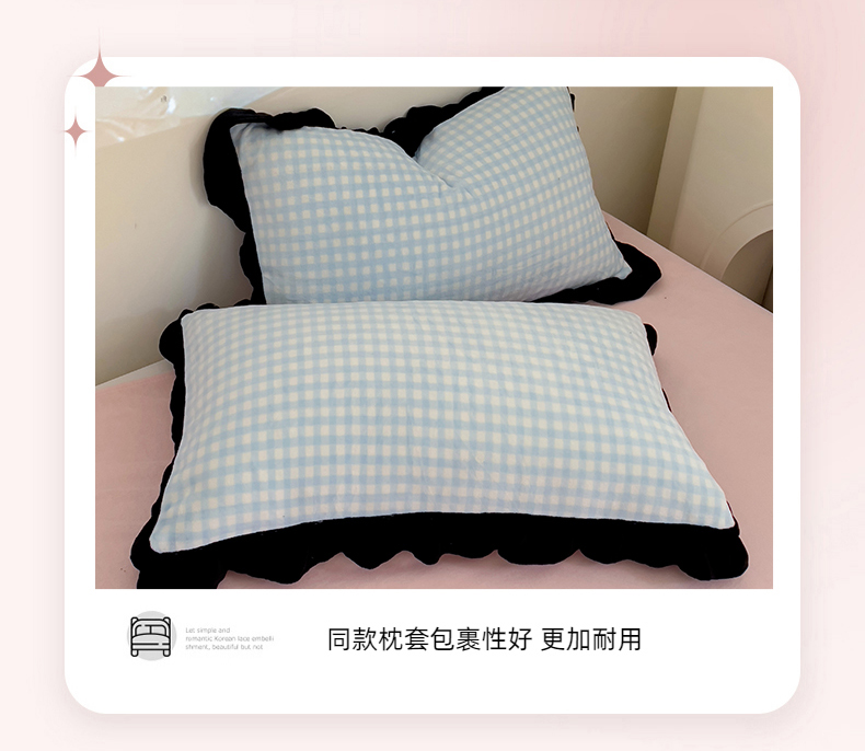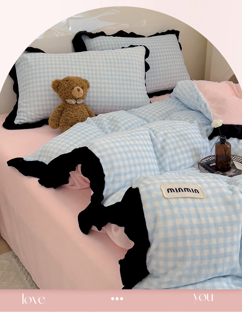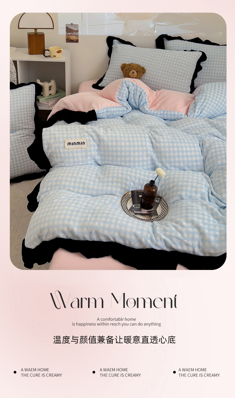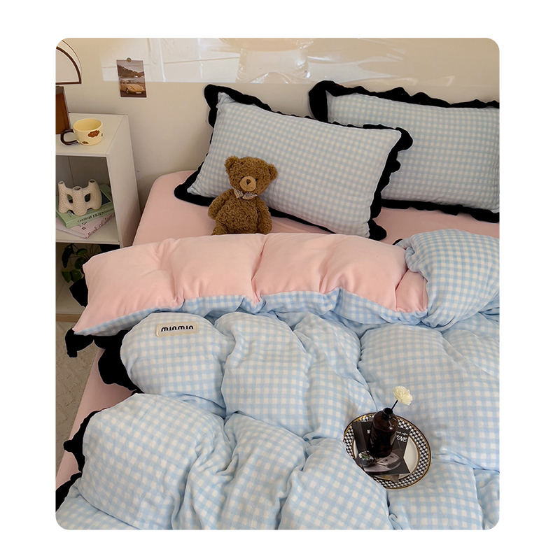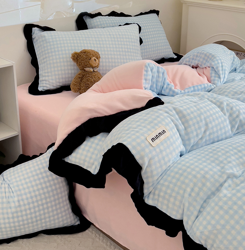 米莱家纺 2024新款韩式花边牛奶绒四件套 奶油蓝格