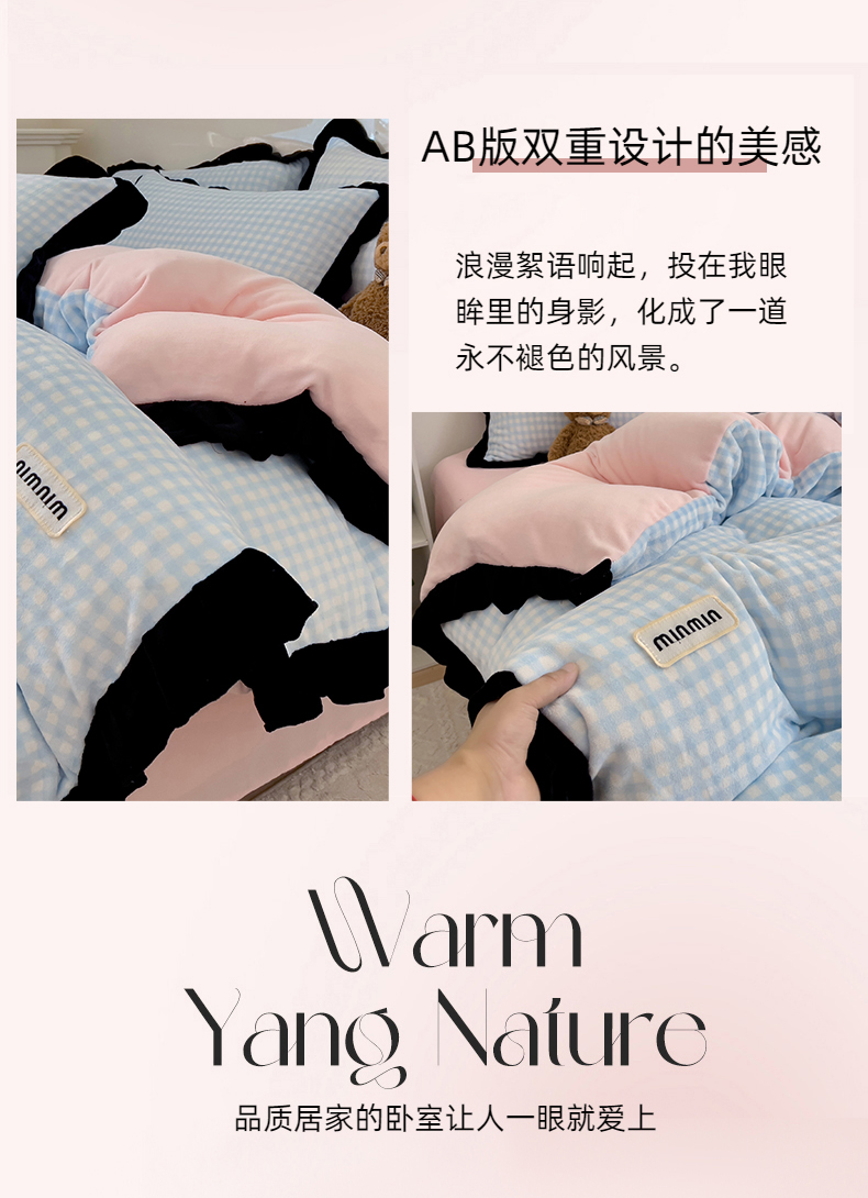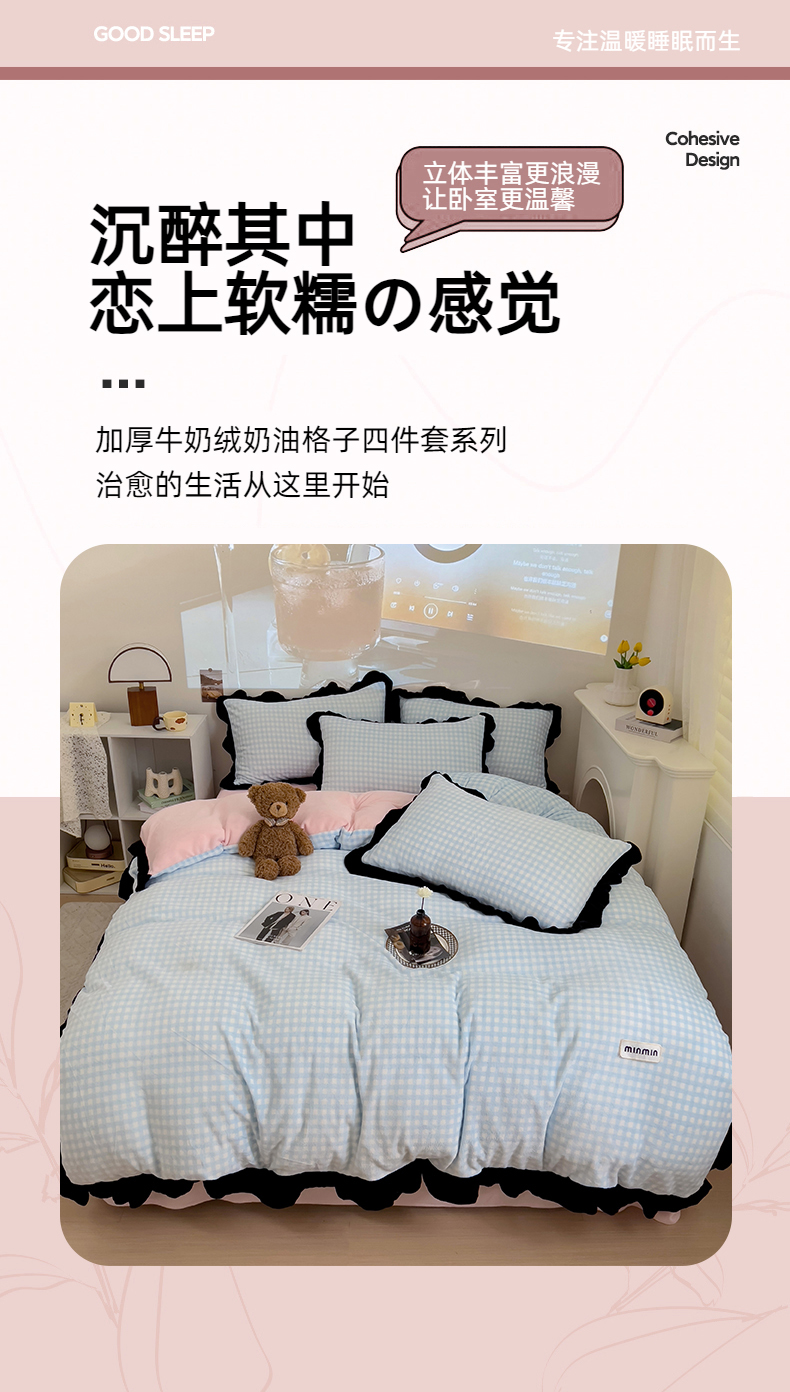 (总)米莱家纺 2025新款兔毛绒花边牛奶绒四件套,彩色圆点,繁花,粉黛,蝴蝶结,咖圆点,可爱兔,可爱熊,蔷薇