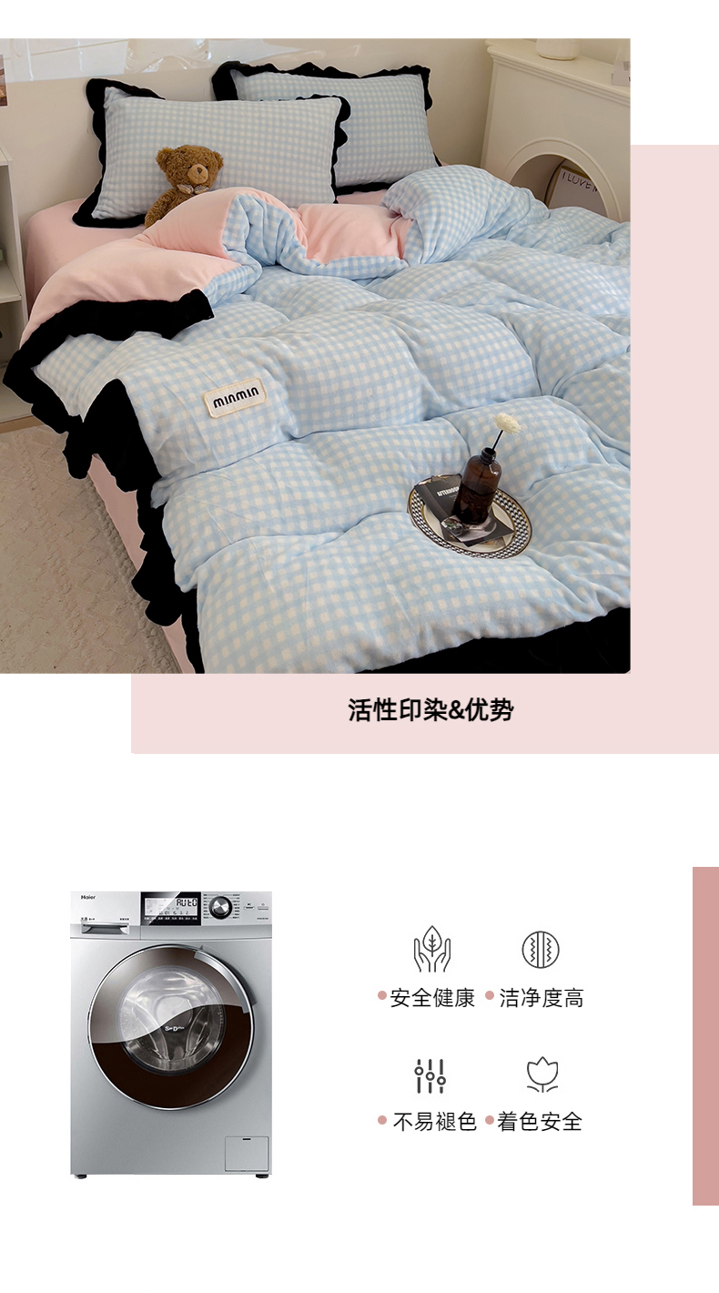 商品名称:米莱家纺 2024新款韩式花边牛奶绒四件套 奶油蓝格