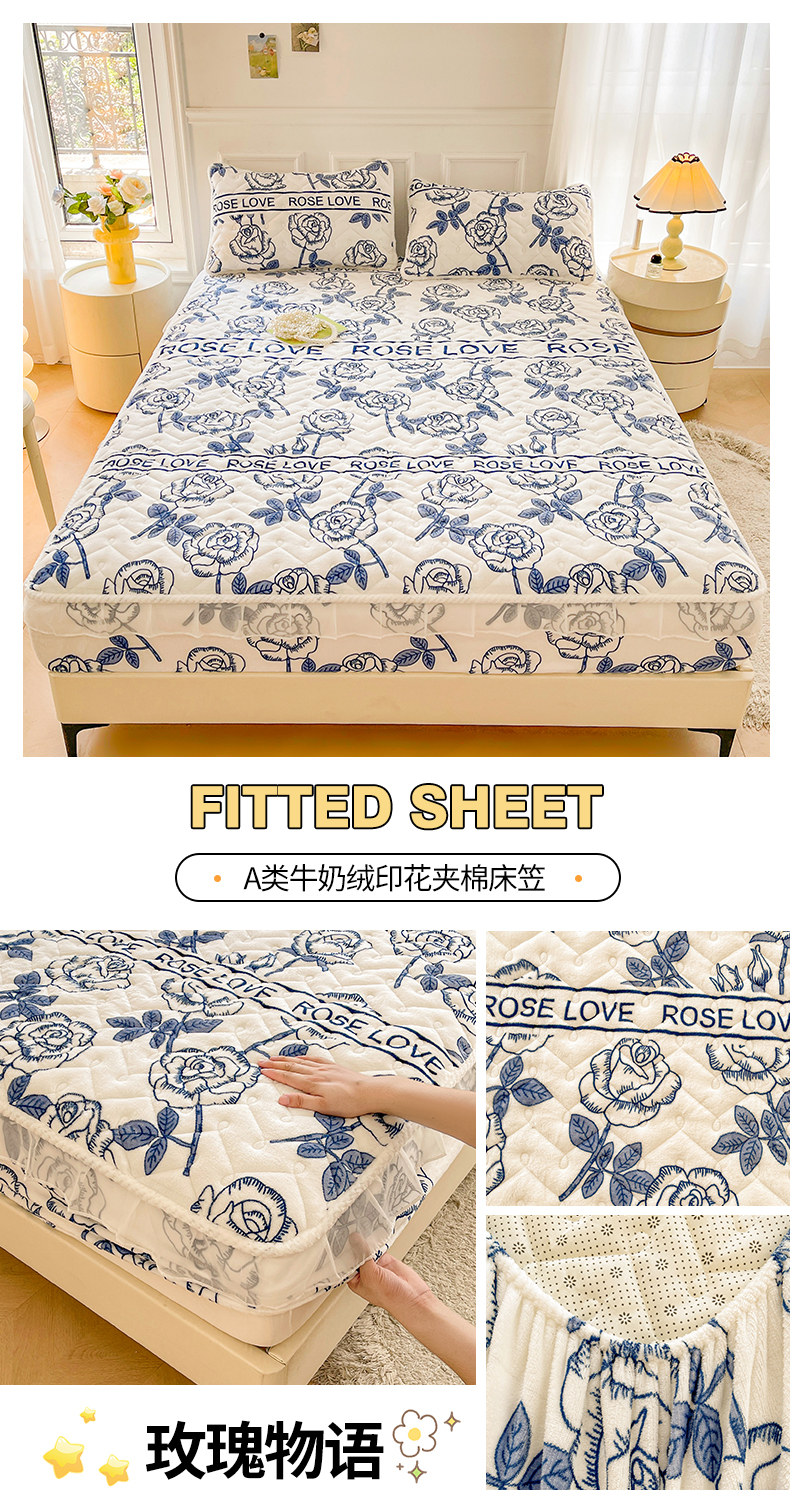 商品名称:小萌虎 2024新款牛奶绒夹棉花边床笠 玫瑰物语