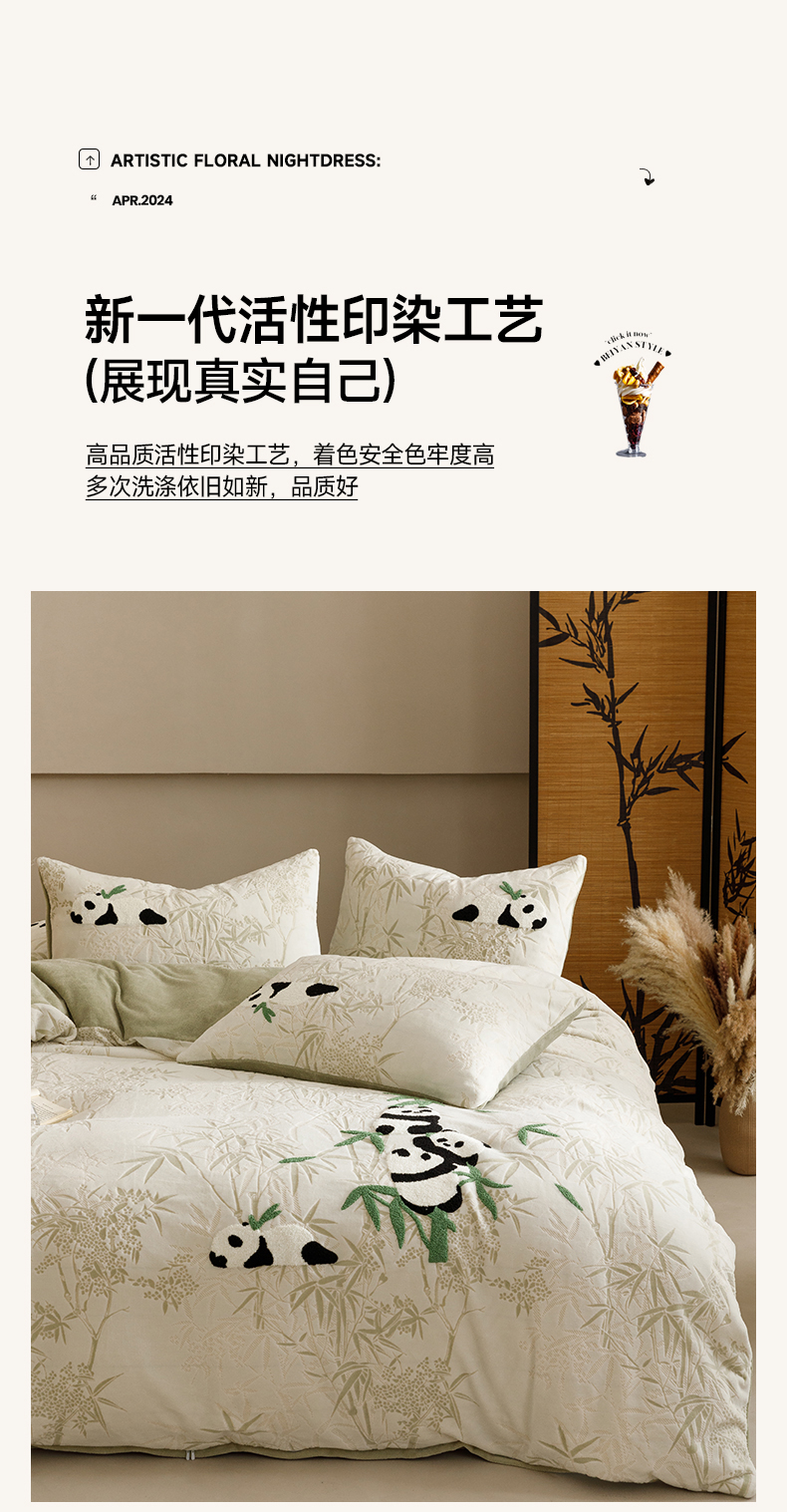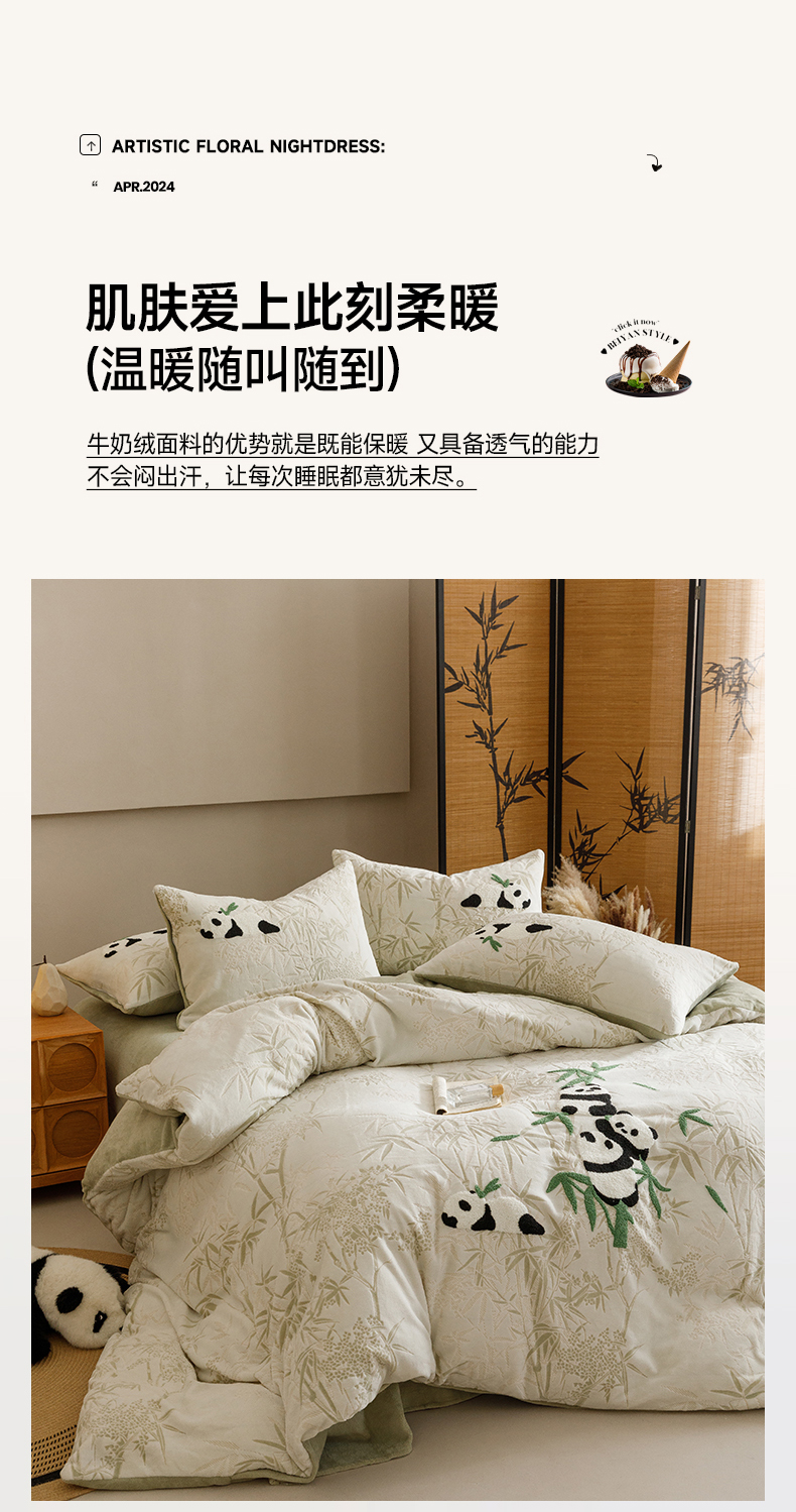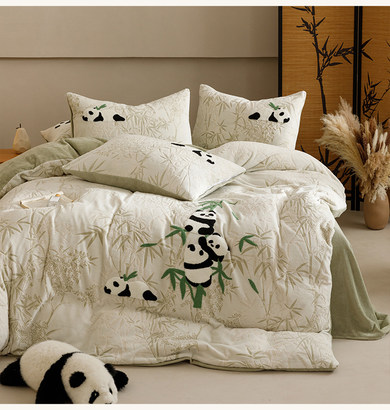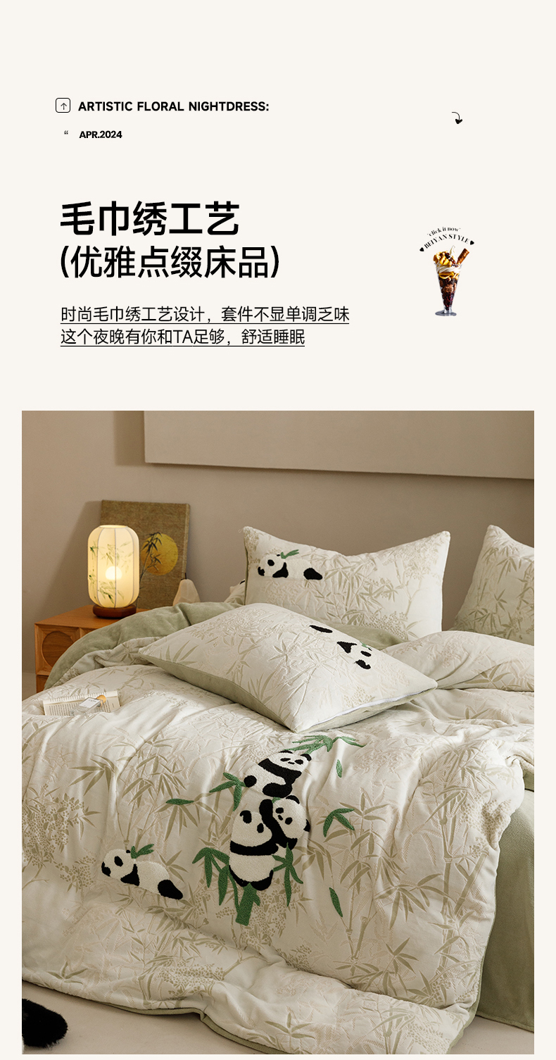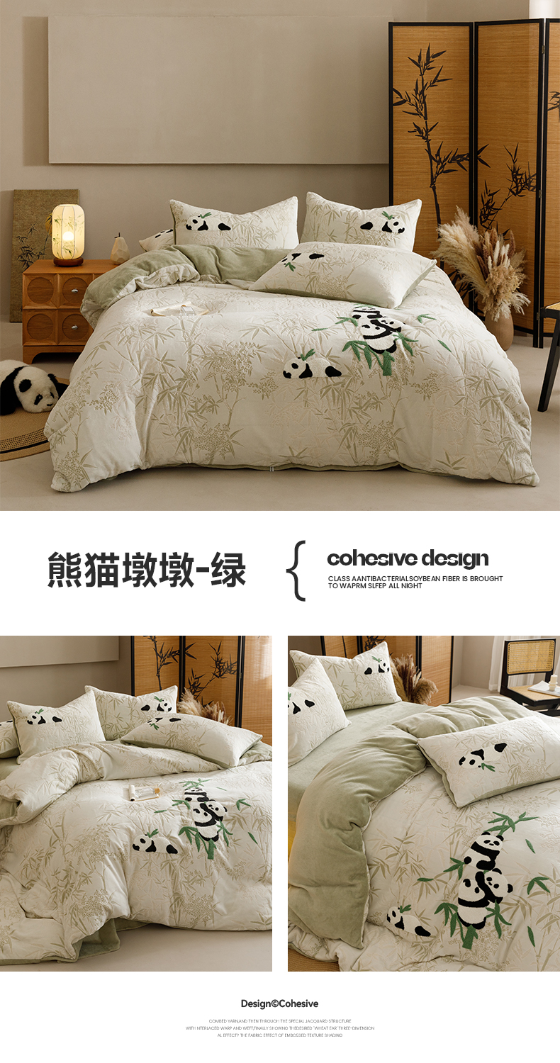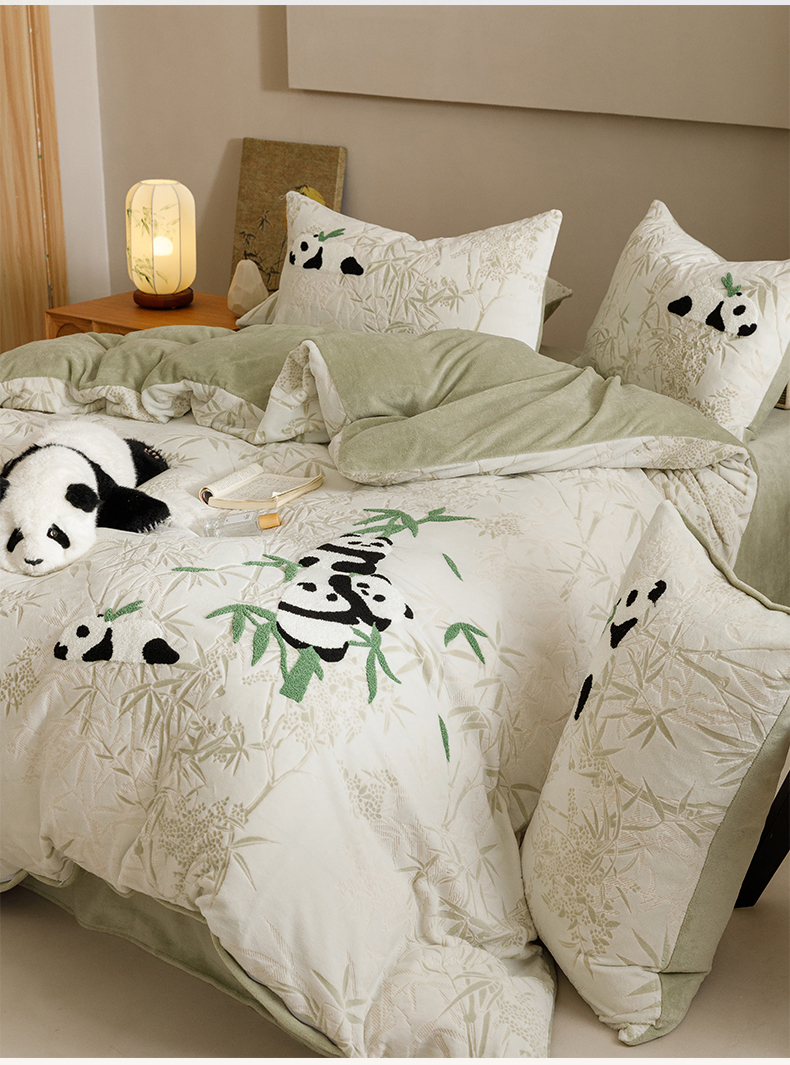 商品名称:蜜柚 2024新款230克全消光色烂牛奶绒毛巾绣四件套 熊猫墩墩-绿