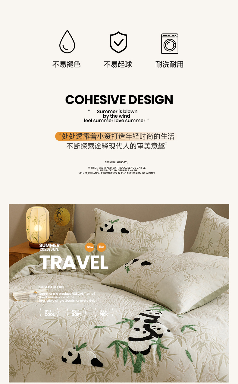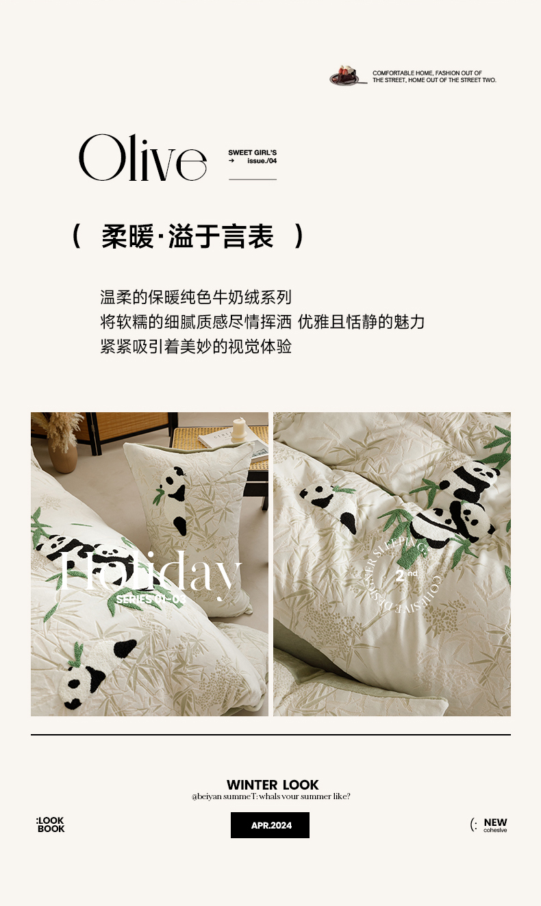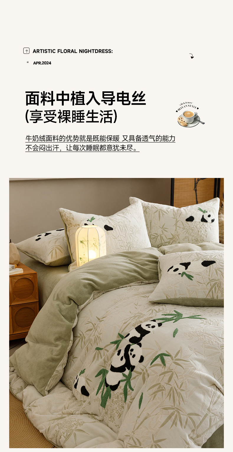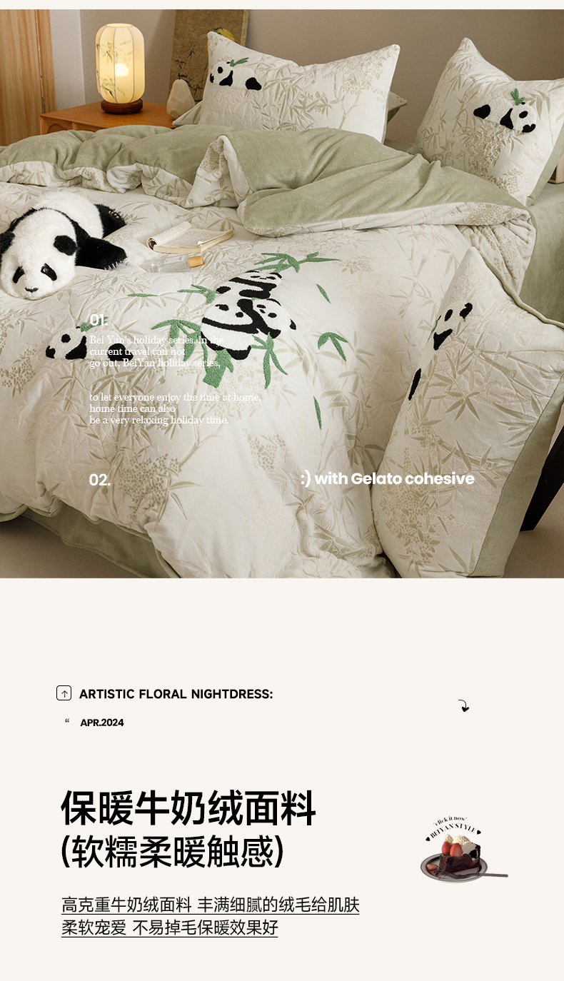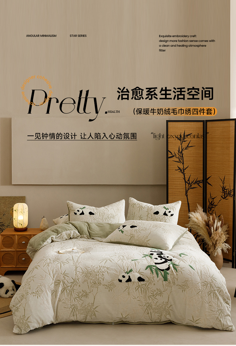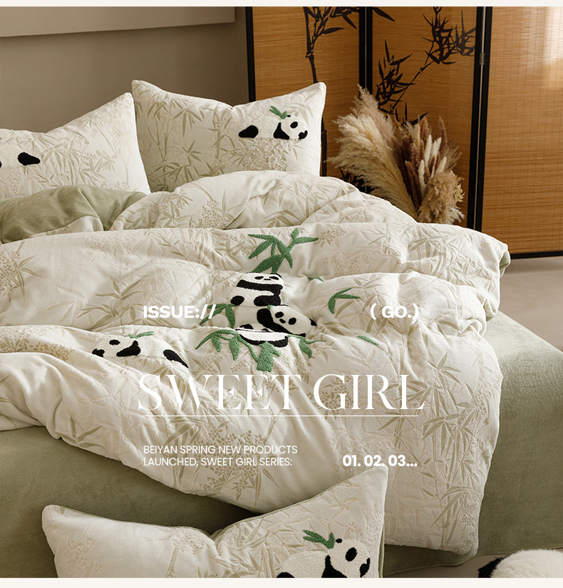 商品名称:蜜柚 2024新款230克全消光色烂牛奶绒毛巾绣四件套 熊猫墩墩-绿