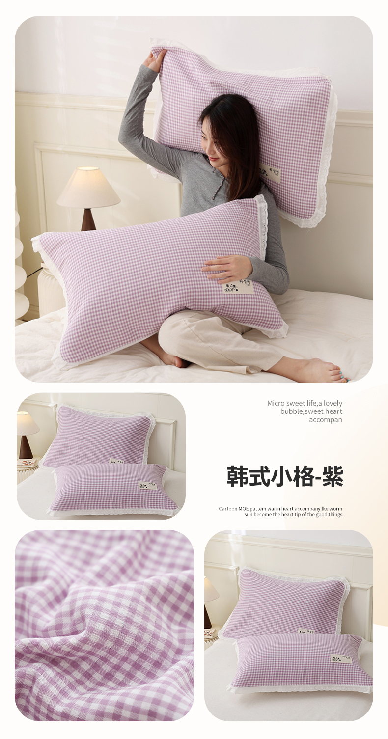 当前位置: 91家纺网 > 商品网购 > 床上用品 > 枕巾 > 朴尔家纺-毛巾被 2024新款韩版小碎花边全棉四层纱布枕巾 韩式小格-紫