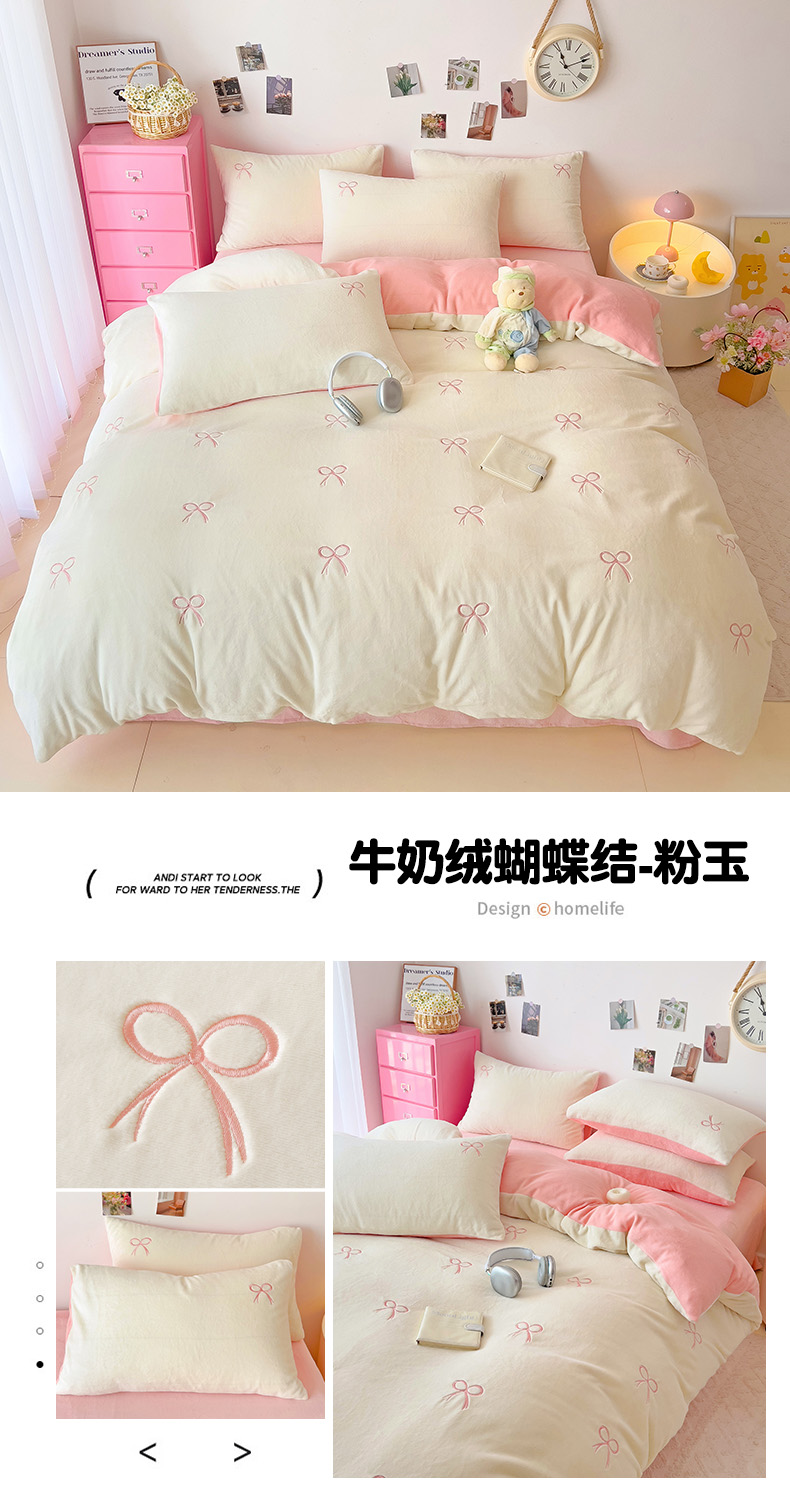 商品名称:海岛哥哥 2024新款小清新刺绣牛奶绒四件套 牛奶绒蝴蝶结-粉玉