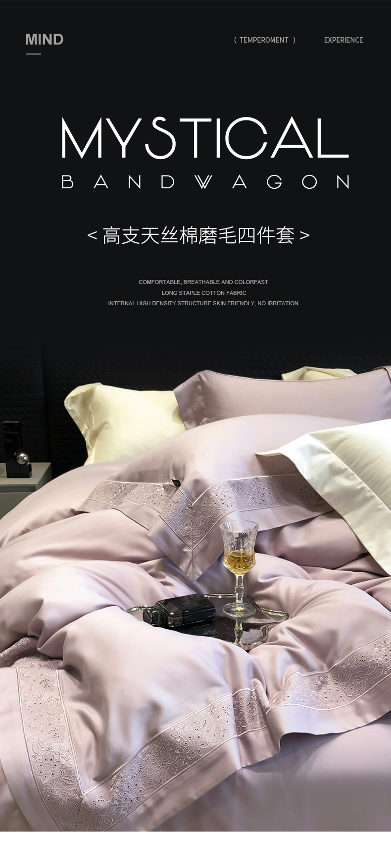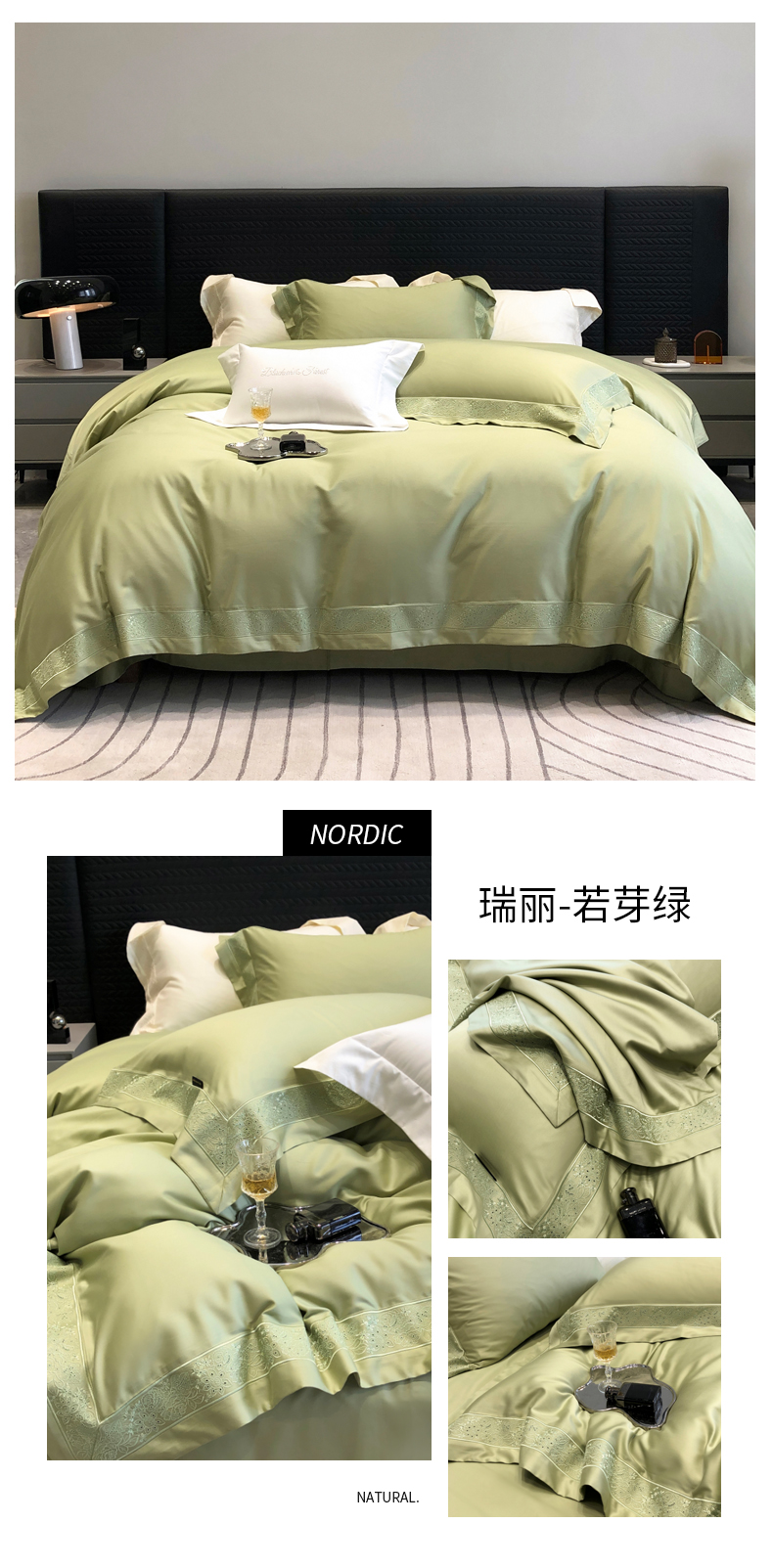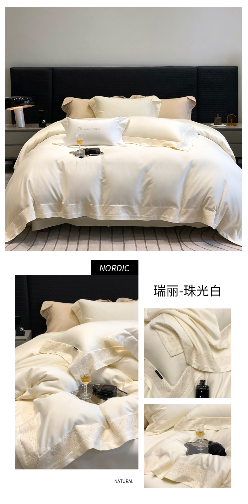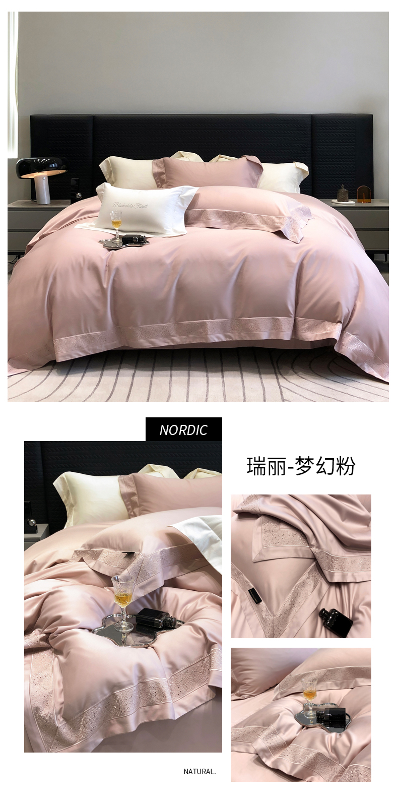 (总)黑白森林2024款 80X80S高支天丝棉四件套镂空蕾丝花边天丝全棉,尚美-晨夕粉,尚美-古象白,尚美-青砂绿,尚美-银雪灰