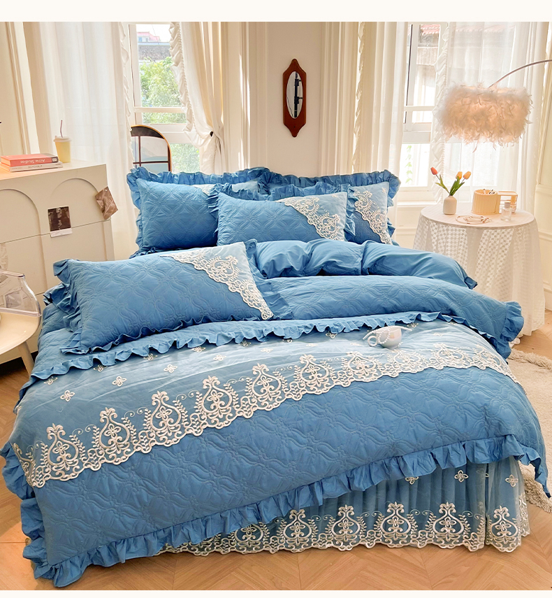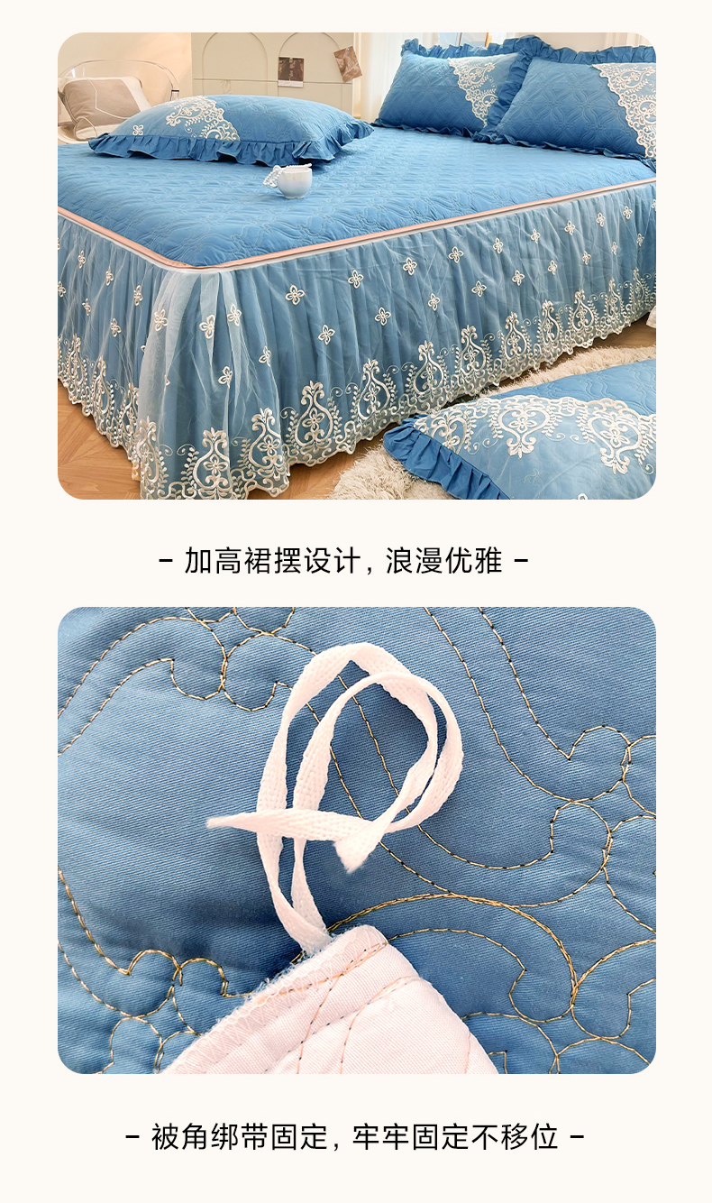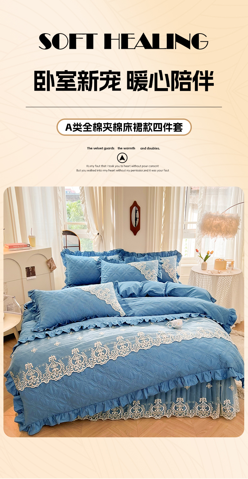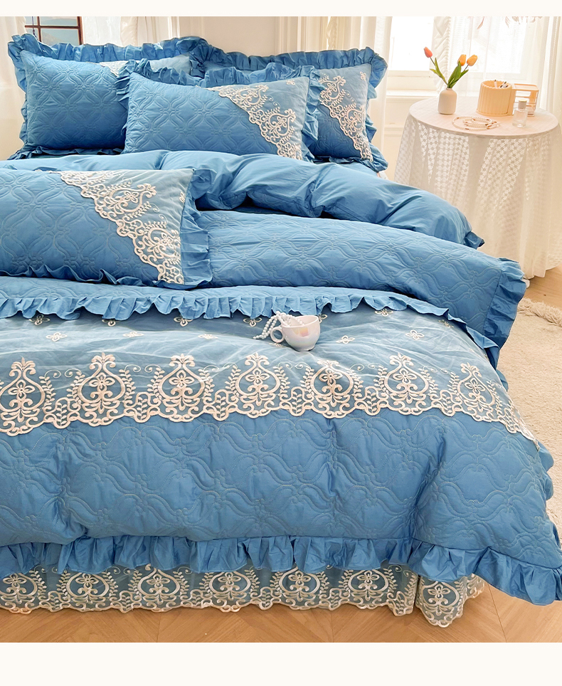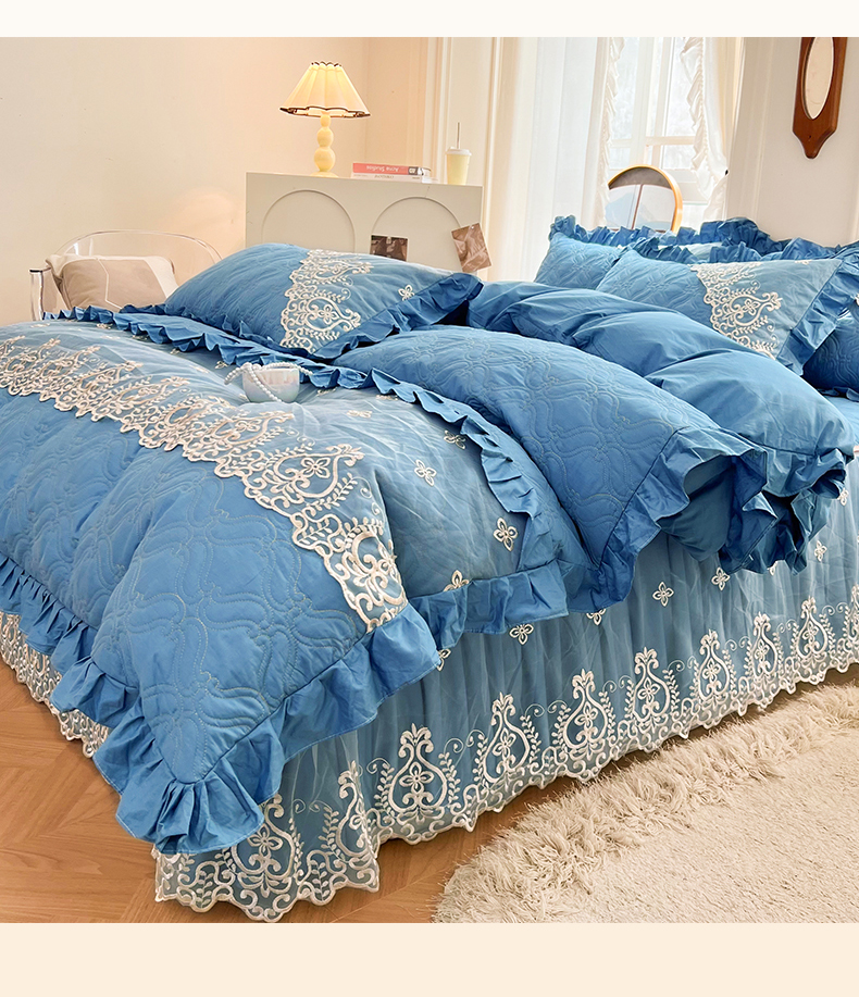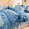 当前位置: 91家纺网 > 商品网购 > 床品套件 > 四件套 > 全棉普通四件套 > 罗艺轩 2024新款公主风全棉加厚可脱卸床笠式床裙四件套 慕雅-牛仔蓝