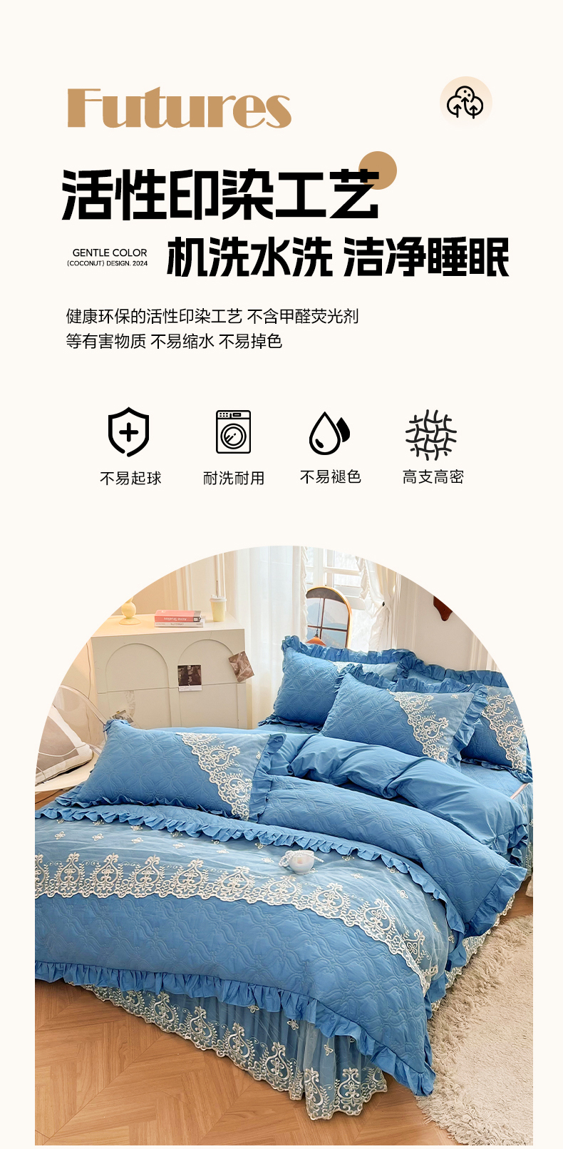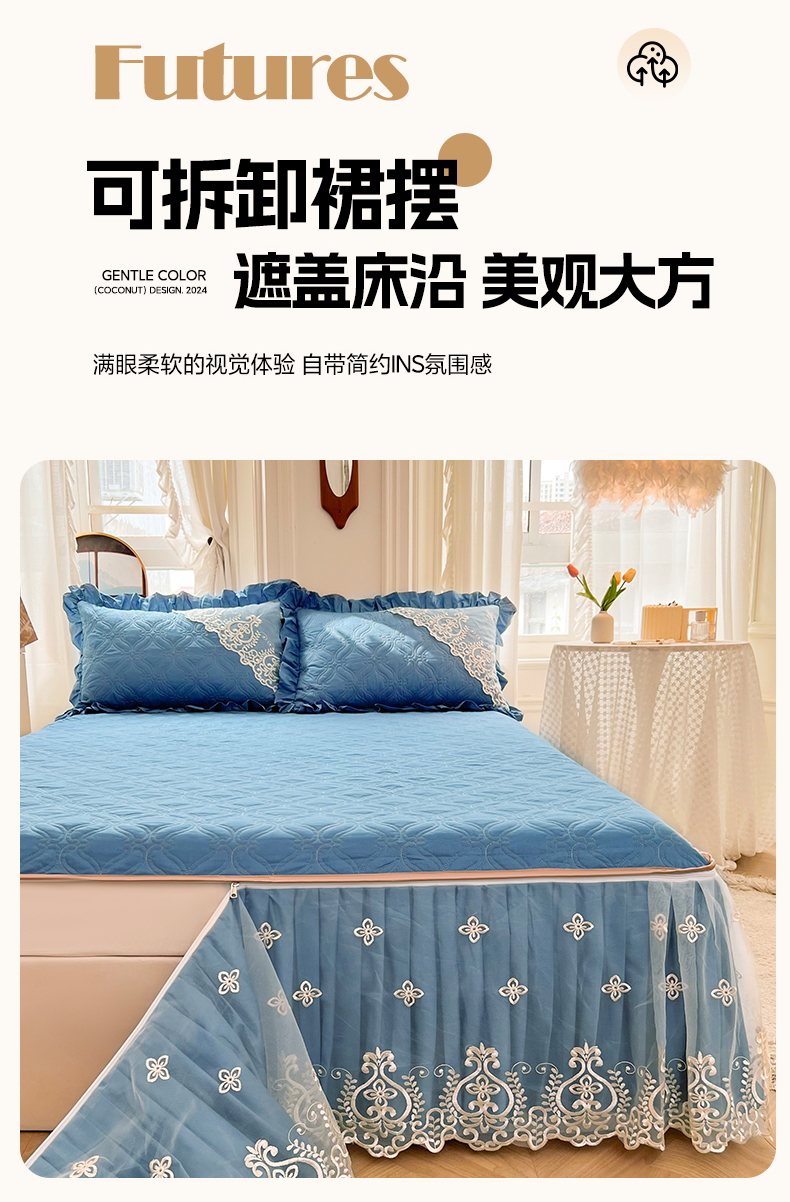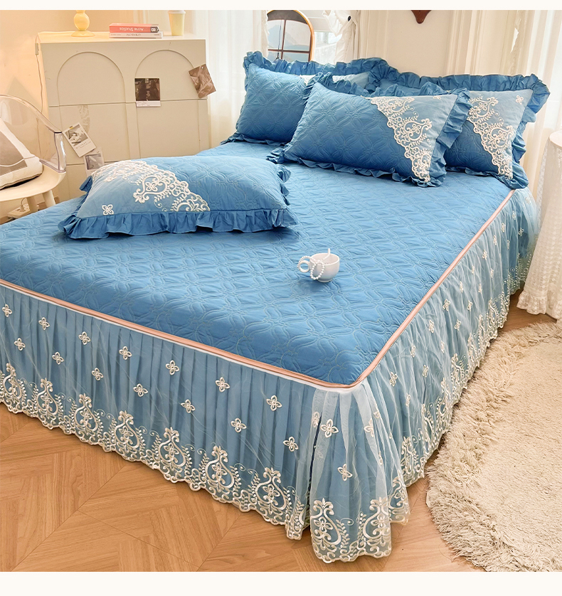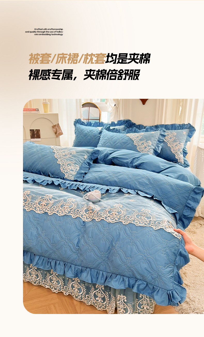 当前位置: 91家纺网 > 商品网购 > 床品套件 > 四件套 > 全棉普通四件套 > 罗艺轩 2024新款公主风全棉加厚可脱卸床笠式床裙四件套 慕雅-牛仔蓝