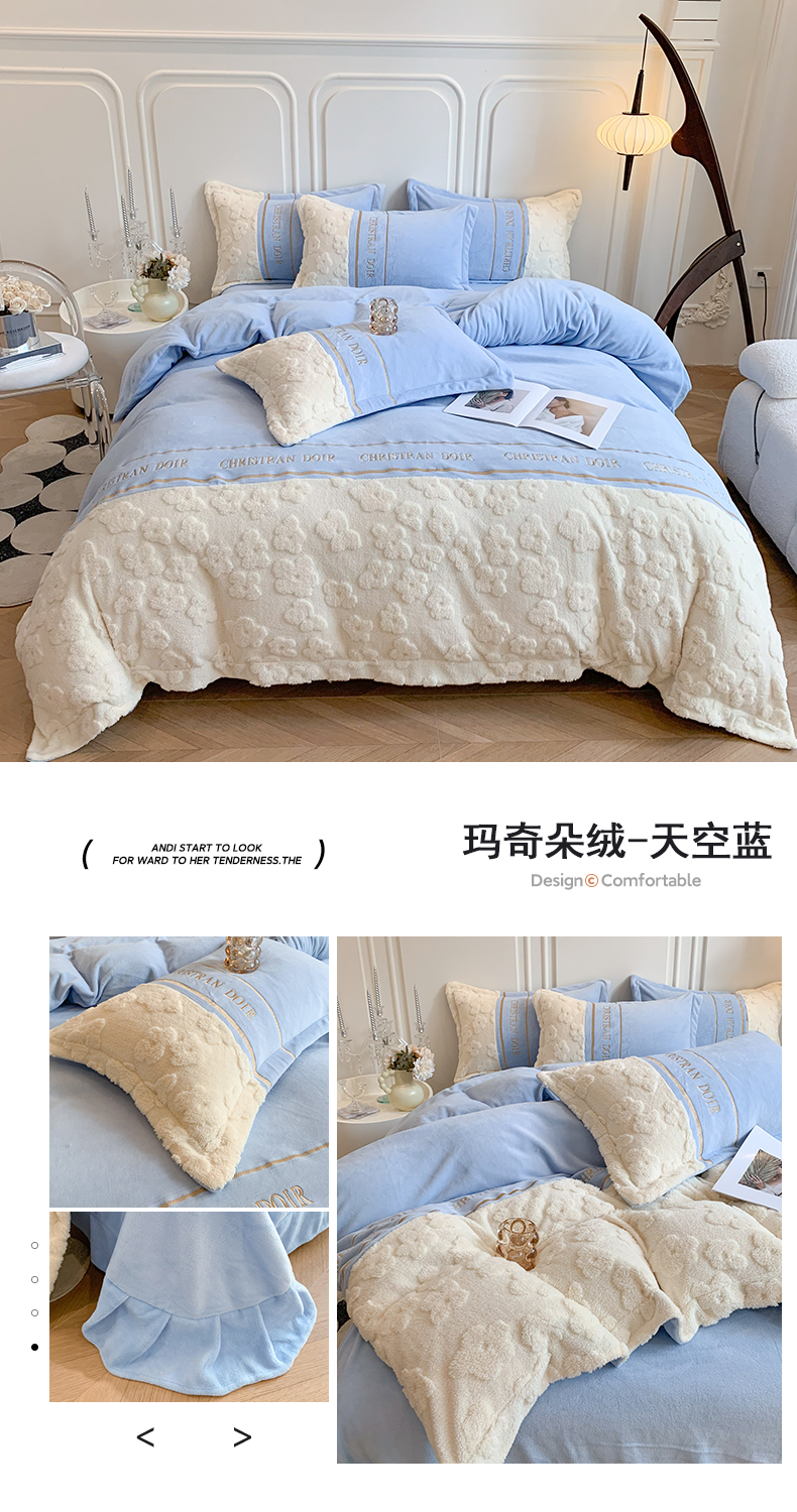 芯贝儿 2024款牛奶绒雕花绒绣花拼接四件套-玛奇朵 玛奇朵--天空蓝