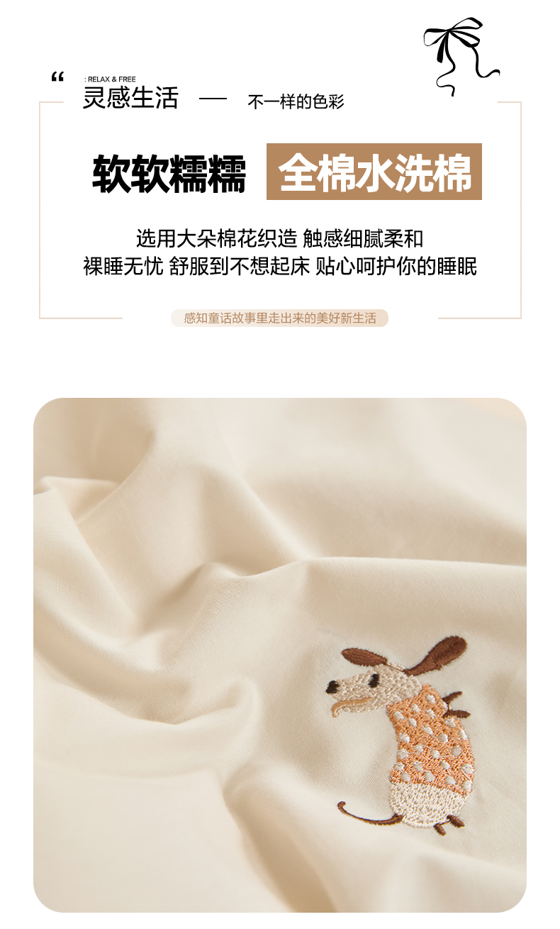 商品名称:如一 2024新款全棉水洗棉刺绣工艺款四件套--风格二 幸运狗-白咖