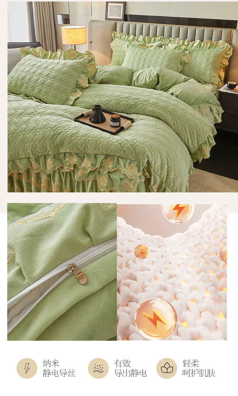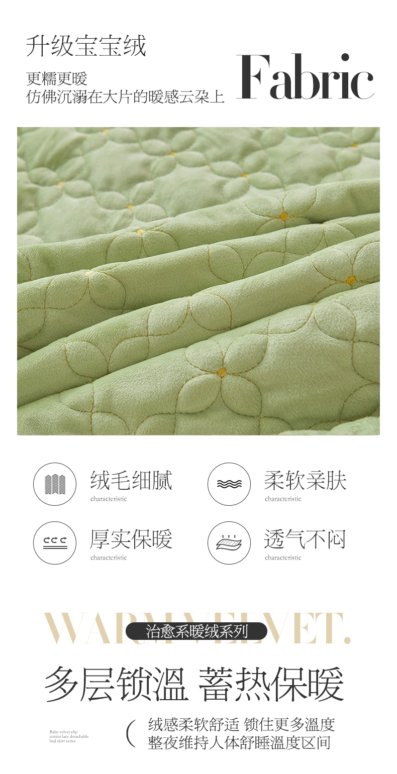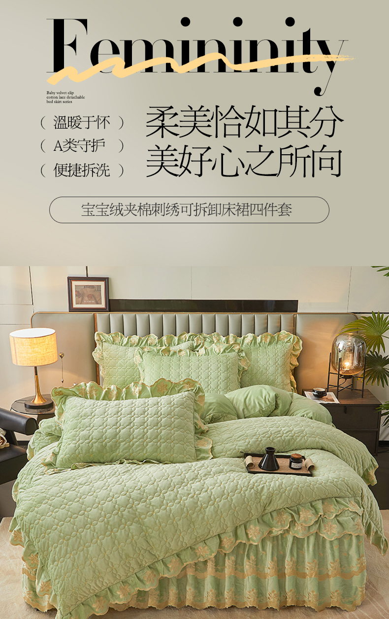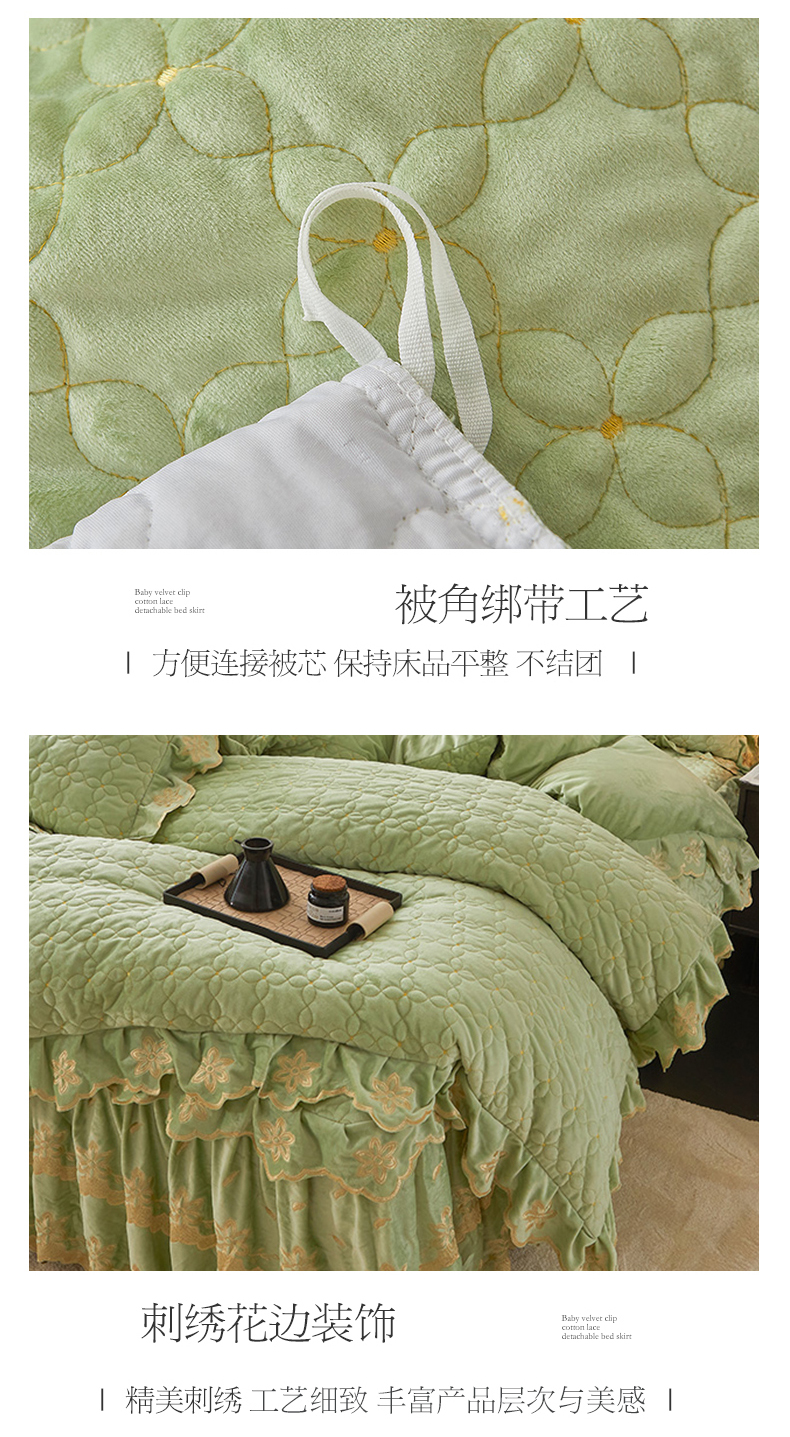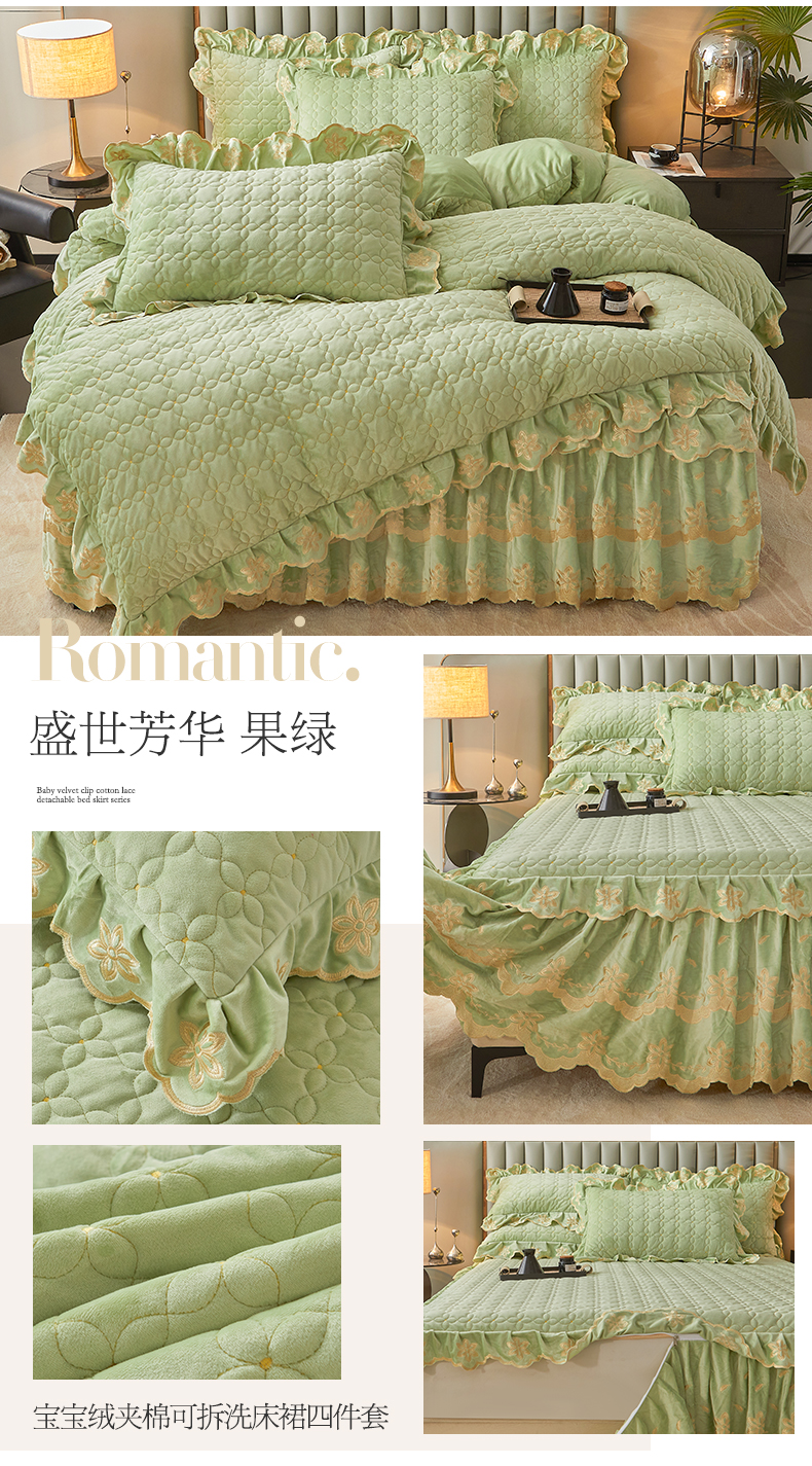 当前位置: 91家纺网 > 商品网购 > 床品套件 > 四件套 > 其它四件套 > 虹星家纺 2024新款可拆卸宝宝绒夹棉床裙三四件套-盛世芳华 盛世芳华 果绿