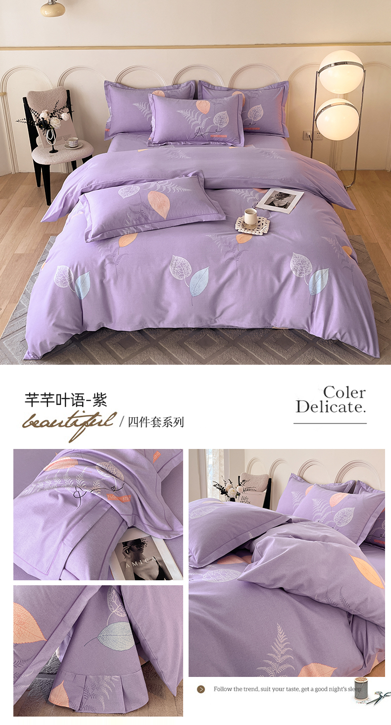 当前位置: 91家纺网 > 商品网购 > 床品套件 > 四件套 > 普通磨毛四件套 > 铭成 2024新款全棉生态喷气加厚磨毛四件套芊芊叶语-紫