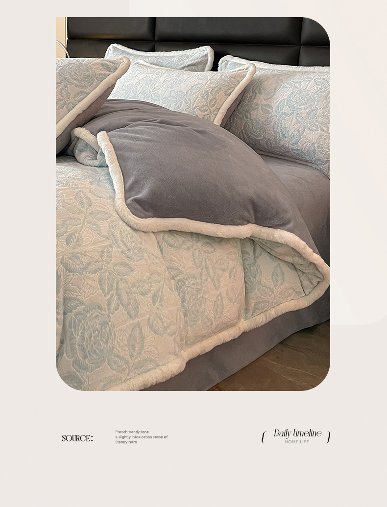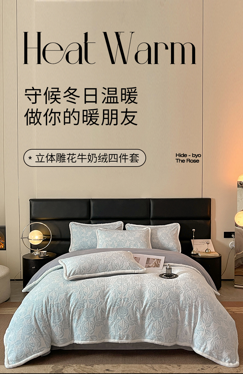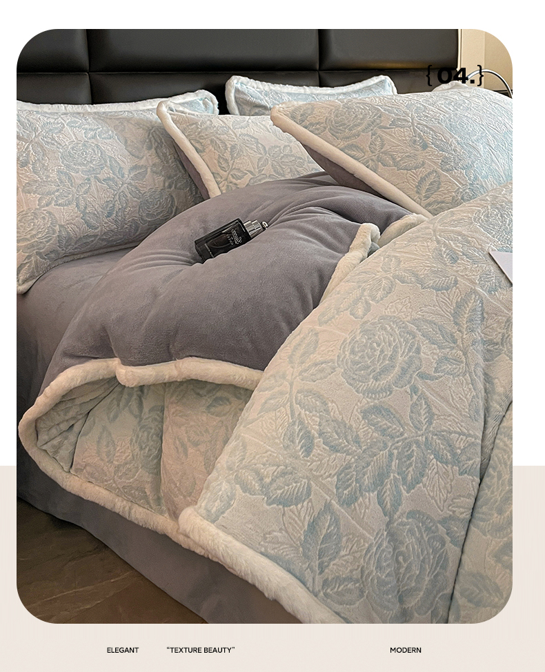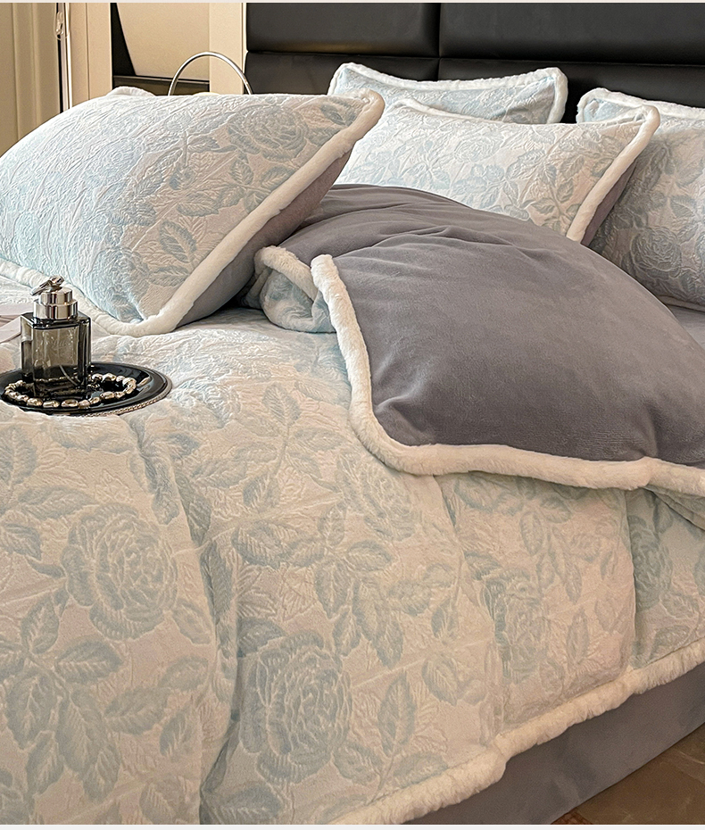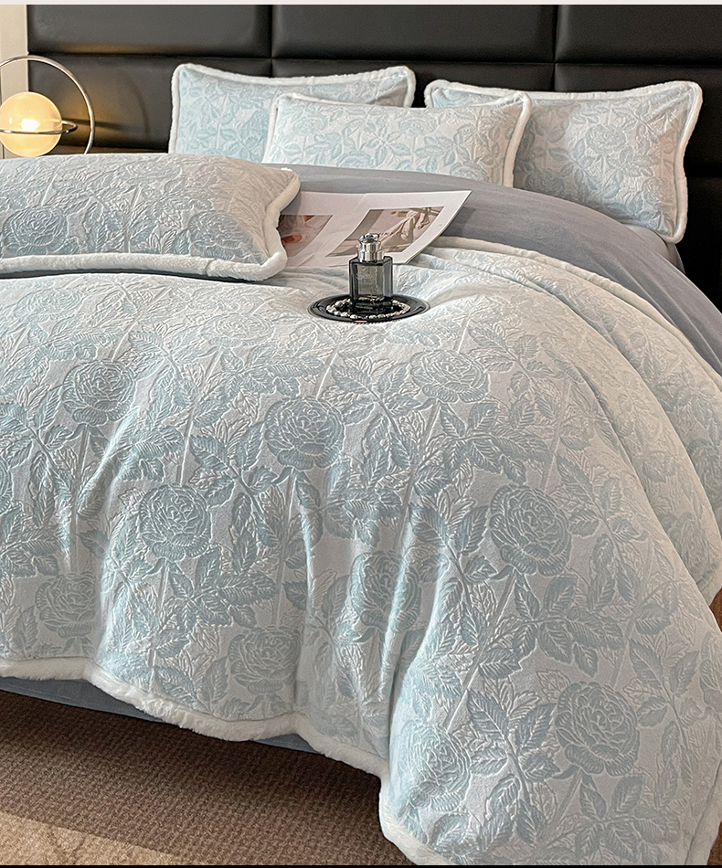 极简 2024新款加厚保暖高克重立体雕花牛奶绒四件套 玫瑰-蓝