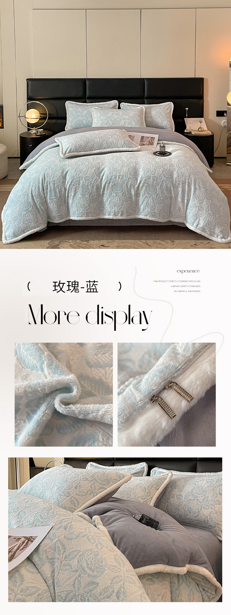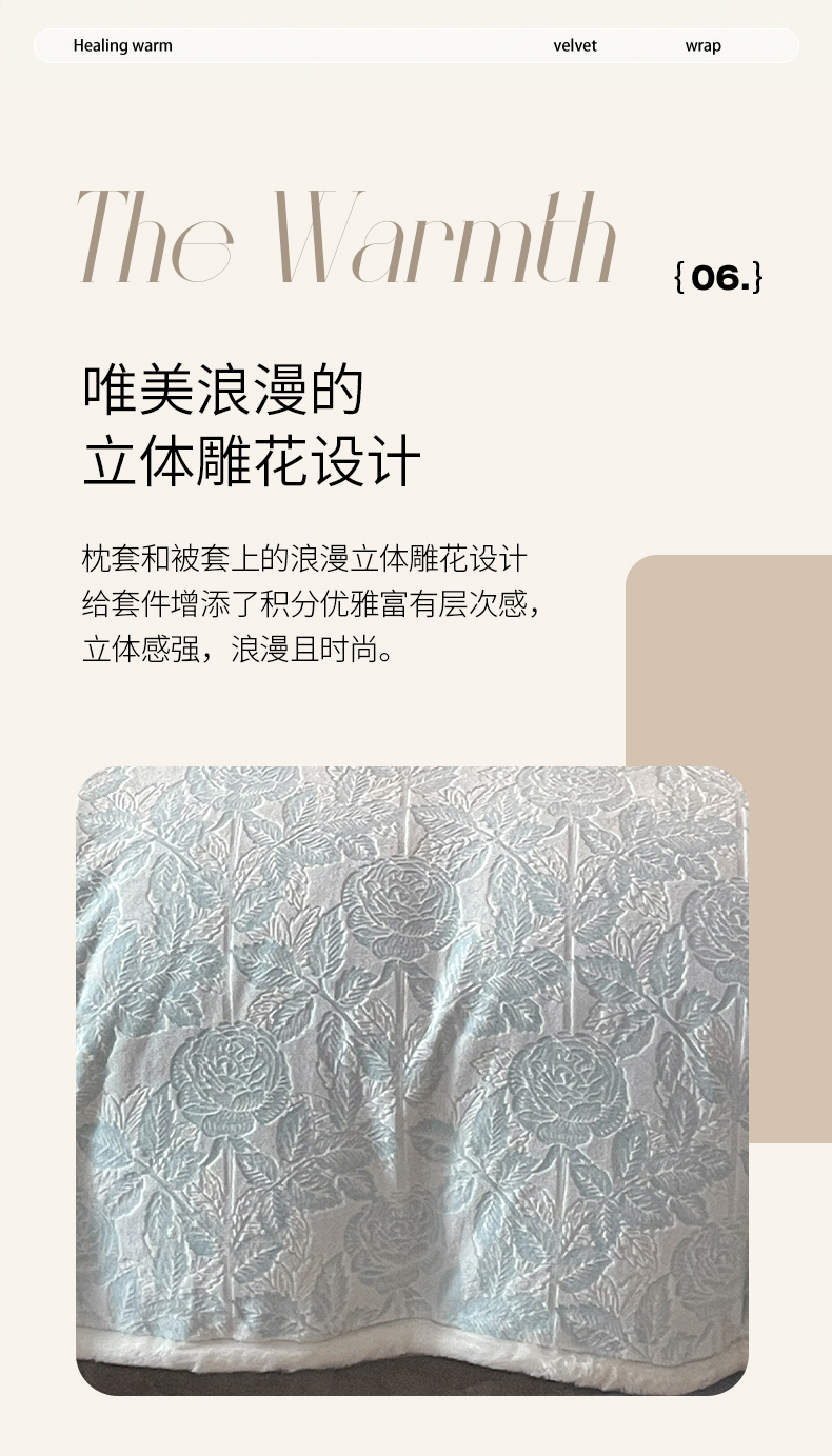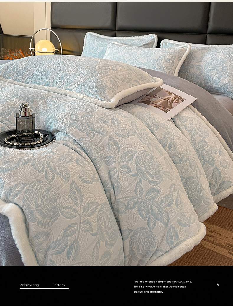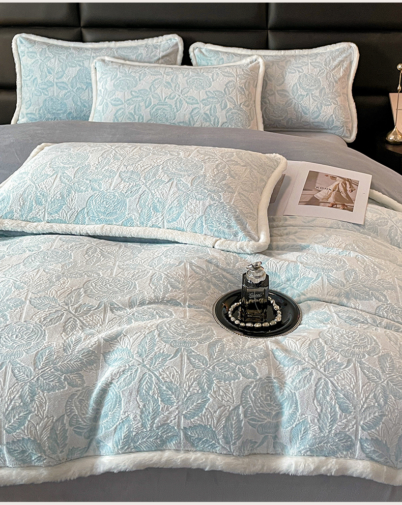 商品名称:极简 2024新款加厚保暖高克重立体雕花牛奶绒四件套 玫瑰-蓝