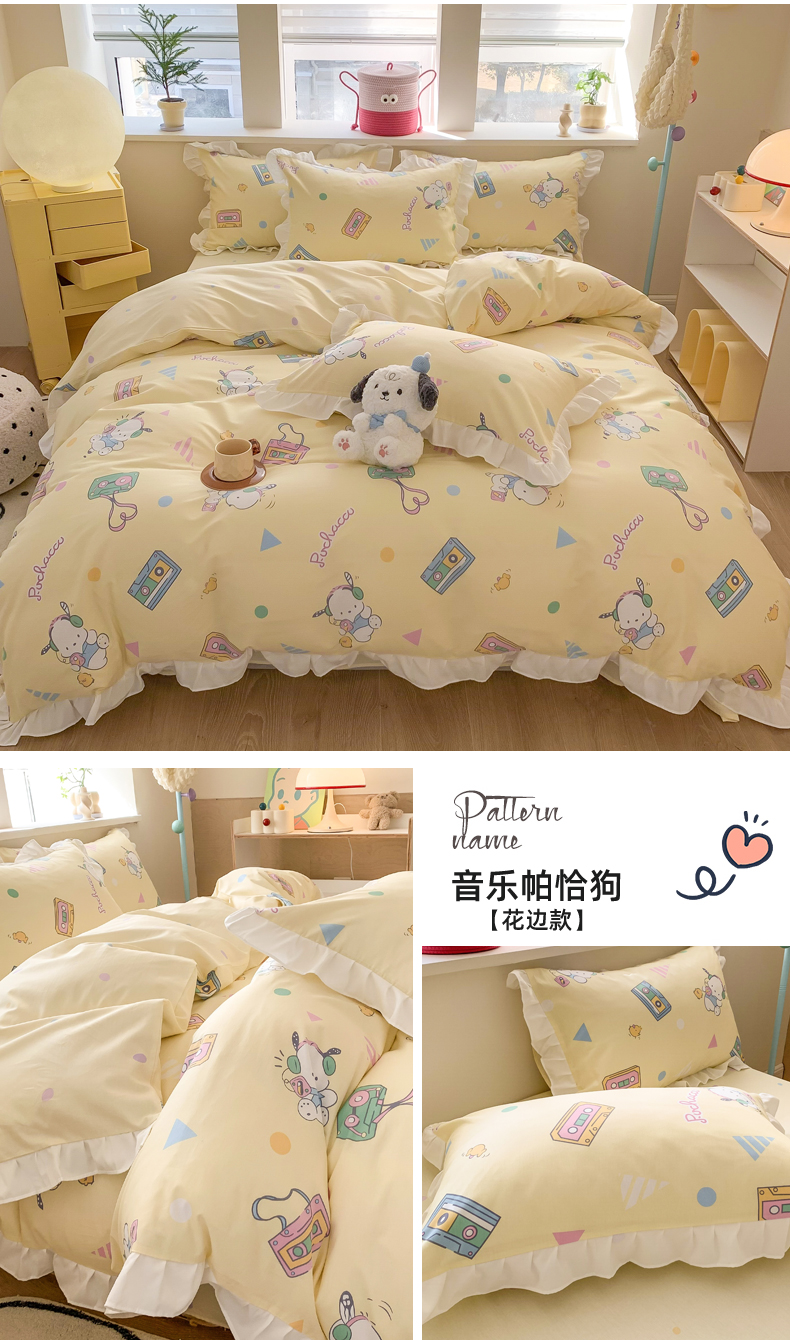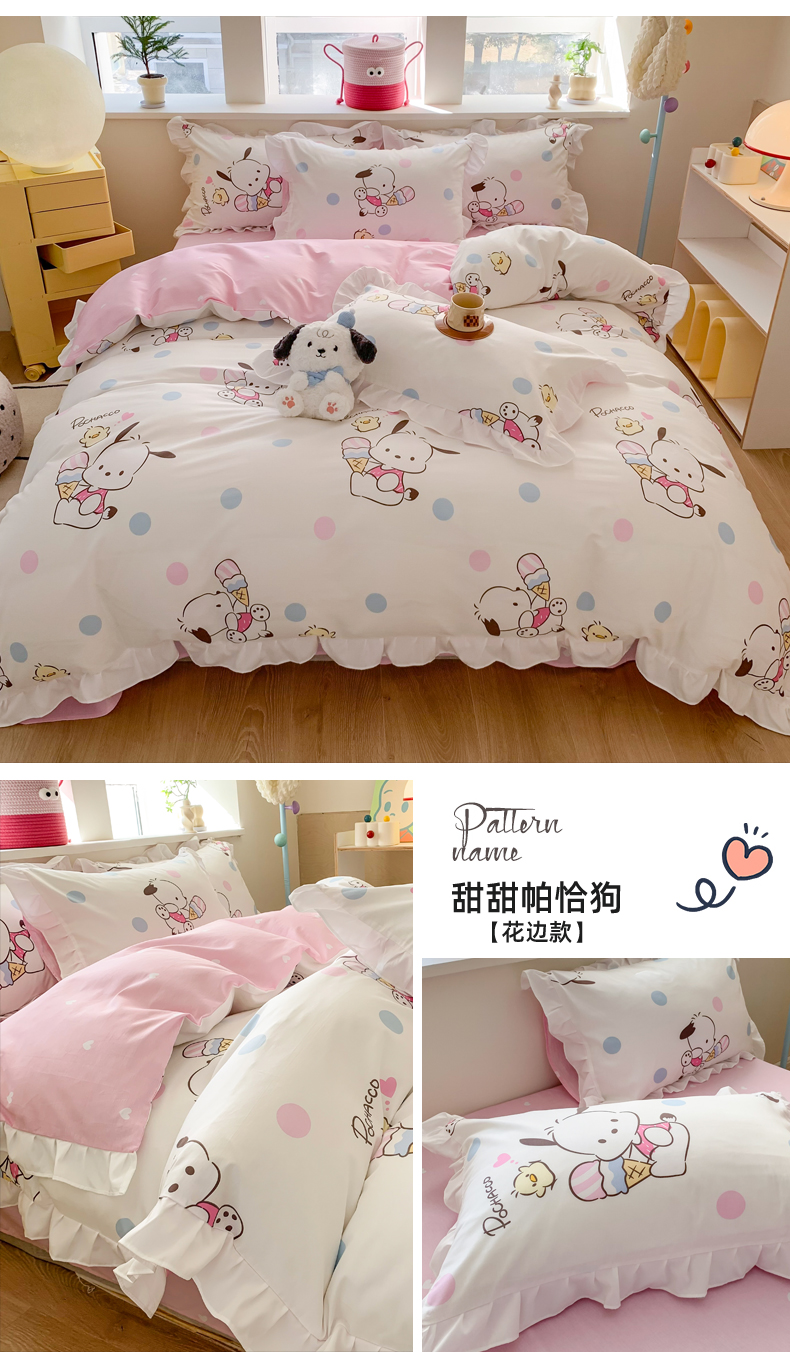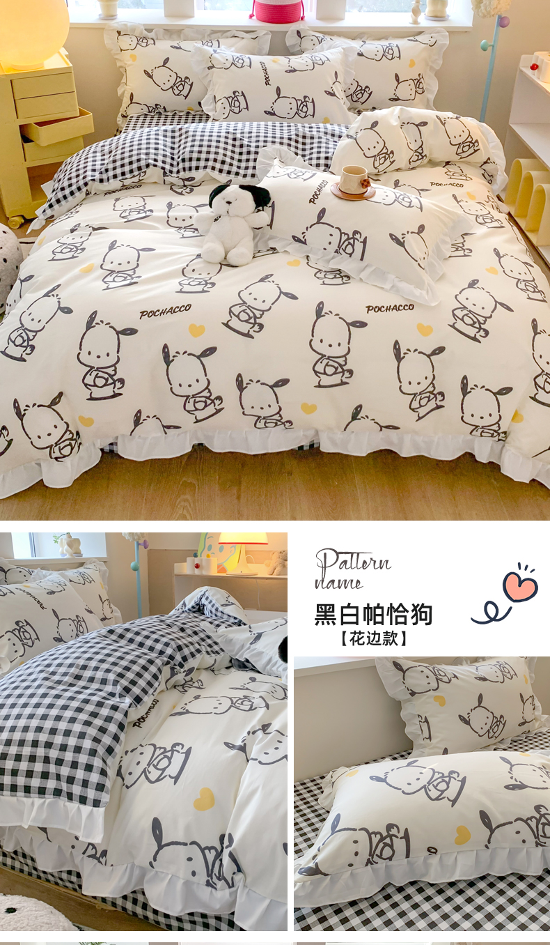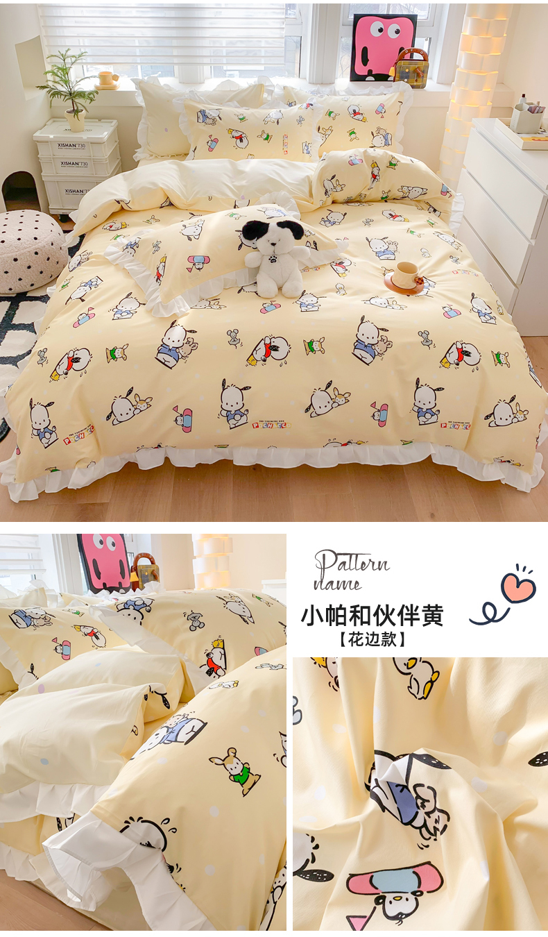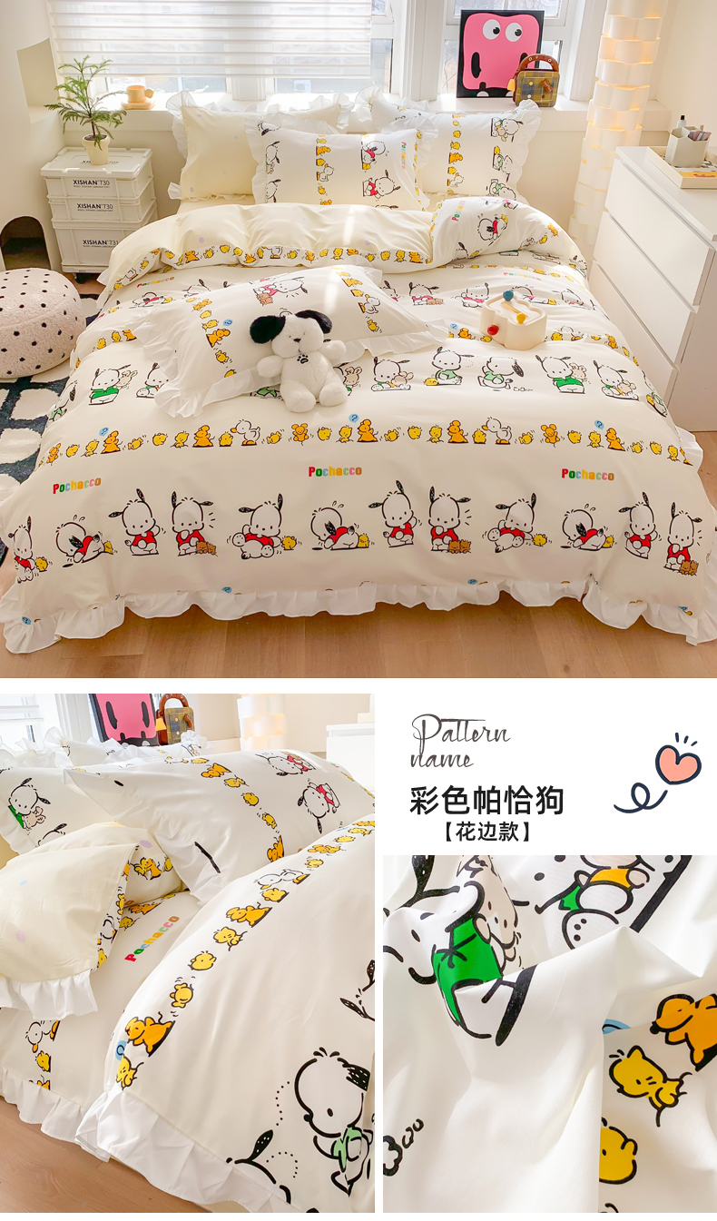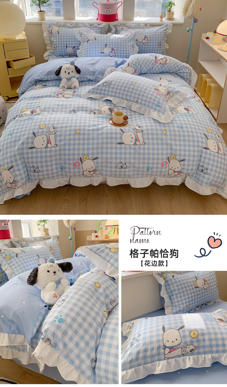 商品名称:(总)玉元坊 2025新款三丽鸥系列白花边被套纯棉全棉床裙三件套四件套-帕恰狗白花边款式