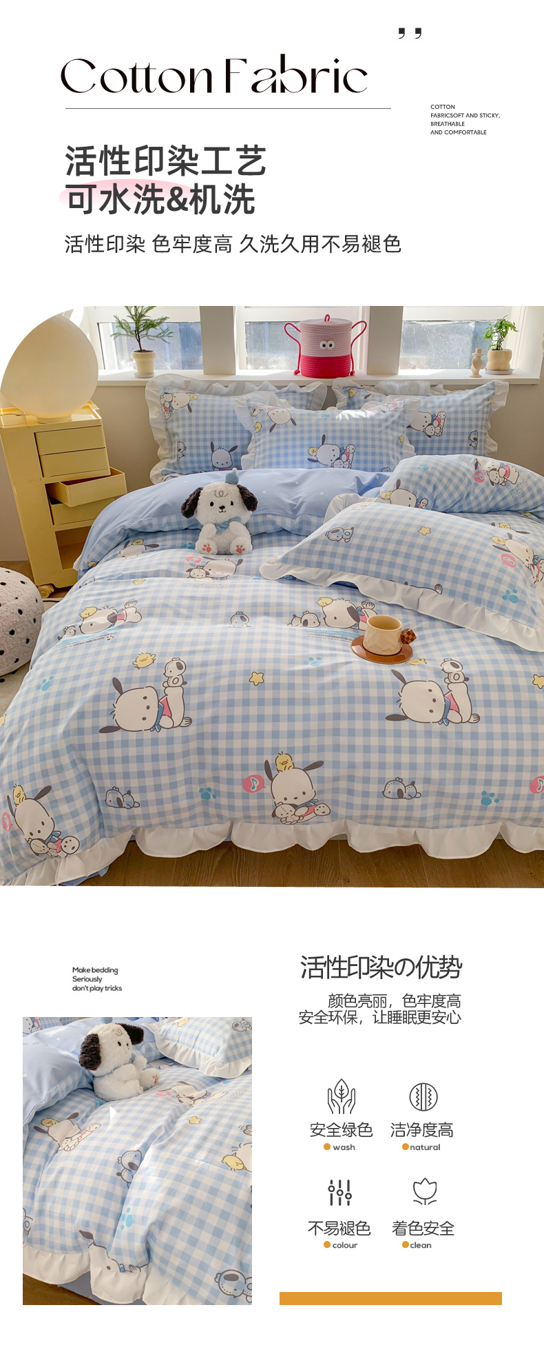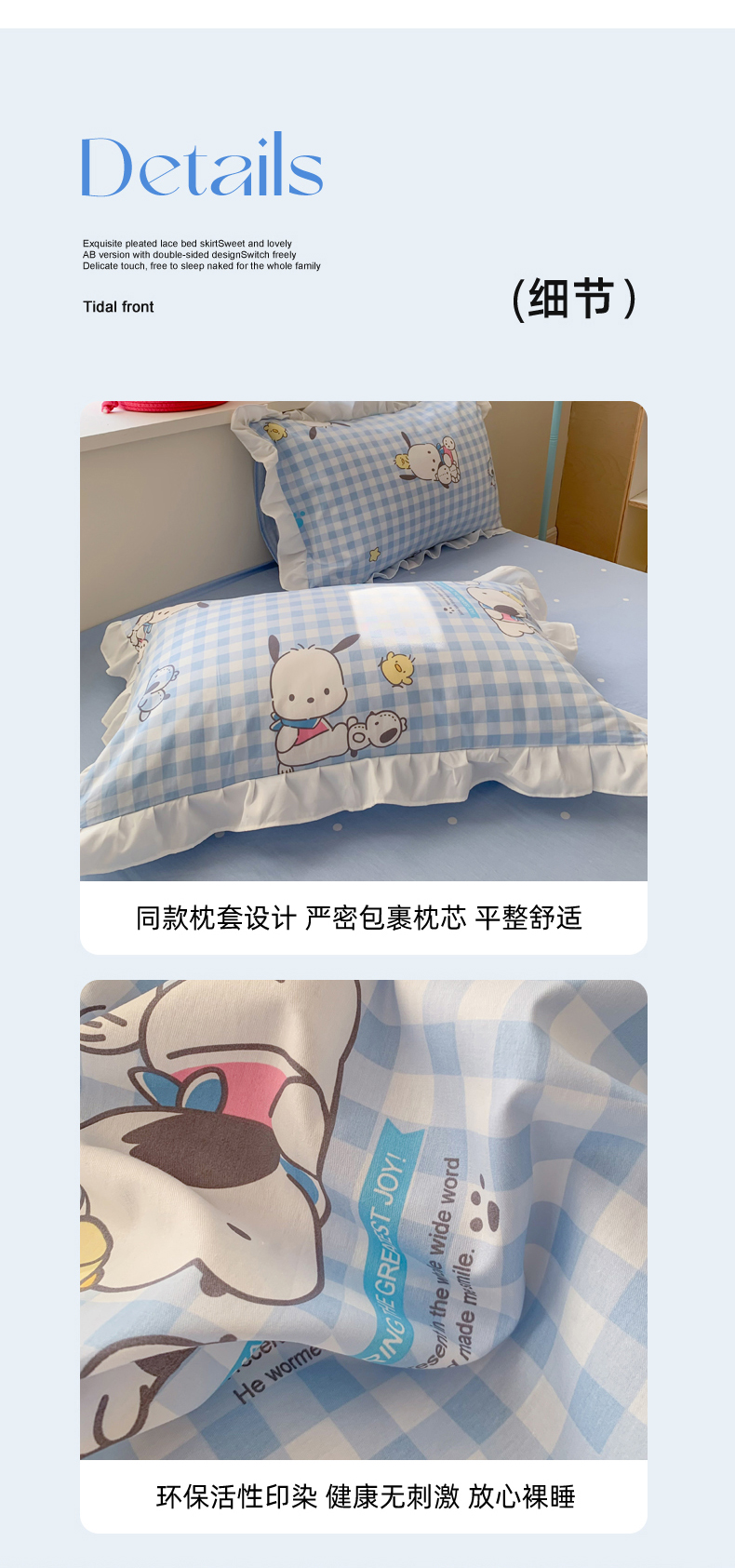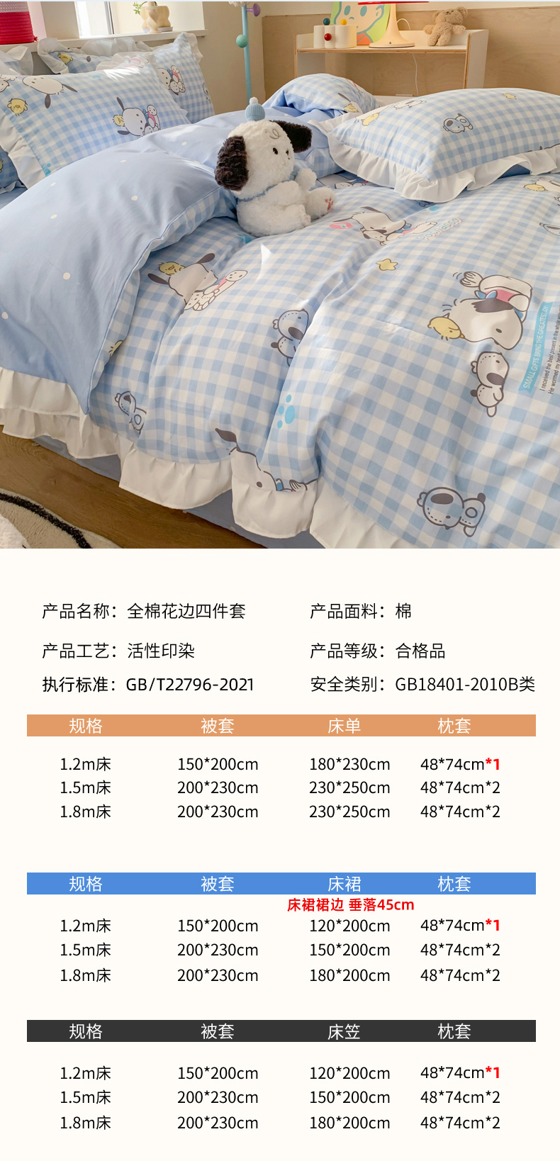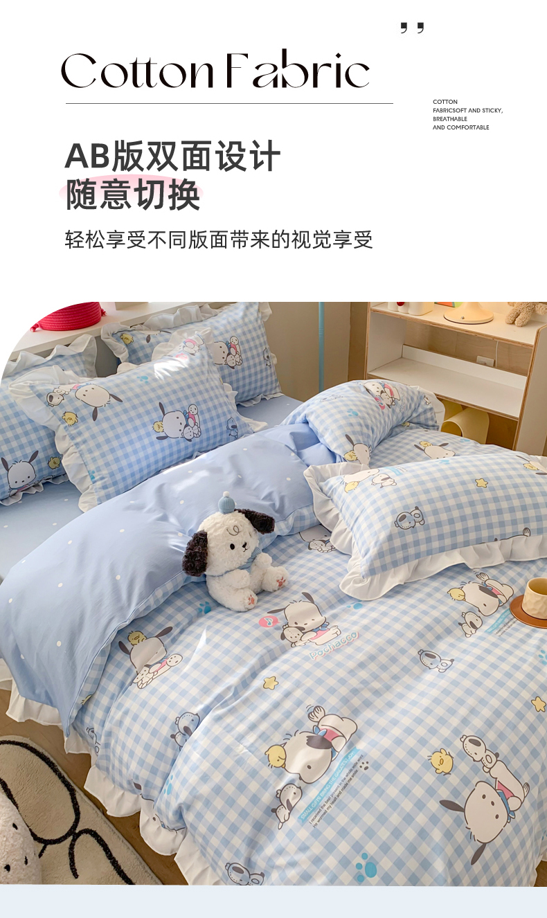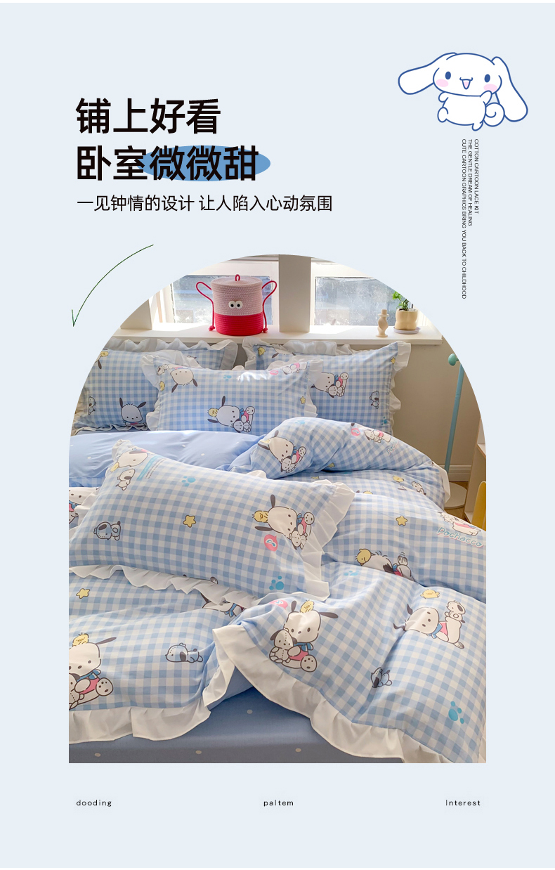 商品名称:(总)玉元坊 2025新款三丽鸥系列白花边被套纯棉全棉床裙三件套四件套-帕恰狗白花边款式