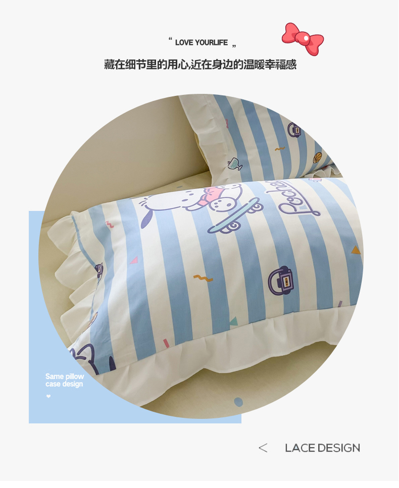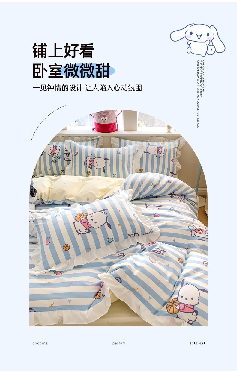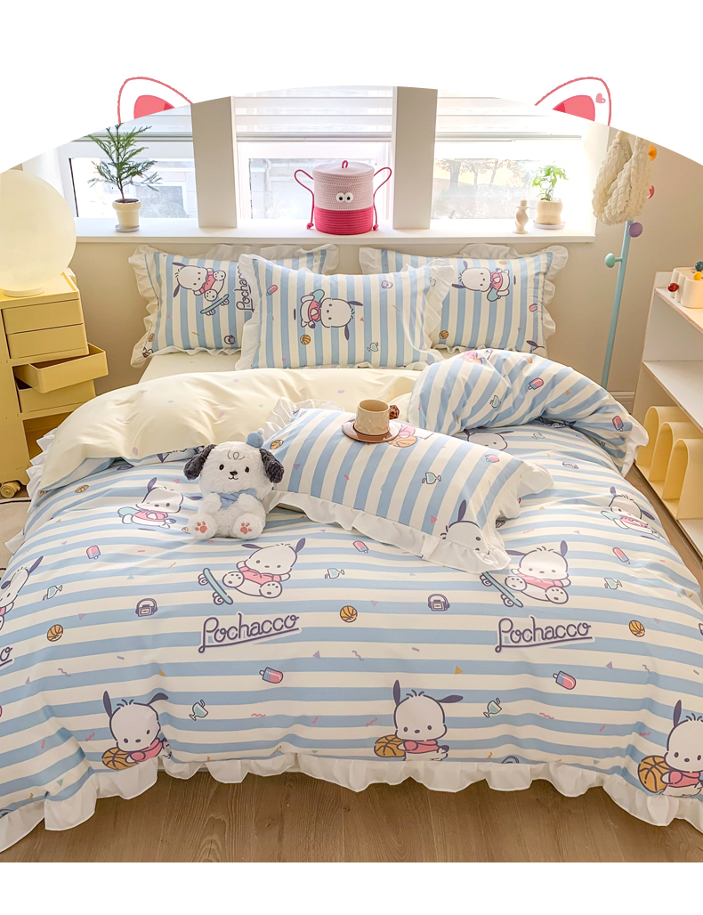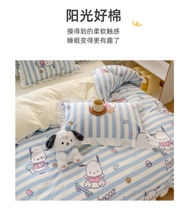 当前位置: 91家纺网 > 商品网购 > 床品套件 > 四件套 > 全棉普通四件套 > 玉元坊 2025新款三丽鸥系列白花边被套纯棉全棉床裙三件套四件套-帕恰狗白花边款式 条纹帕恰狗【花边款式】