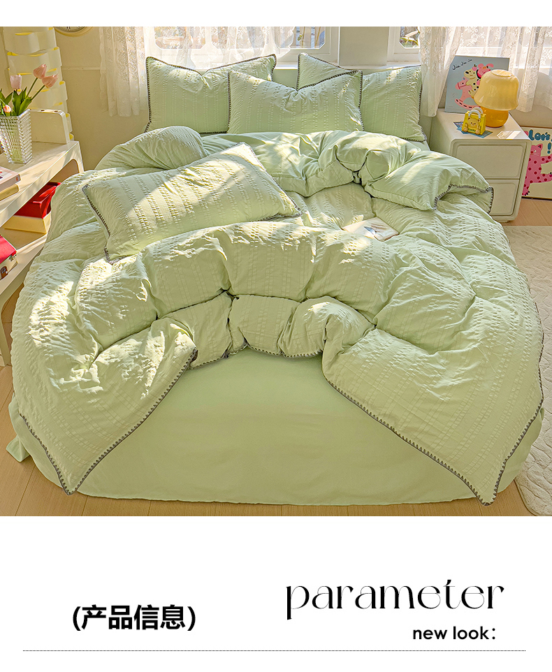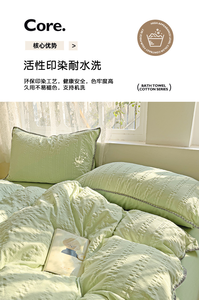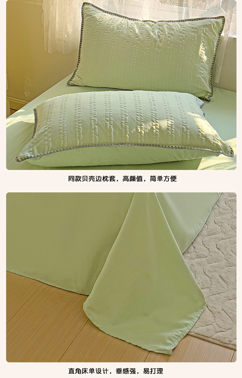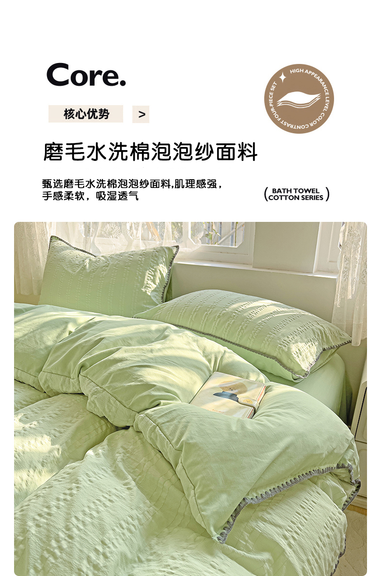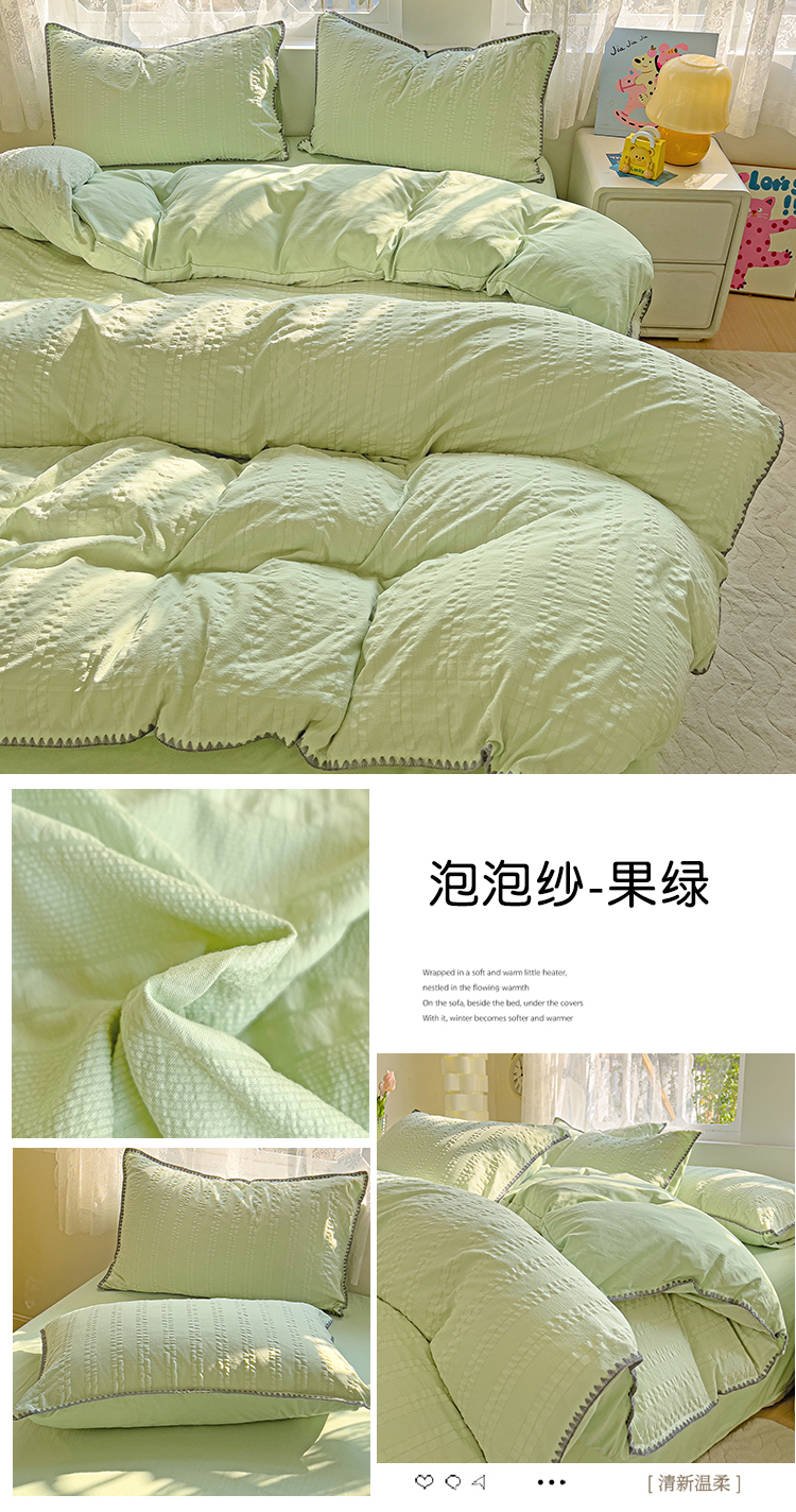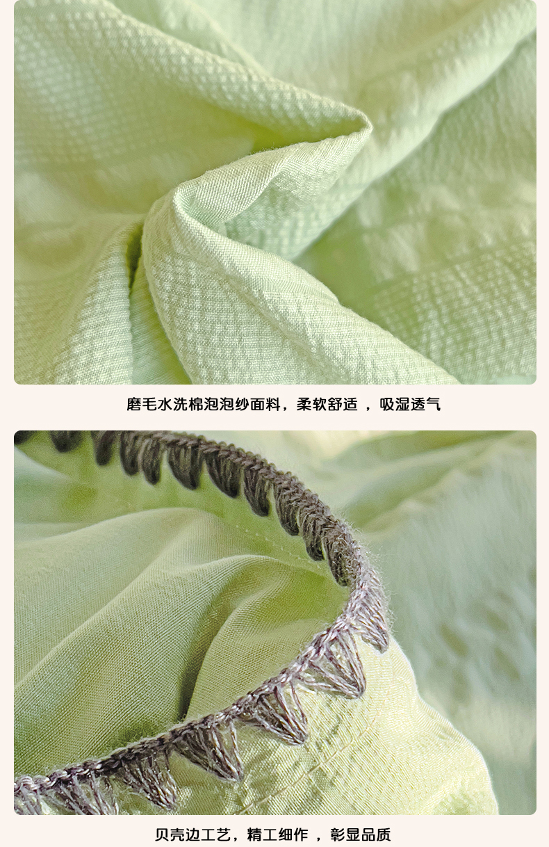 商品名称:娜娜 2025新款磨毛水洗棉泡泡纱贝壳边四件套 泡泡纱-果绿