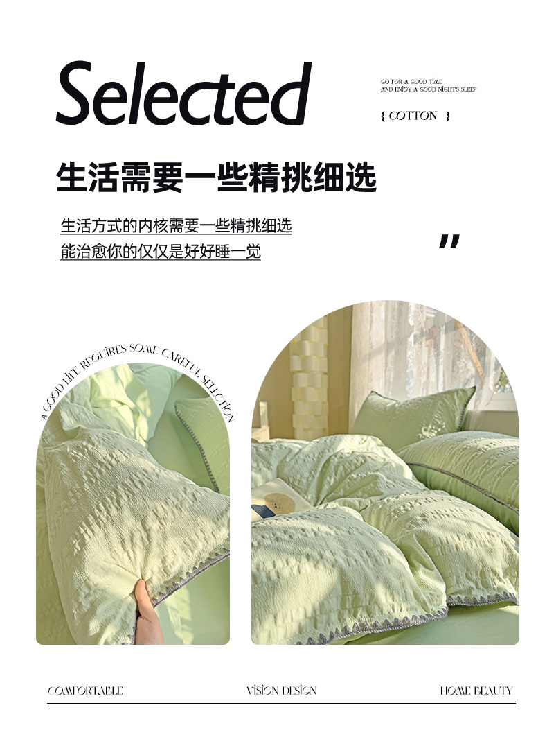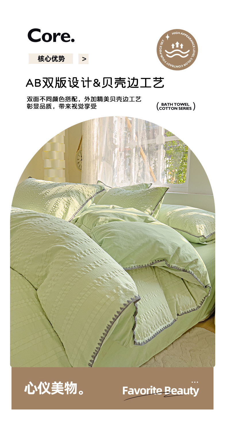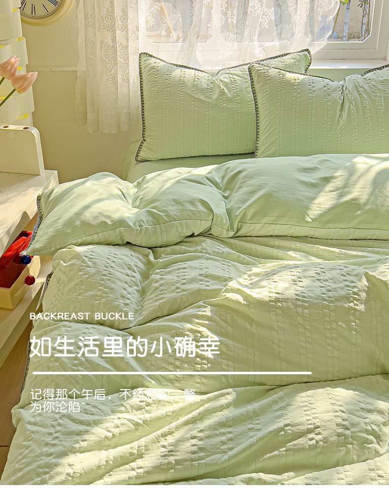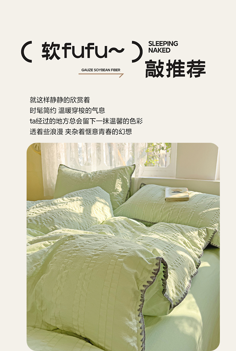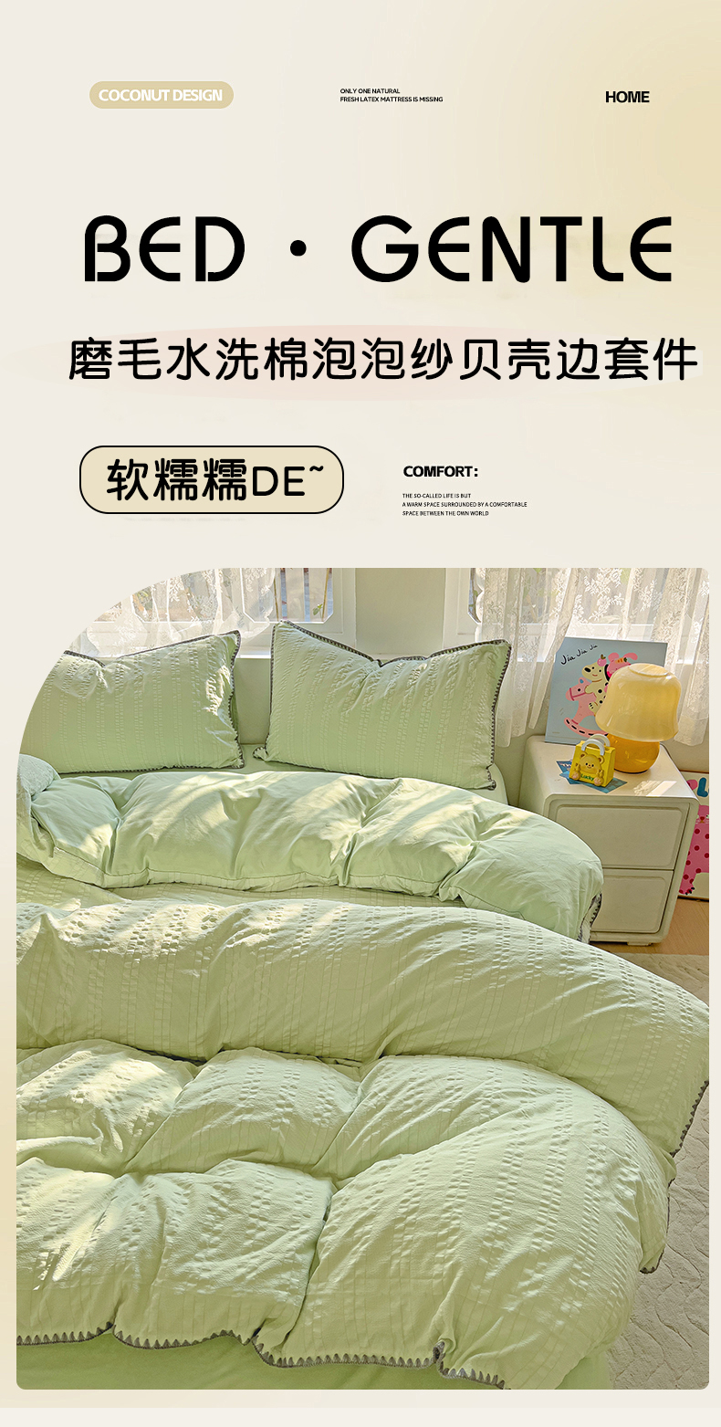 商品名称:娜娜 2025新款磨毛水洗棉泡泡纱贝壳边四件套 泡泡纱-果绿