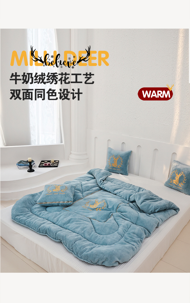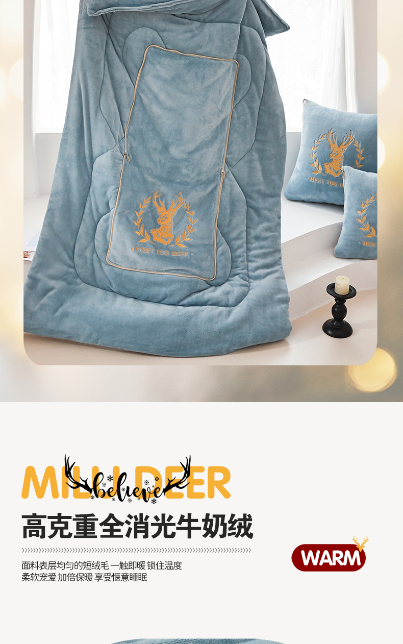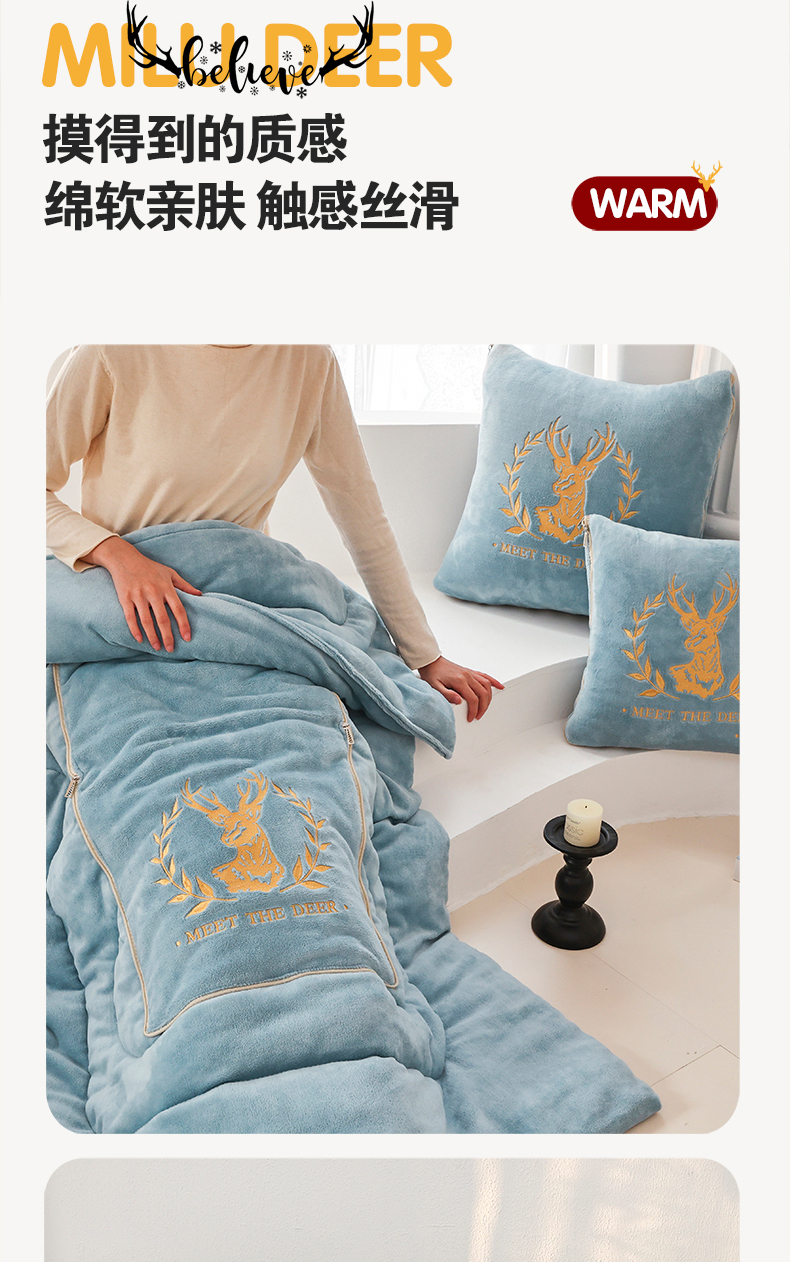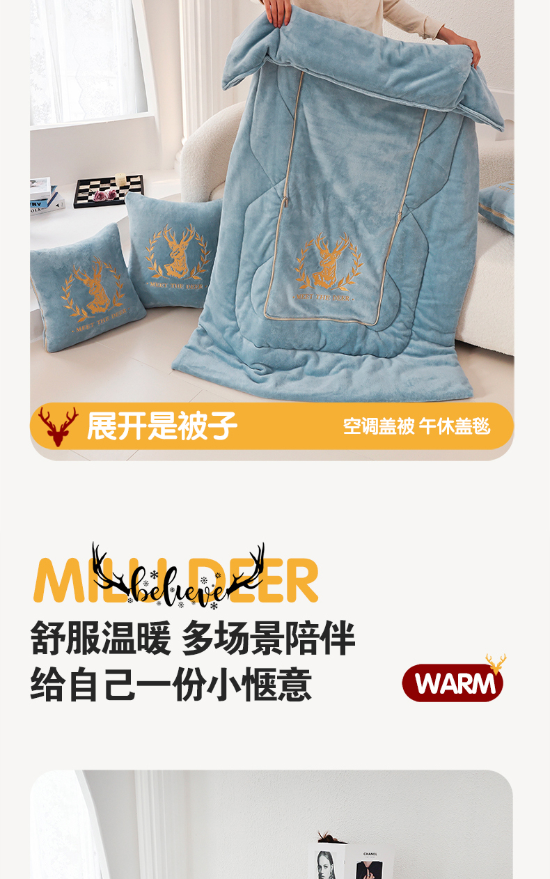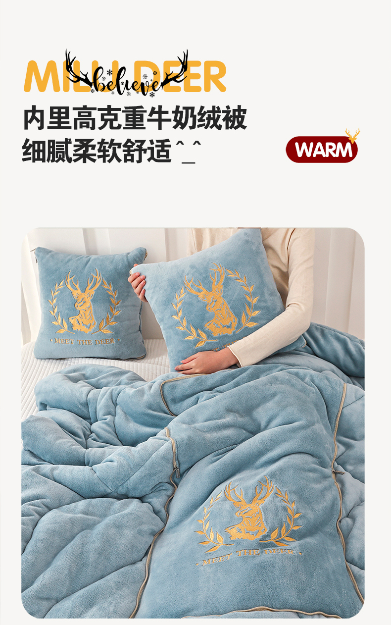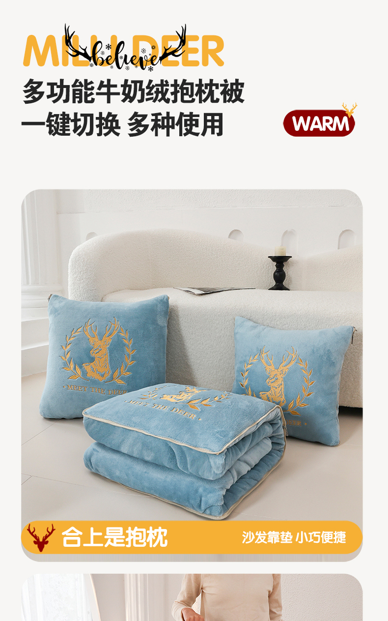 商品名称:番茄+ 2025新款牛奶绒抱枕被-有鹿亦有路系列 晴山蓝