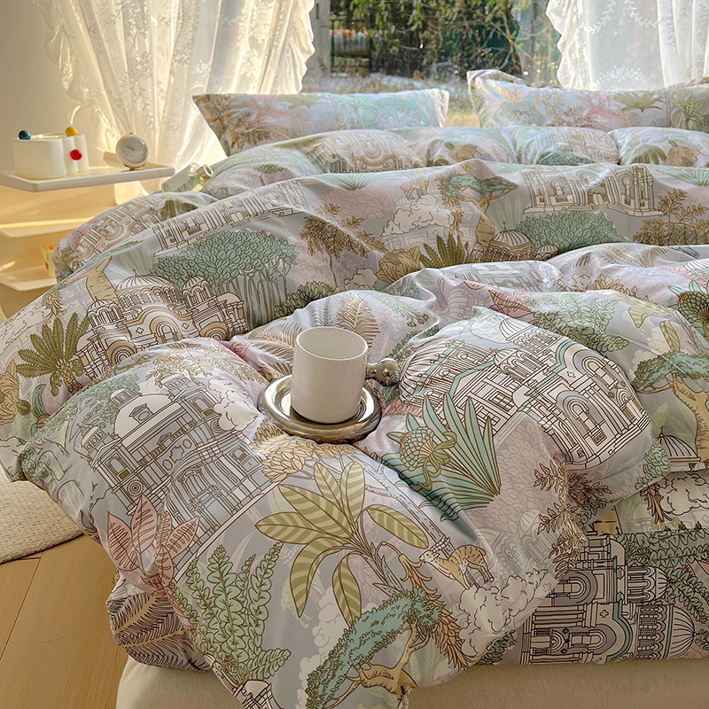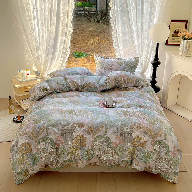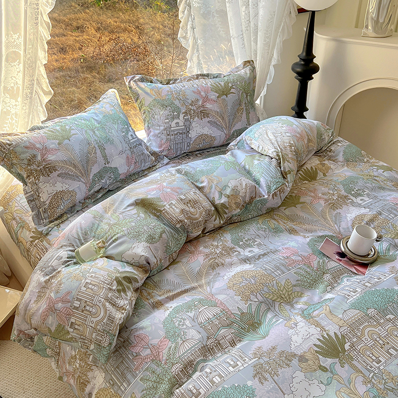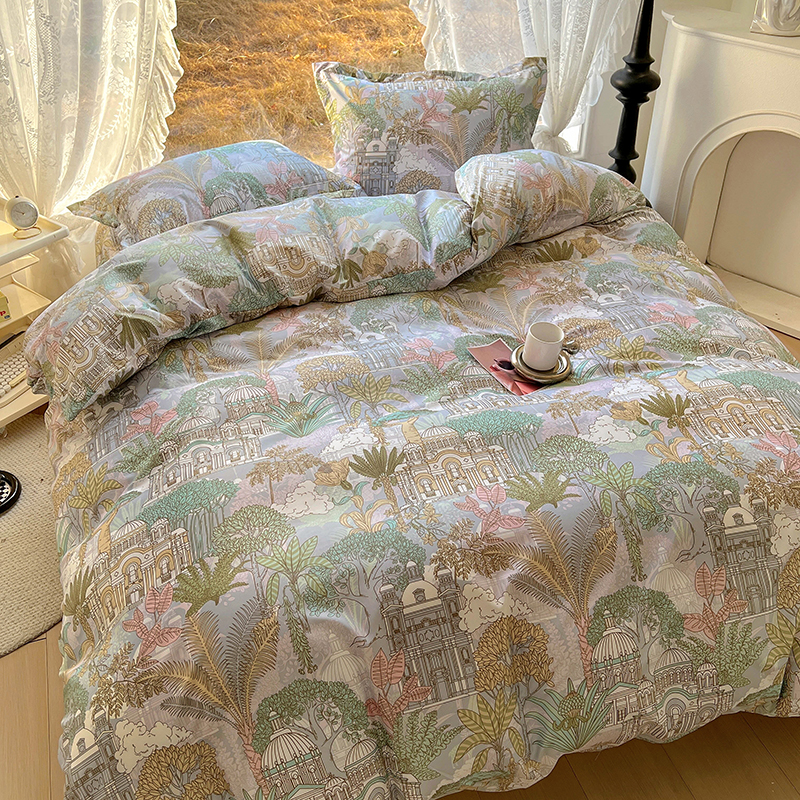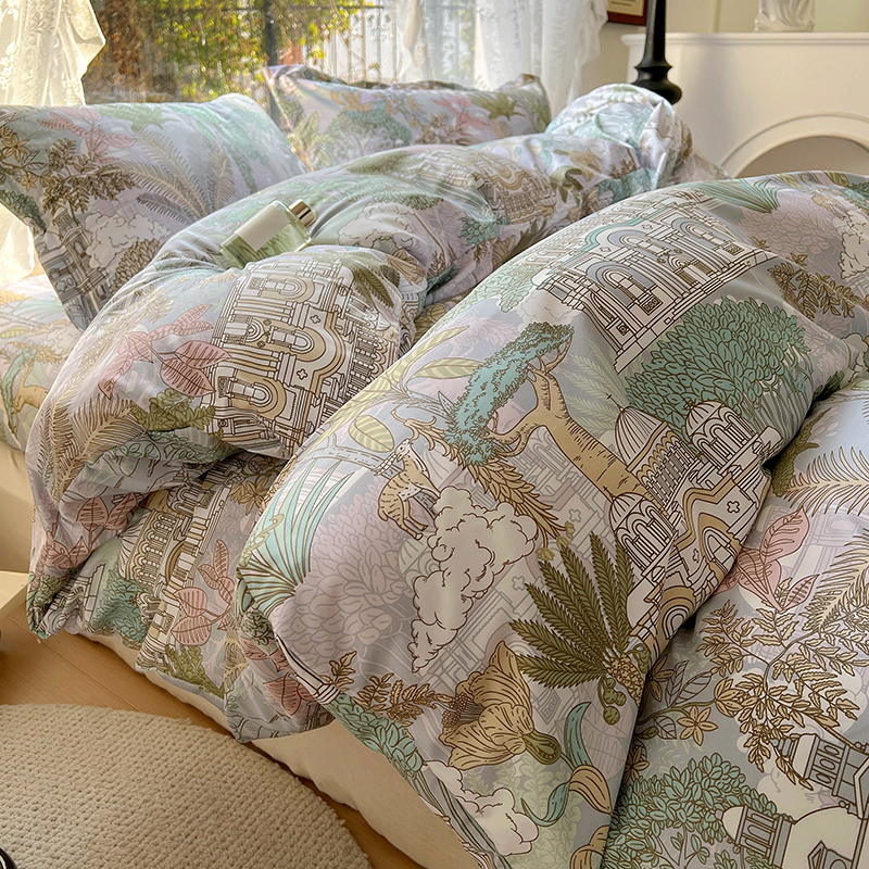 耀悦家纺 2025新款水洗真丝四件套简约印花小清新欧式ins新中式冰丝四件套 陌卡庄园